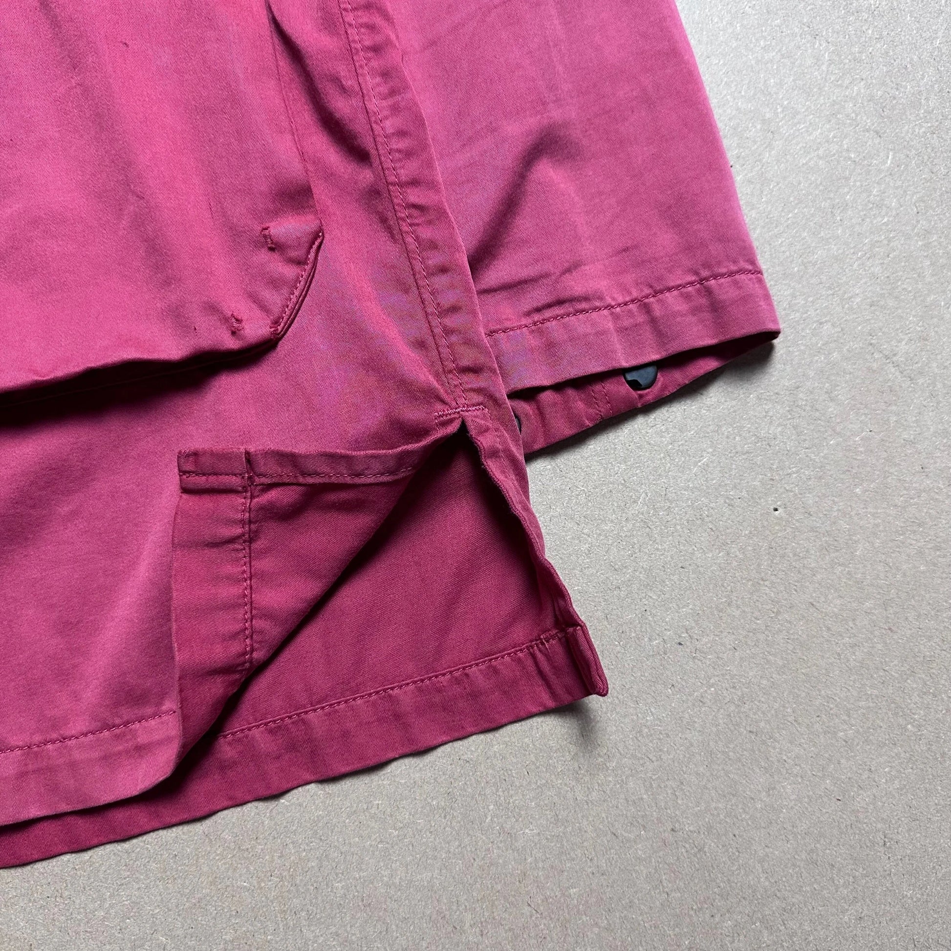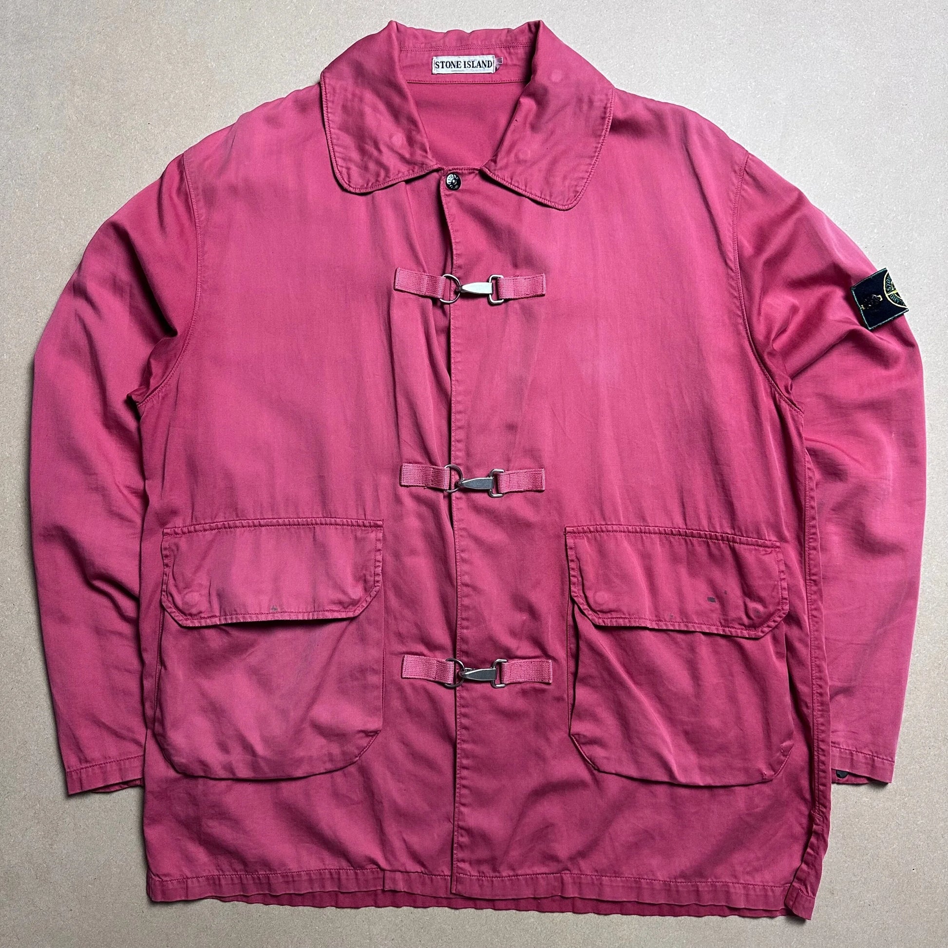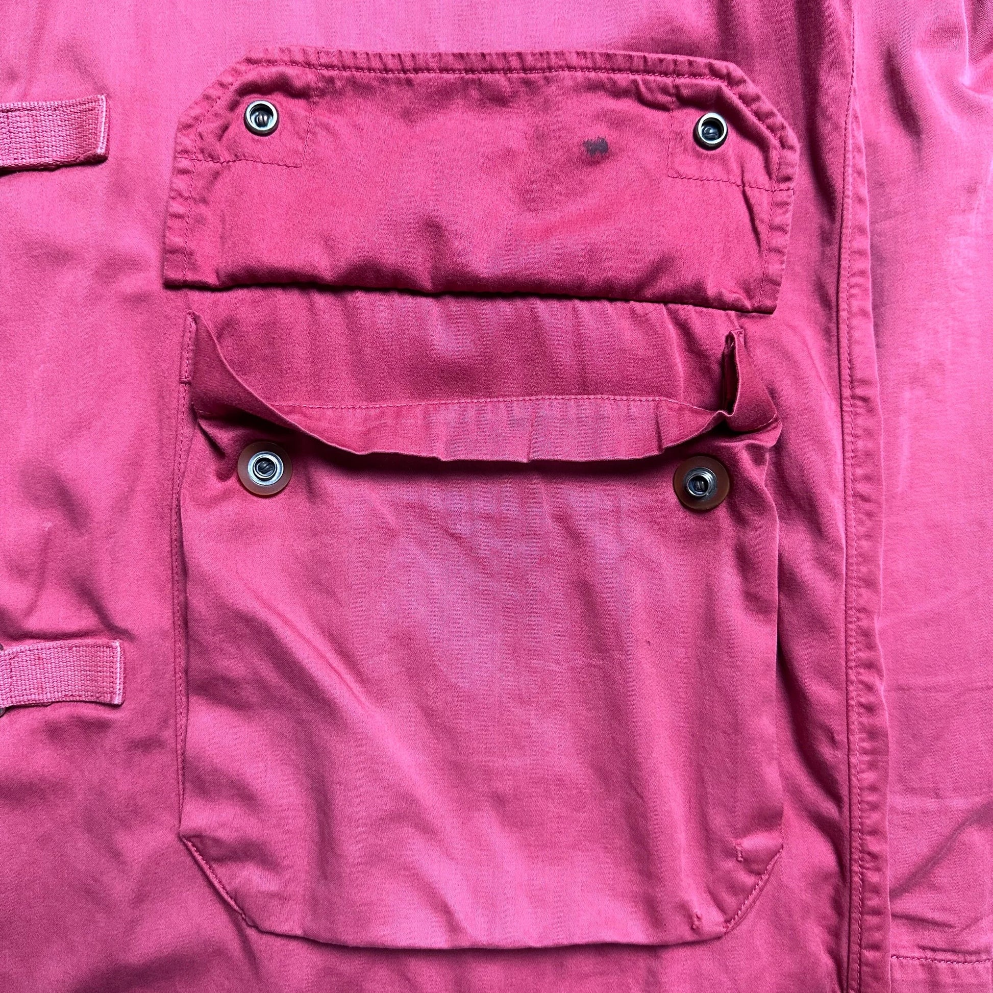 Designed by Massimo Osti. Hook clip closure coach jacket produced in Raso Gommato finished in a Coral colour way. Two lower cargo pockets with press stud flap closure. Split hem. Press stud fasten able cuffs. Stainless steel hook clips and rings.
