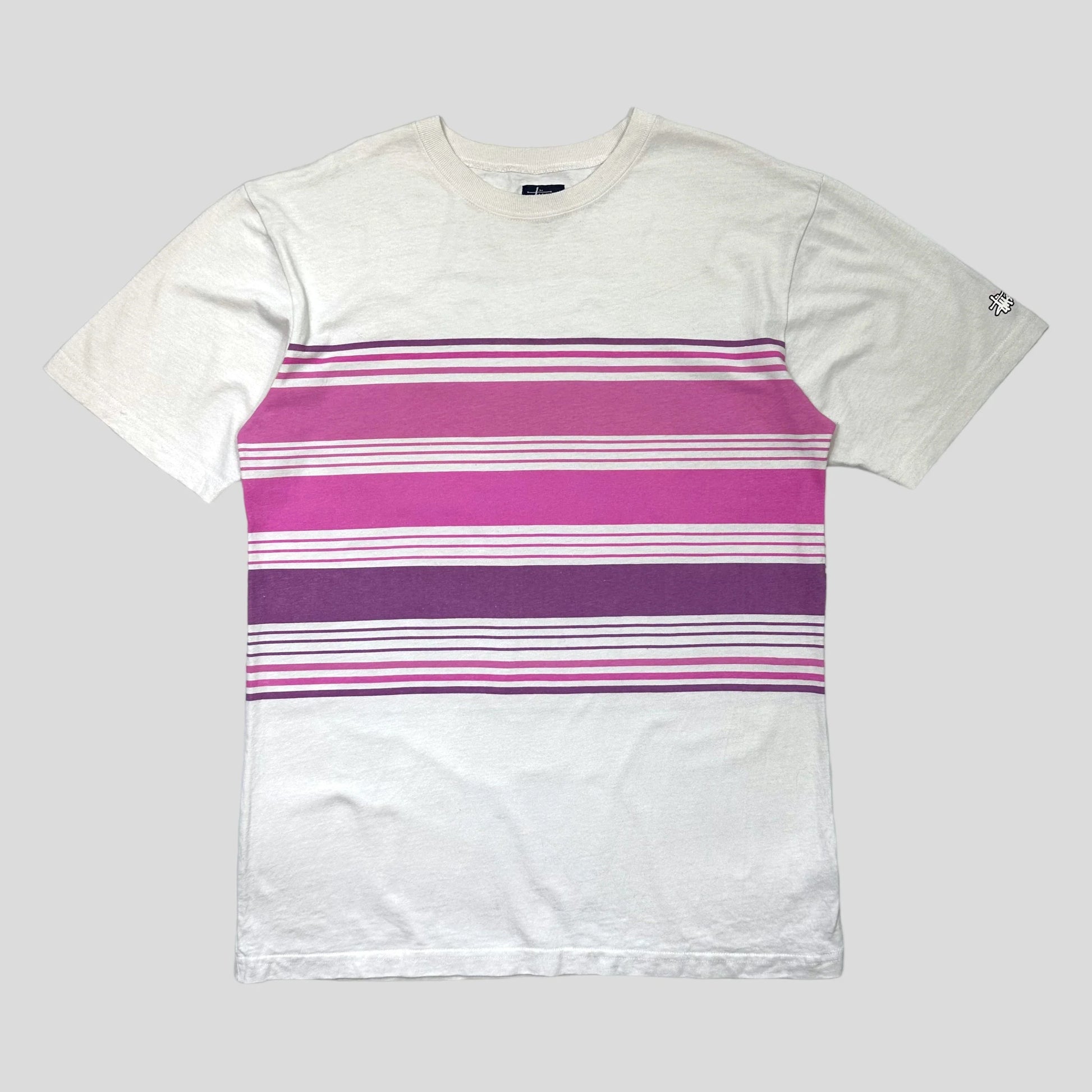 Stussy rare late 1990’s thick cotton t-shirt, lovely stock logo hit on the arm with purple and pink stripes across the front and back.