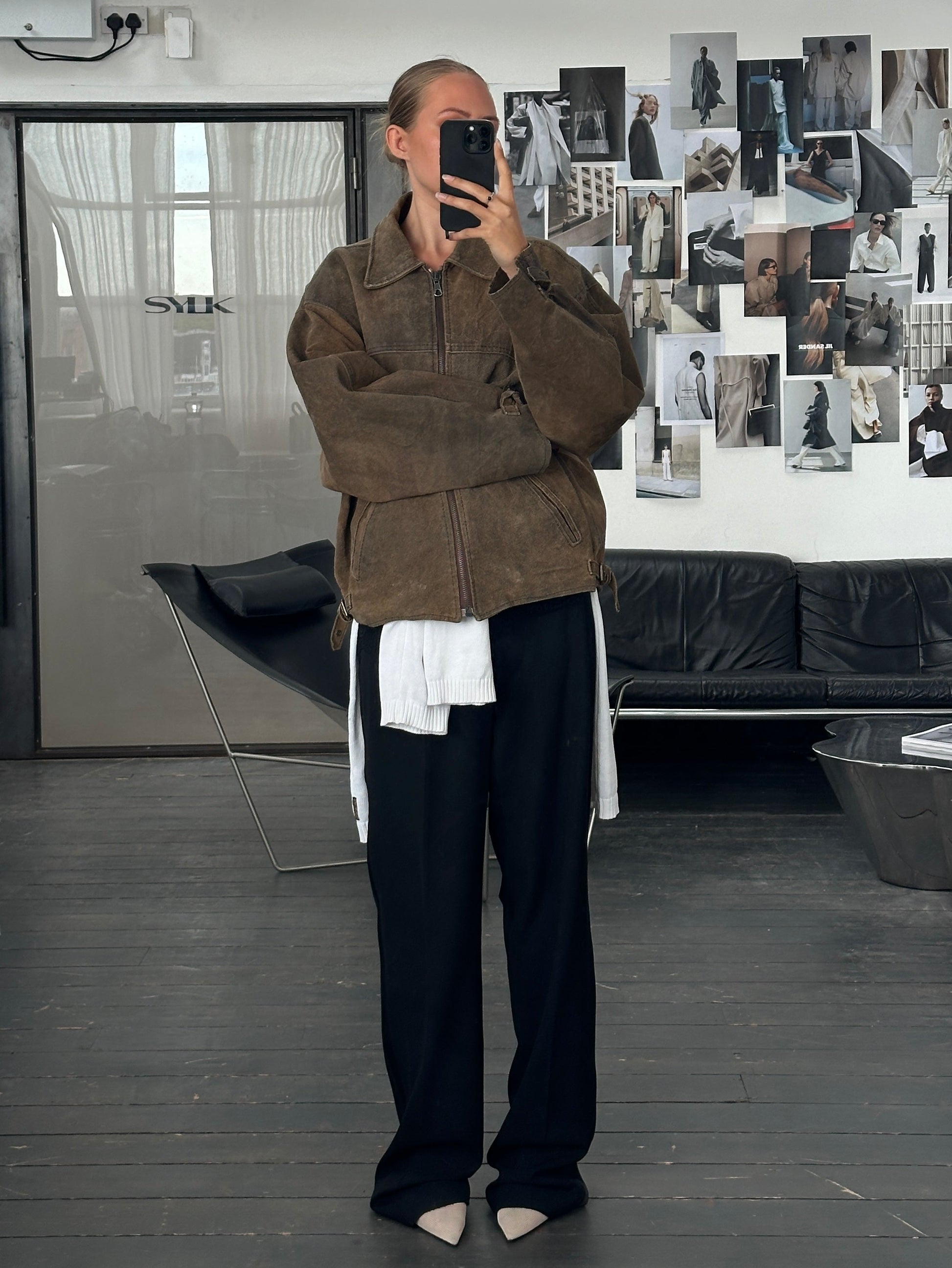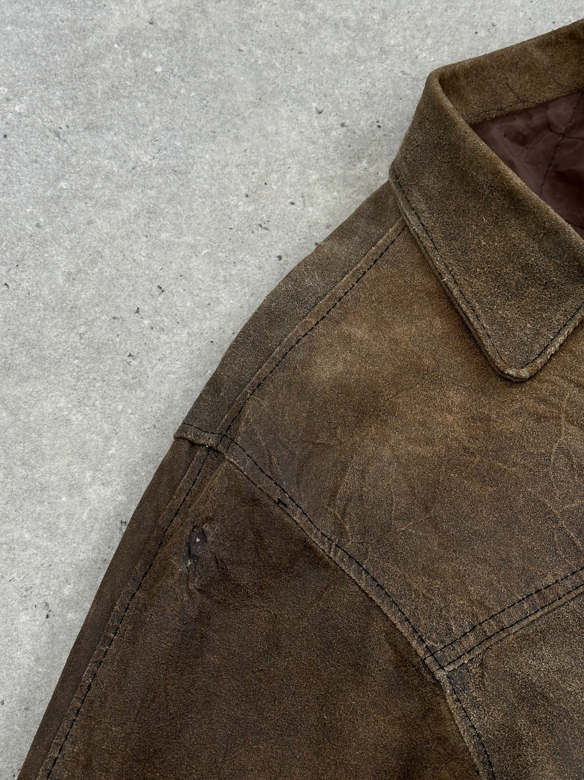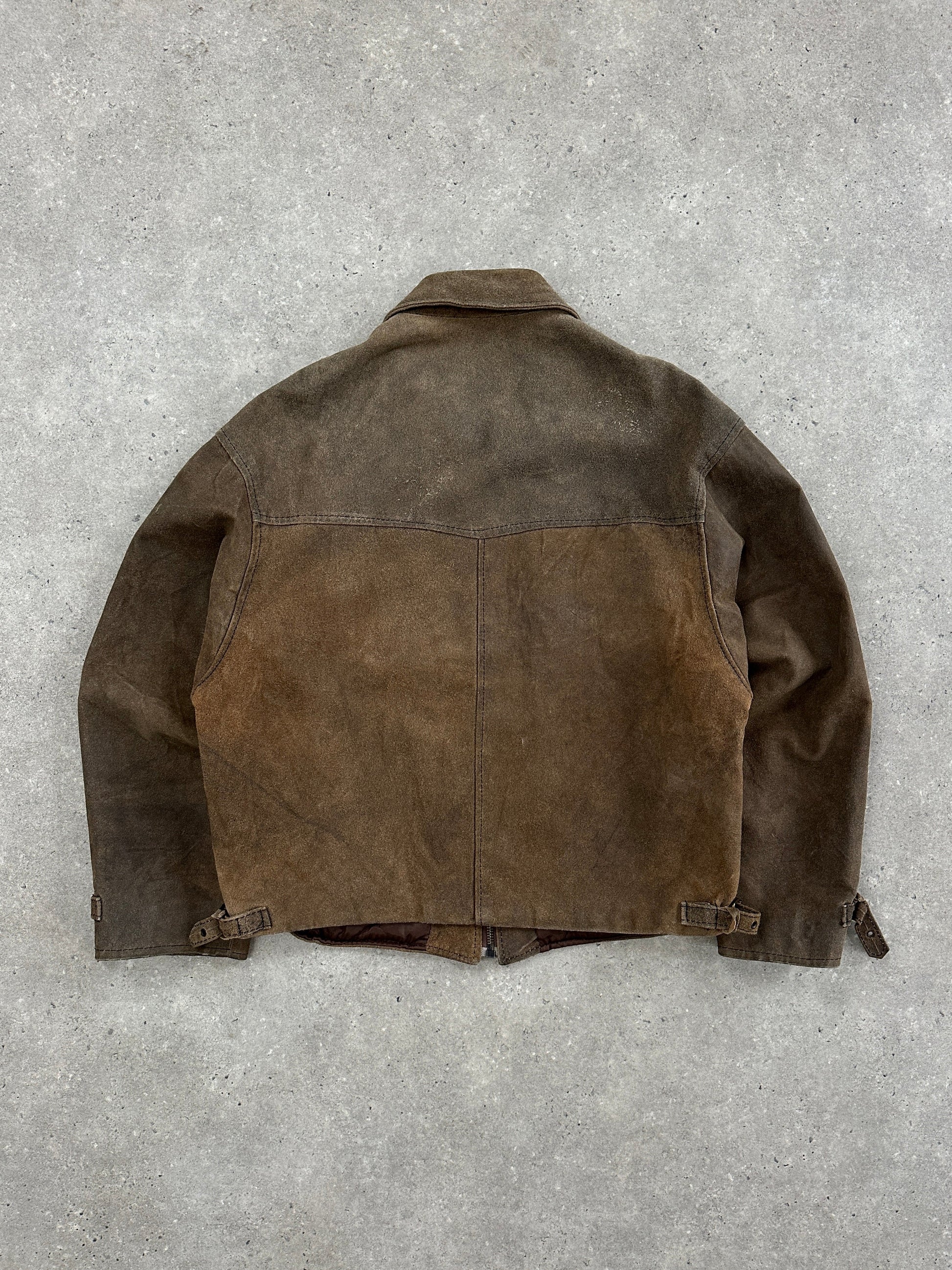 Vintage 1980s suede jacket featuring a point collar, welt pockets and adjustable side buckles. Crafted in genuine distressed suede with quilted lining.