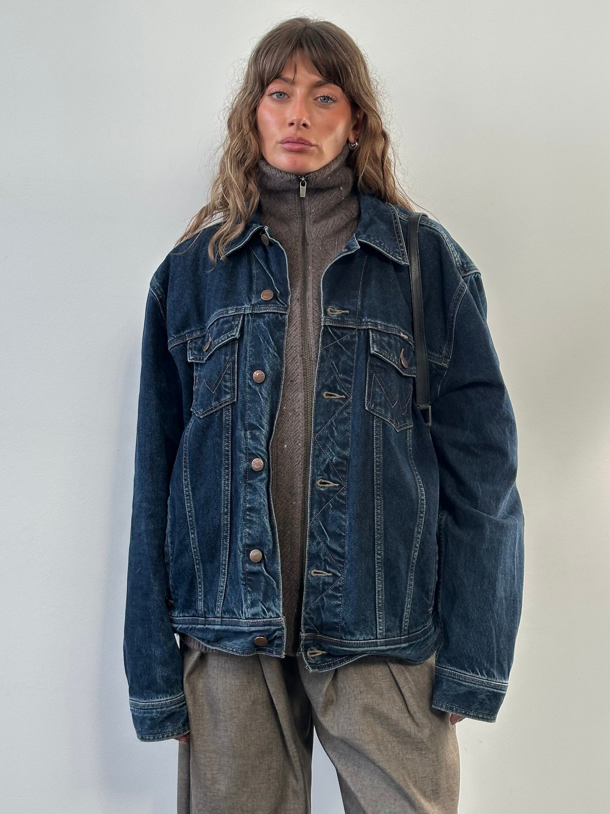Wrangler vintage 1990s mid blue denim jacket in heavyweight cotton with contrast stitching and a structured silhouette. Finished with copper logo buttons and signature W stitched chest pockets, cut in a relaxed oversized Western fit.