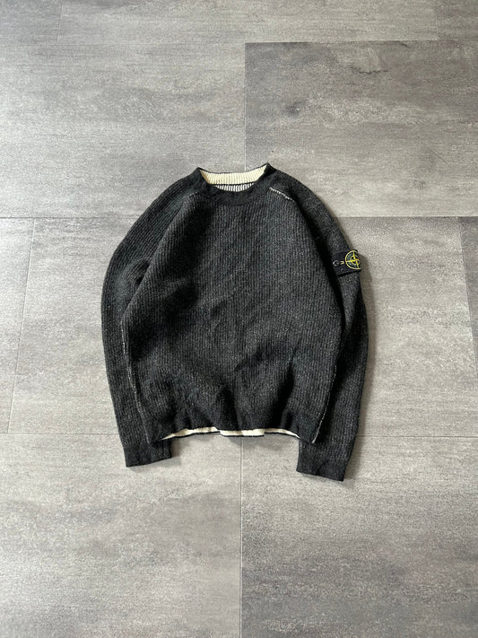 Stone Island Black AW02 Fine-Rib Grey Accent Button Collar Wool Knit Jumper