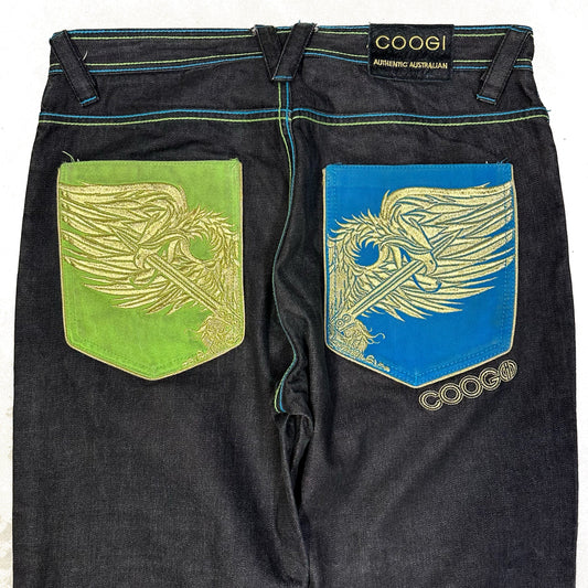 A crazy rare standout pair of selvedge denim from Stussy's Asia Exclusive Neighbourhood collab featuring an insane sashiko design of XXX and B for boneyards to the thighs and a detailed interior monogram print throughout and to the waistband.