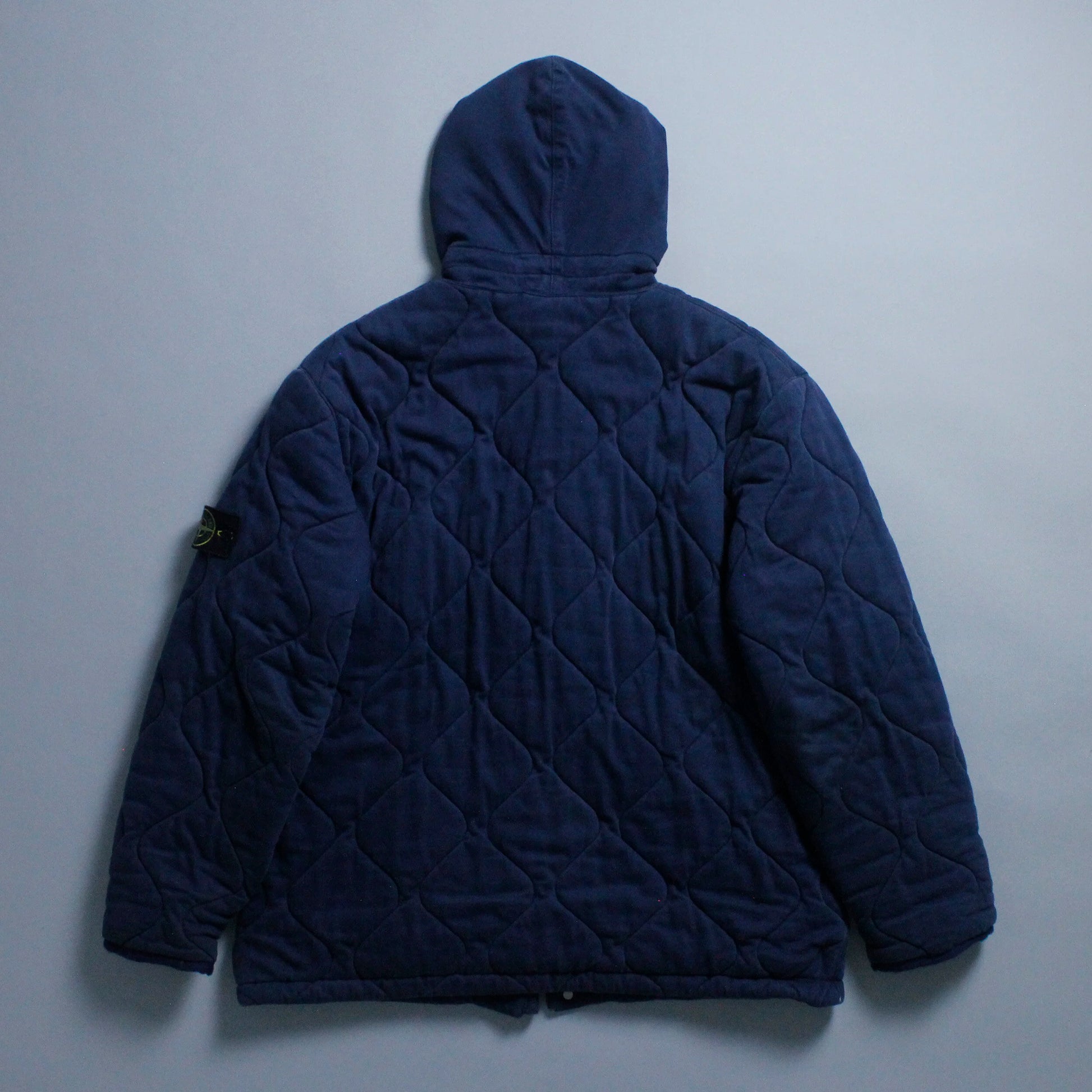 A heavy-duty jersey cotton padded jacket, in an hourglass quilting pattern. Four pocket design, with two flap closure patch pockets to both sides of the chest, and two slanted hidden lower pockets. Finished with fine cotton lining and a fleece lined hood for full weather protection. Complete with an ear hole function allowing better hearing for the wearer and adjustable cuffs. The layers of this piece give serious weight to it offering long lasting warmth.