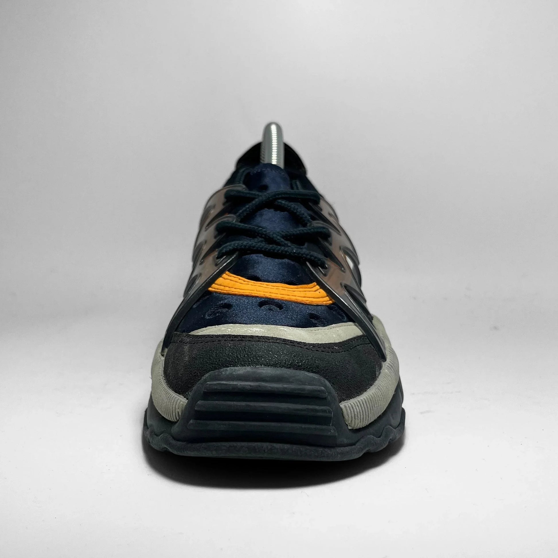 Neoprene base in navy with stamped detailing throughout, exp-skeleton in clear rubber, highlights in orange such as panels and branding on sole and heel-tab, fat mid- and outsole with script.