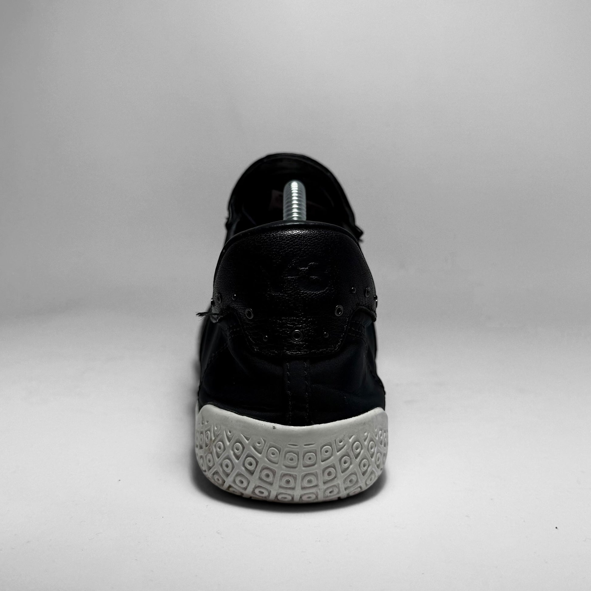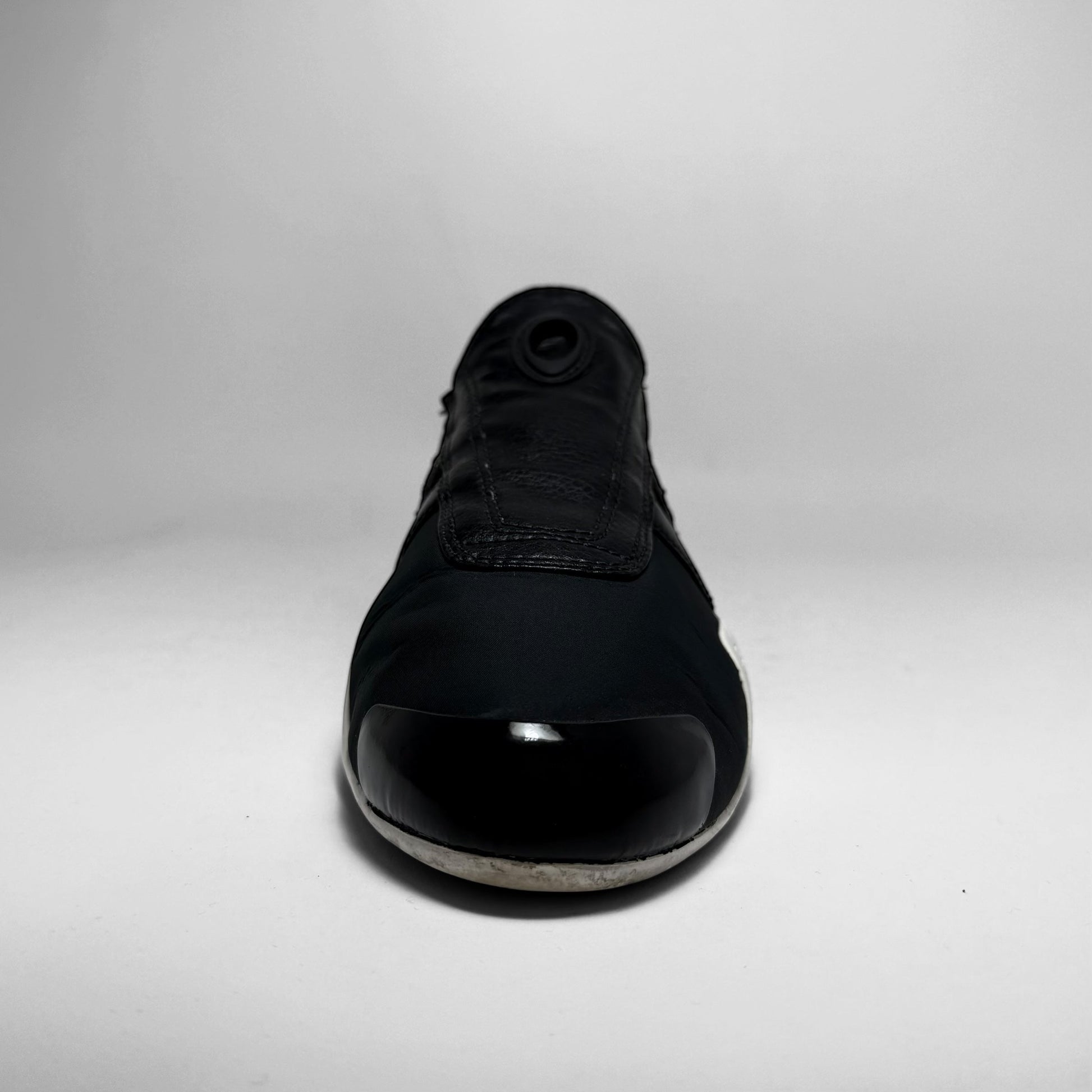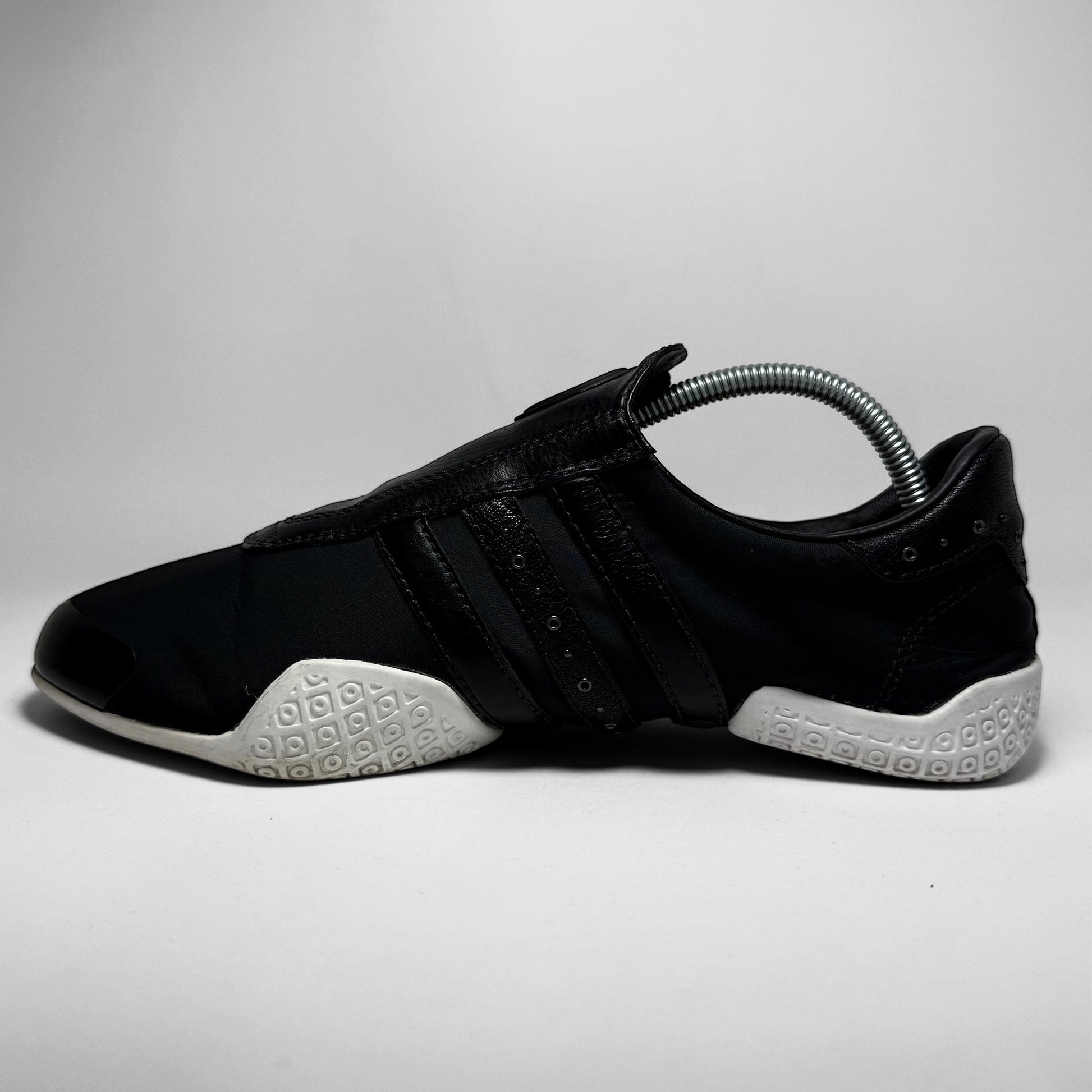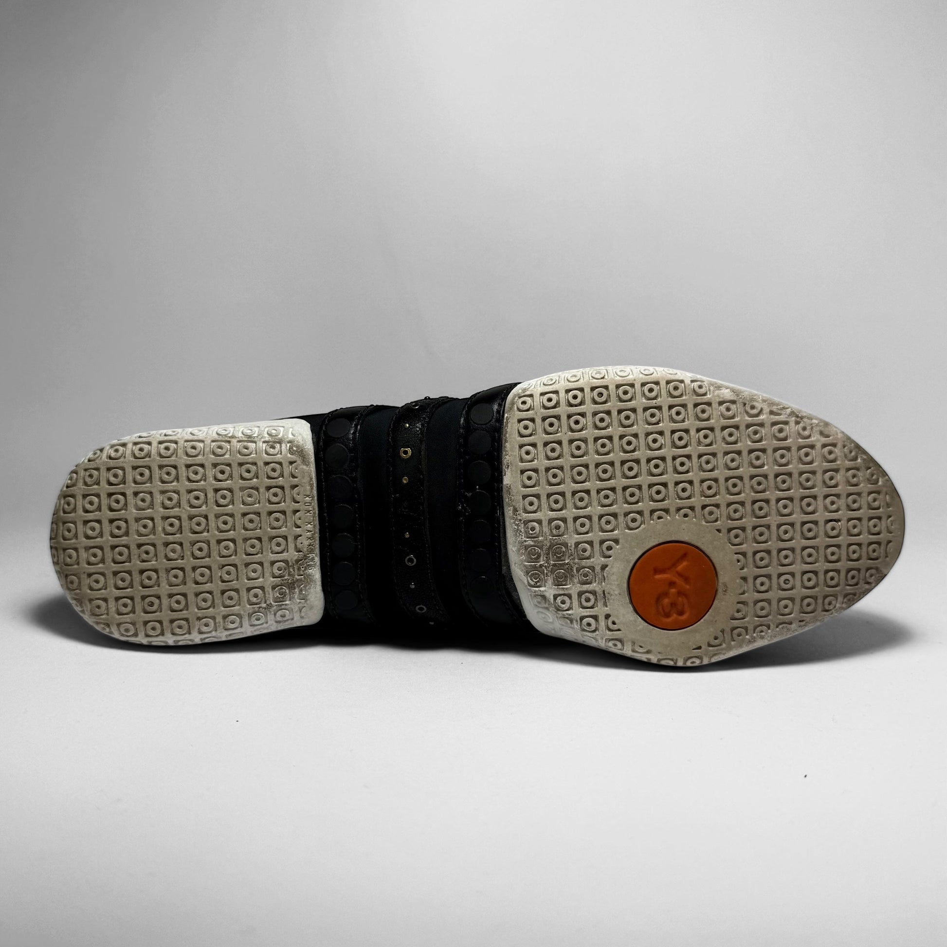 Featuring a sleek black neoprene and leather upper, concealed tongue strap, and asymmetric paneling. The low-profile silhouette sits on a textured white rubber sole with circular grip patterns, finished with Yohji Yamamoto branding and Y-3 logo detailing.