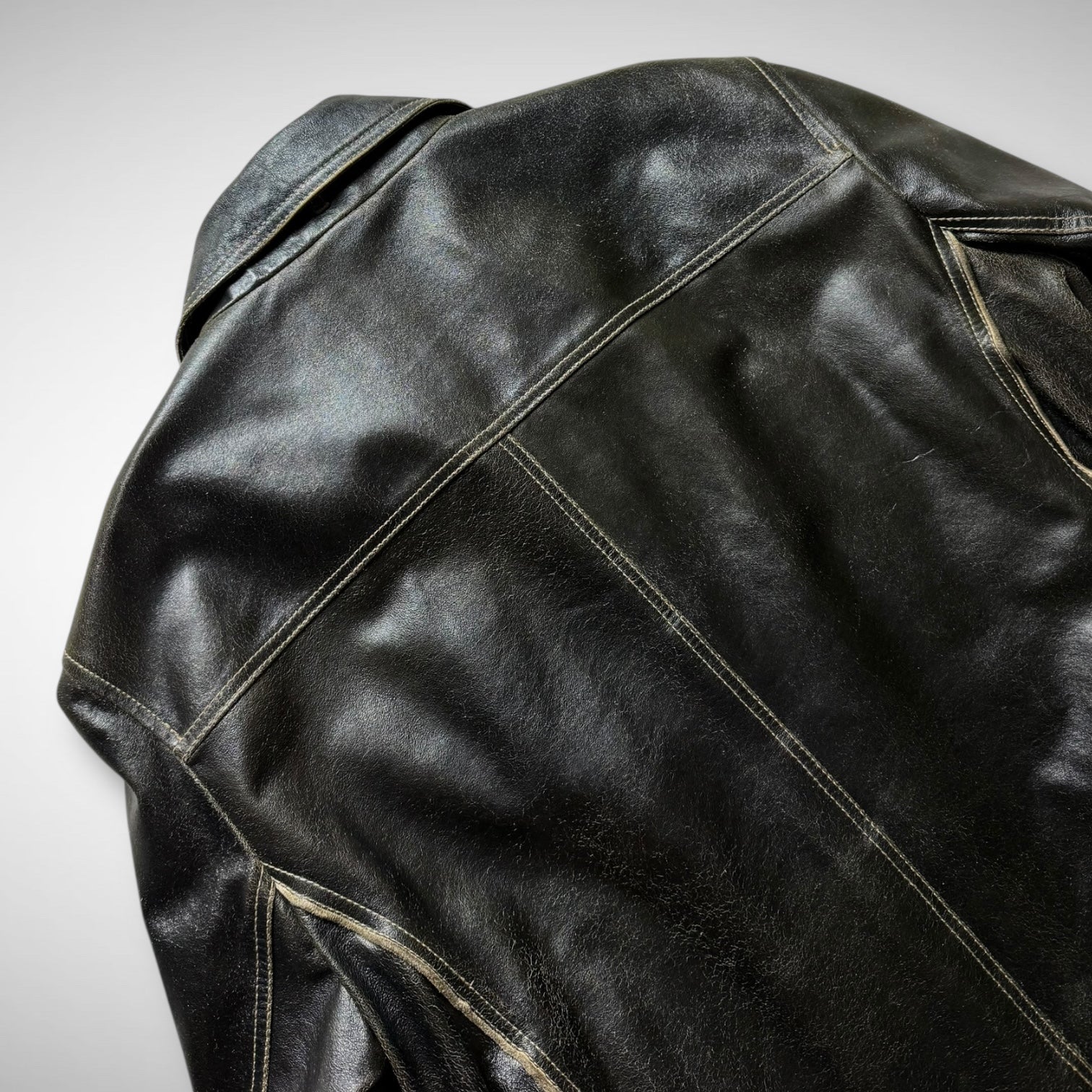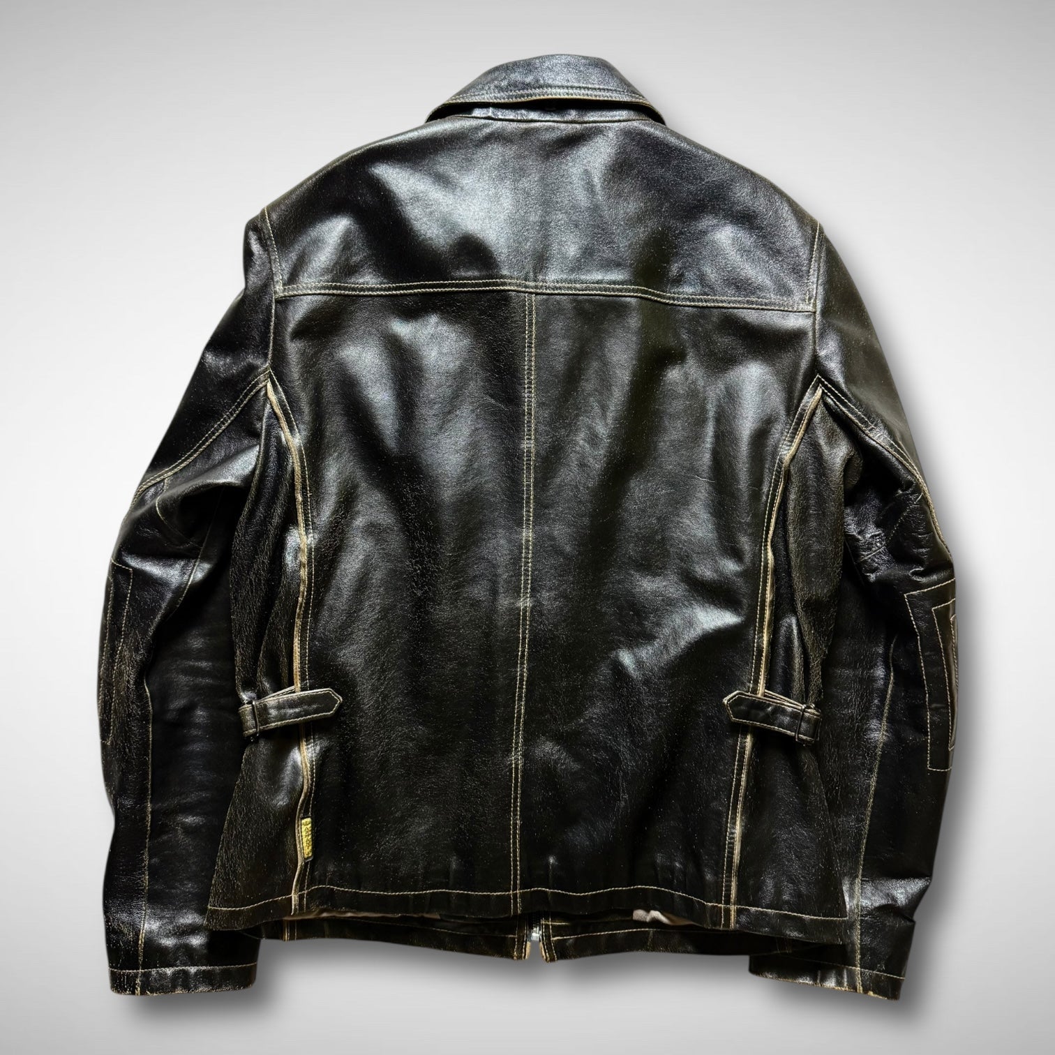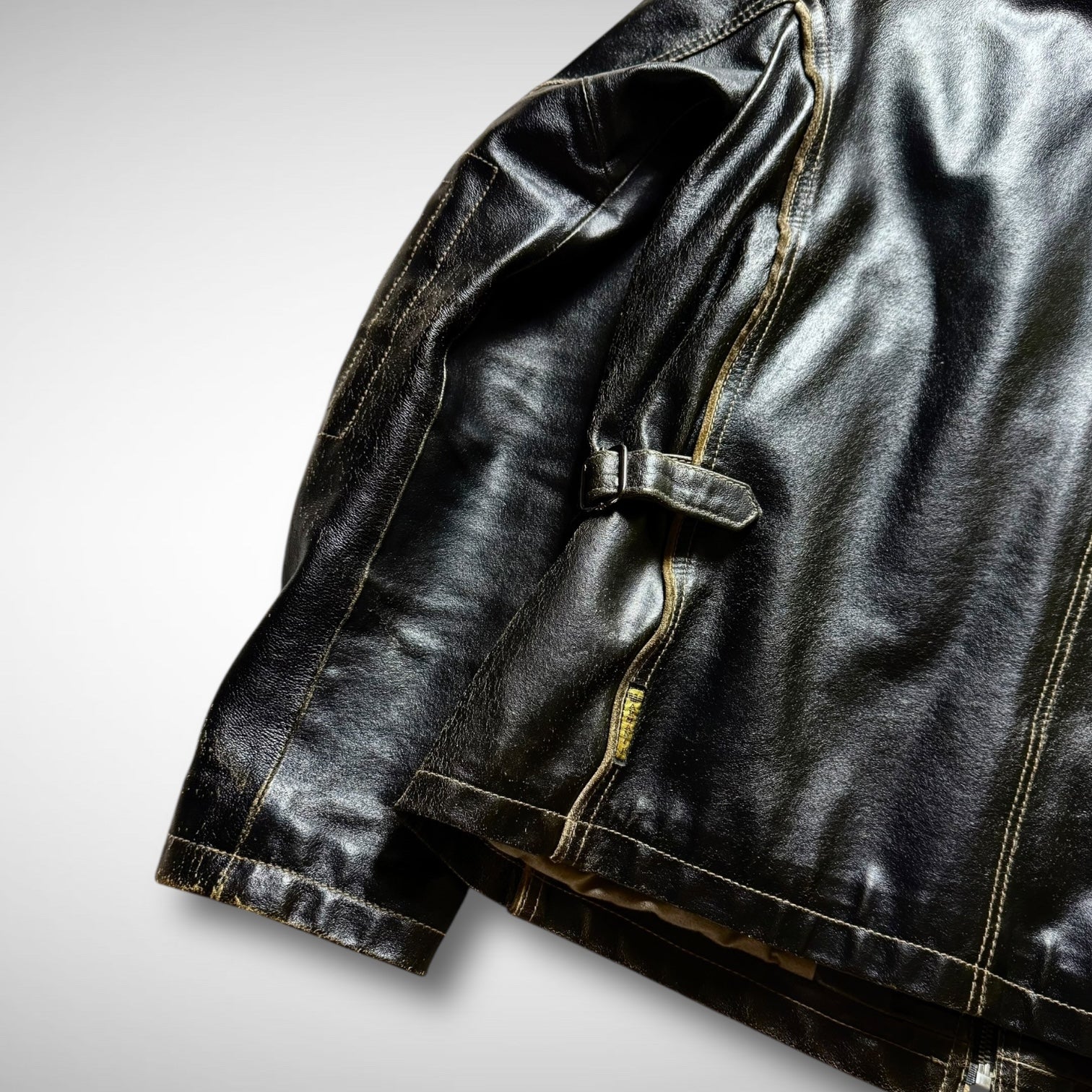 classic black leather jacket with full zip closure, bold contrast stitching, and reinforced elbow panels. Features include dual vertical zip pockets, adjustable side straps, and a smooth fabric lining.