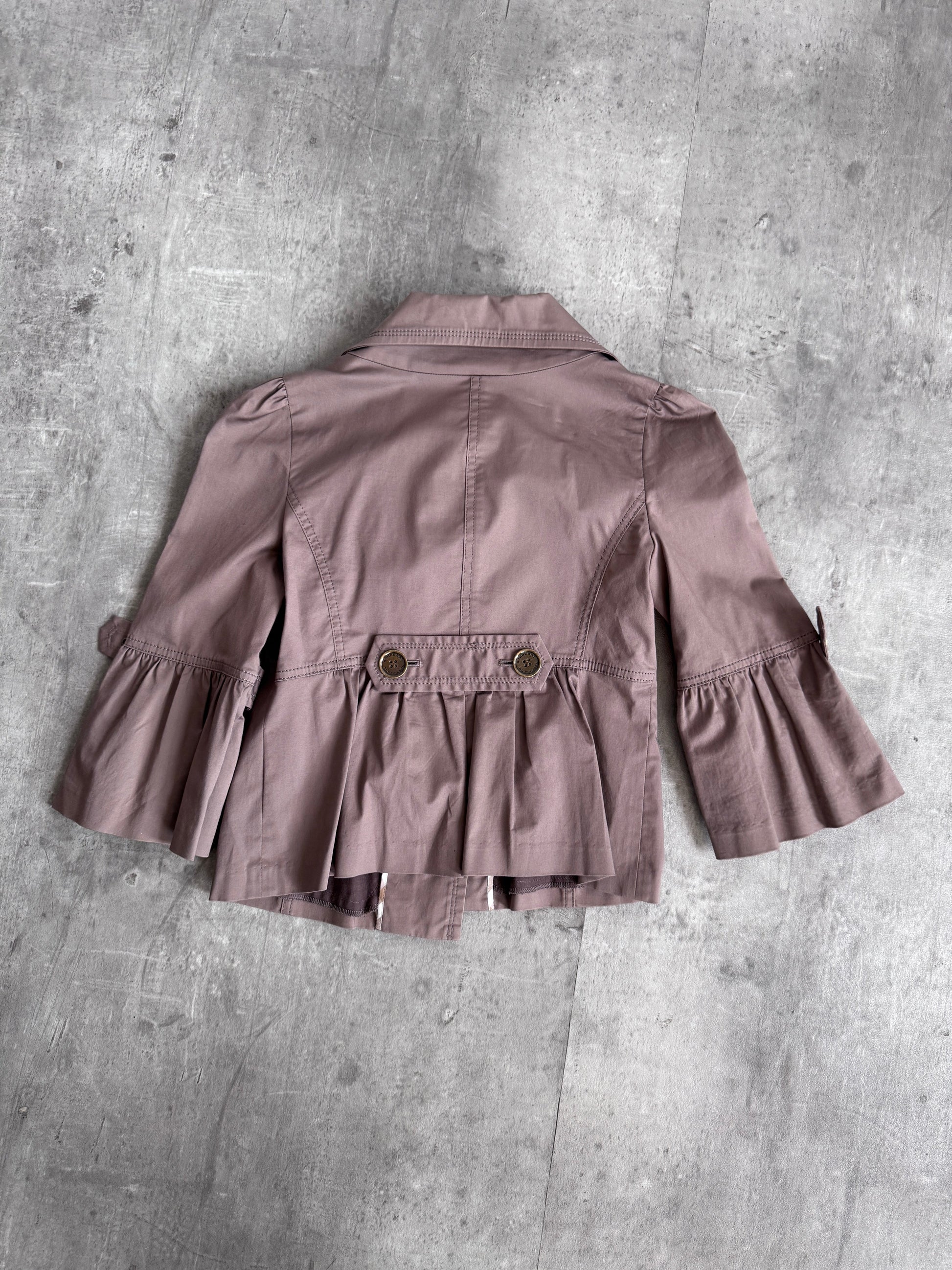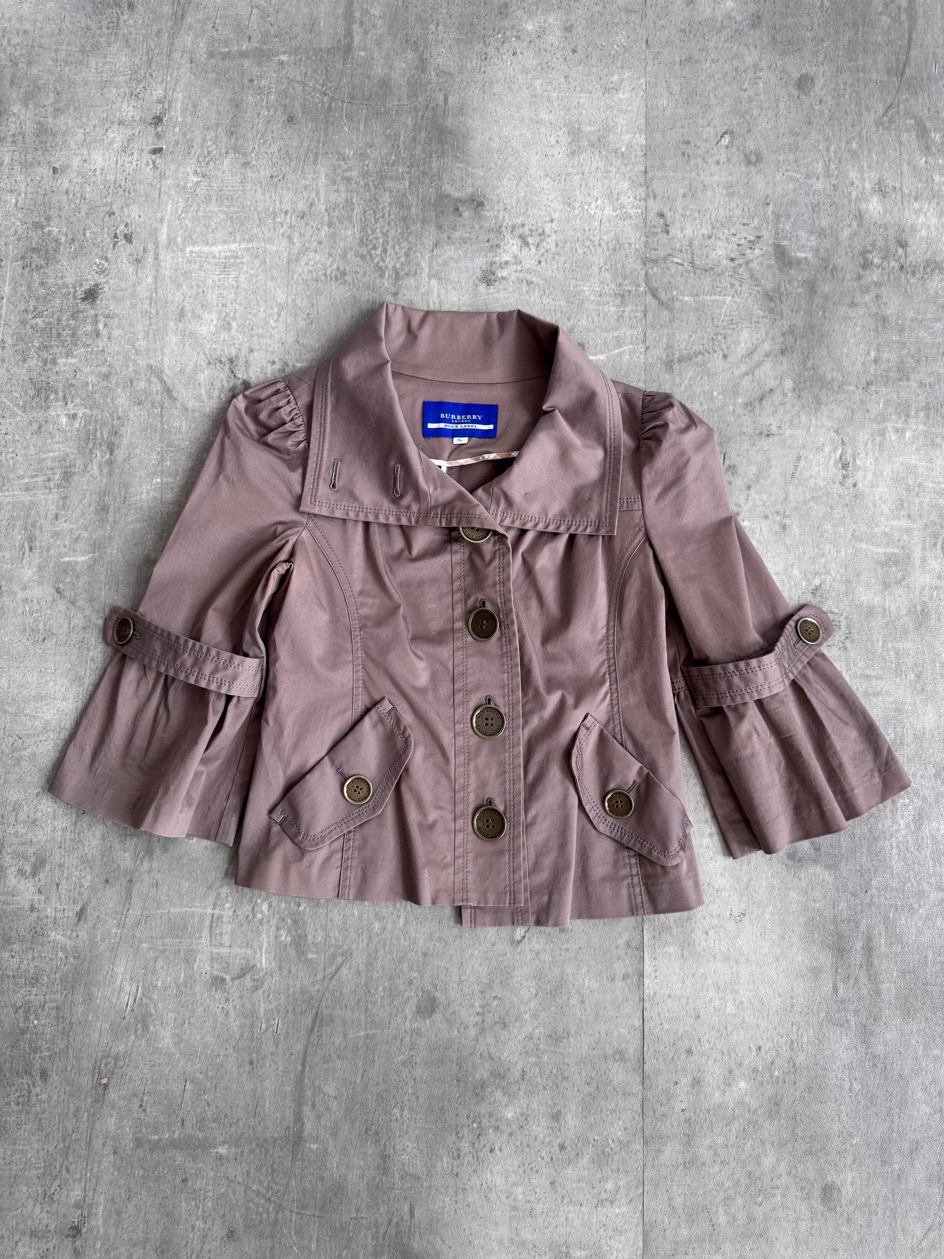 A chic and feminine cropped jacket from Burberry’s exclusive Blue Label line, known for its tailored Japanese-only releases. Designed in a muted beige tone, this piece features a structured silhouette with statement pleated sleeves and large button details. A rare find that perfectly balances elegance with a modern edge.