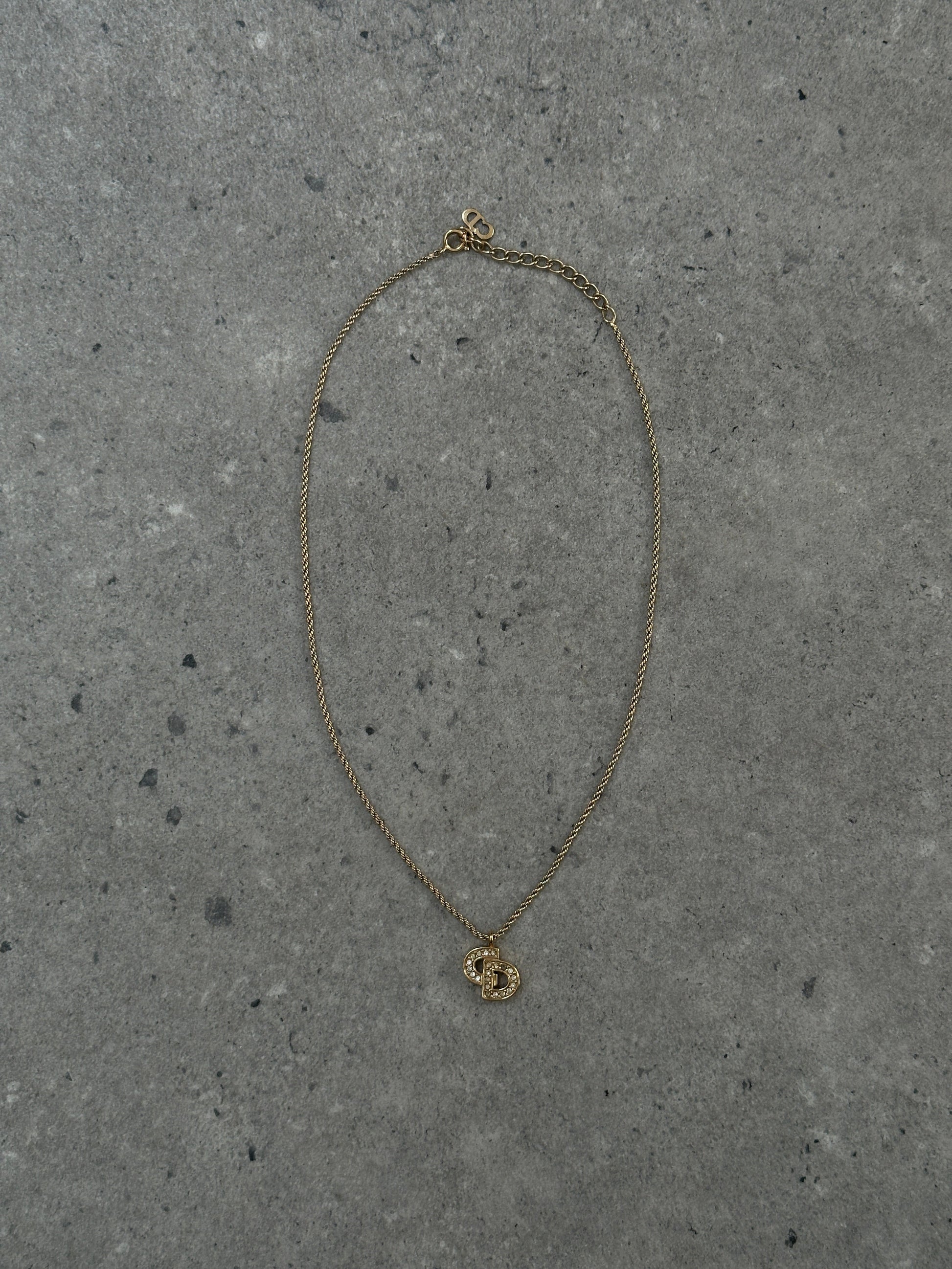 Christian Dior 16” Gold Plated Rhinestone Logo Pendant Necklace