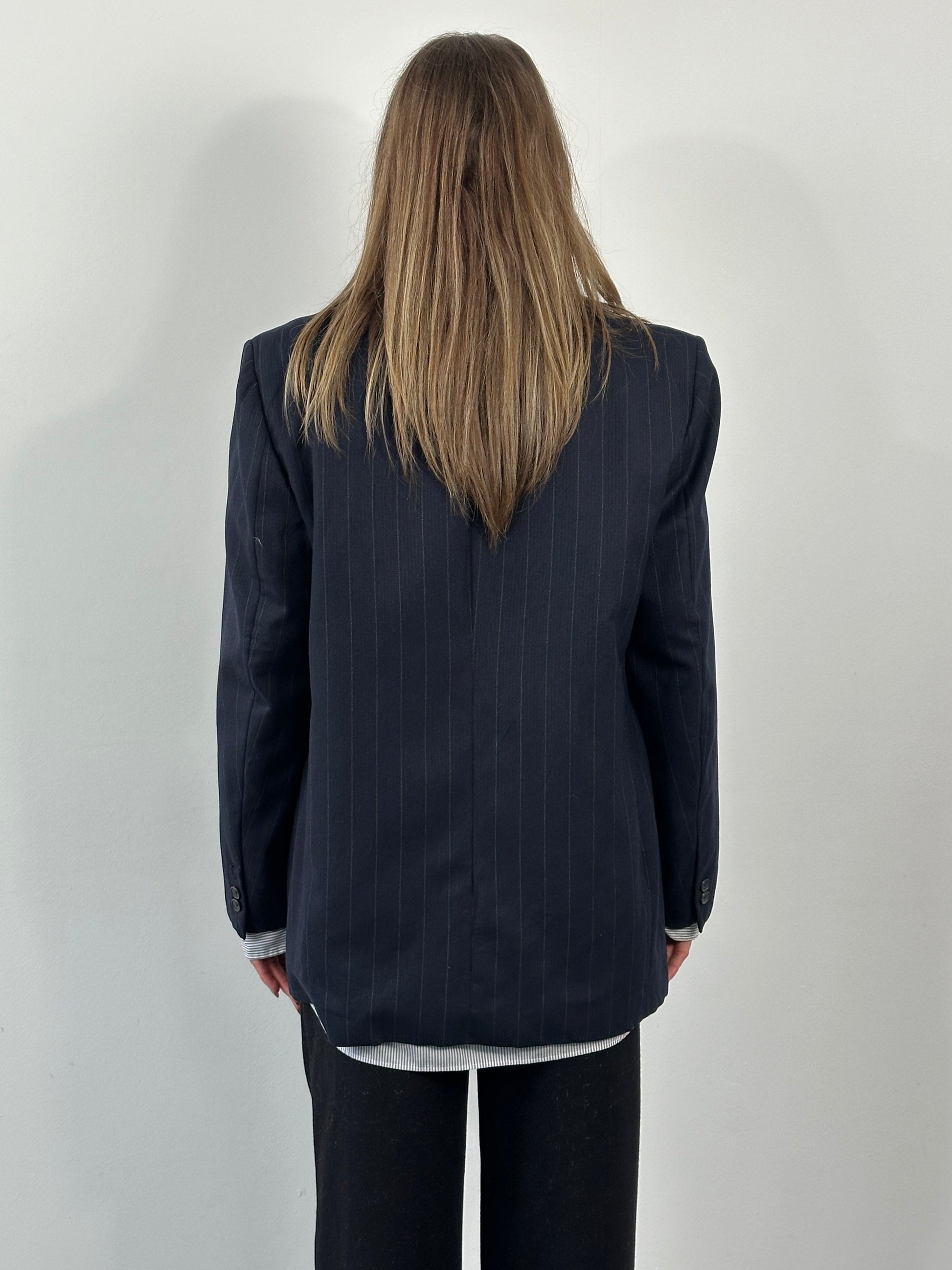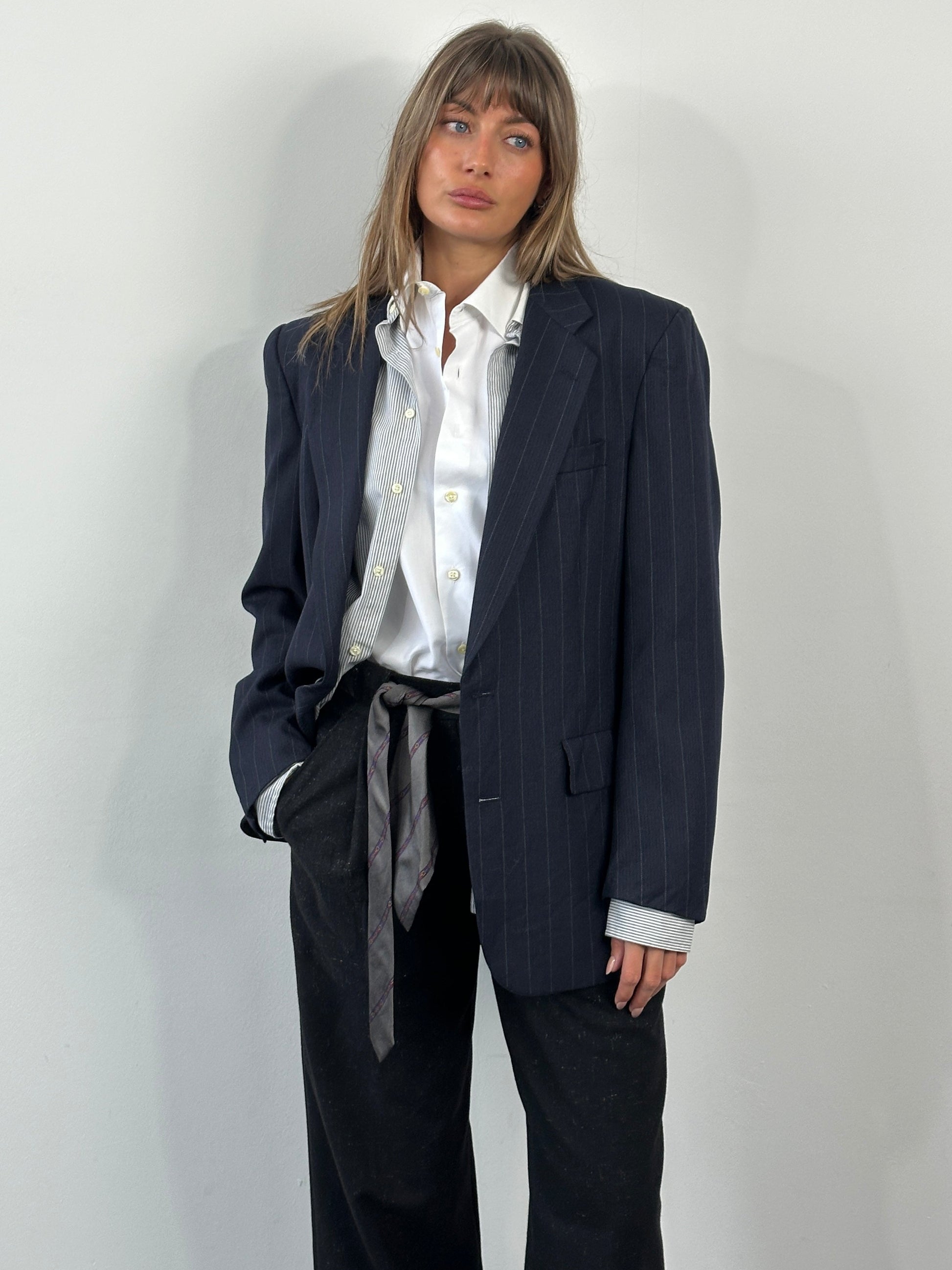 A navy vintage Christian Dior Le Connaisseur blazer in pure virgin wool with a refined pinstripe and tonal CD monogram lining. Cut with structured shoulders, notch lapels and a classic two button front, it reflects late 1980s tailoring with a relaxed straight silhouette.