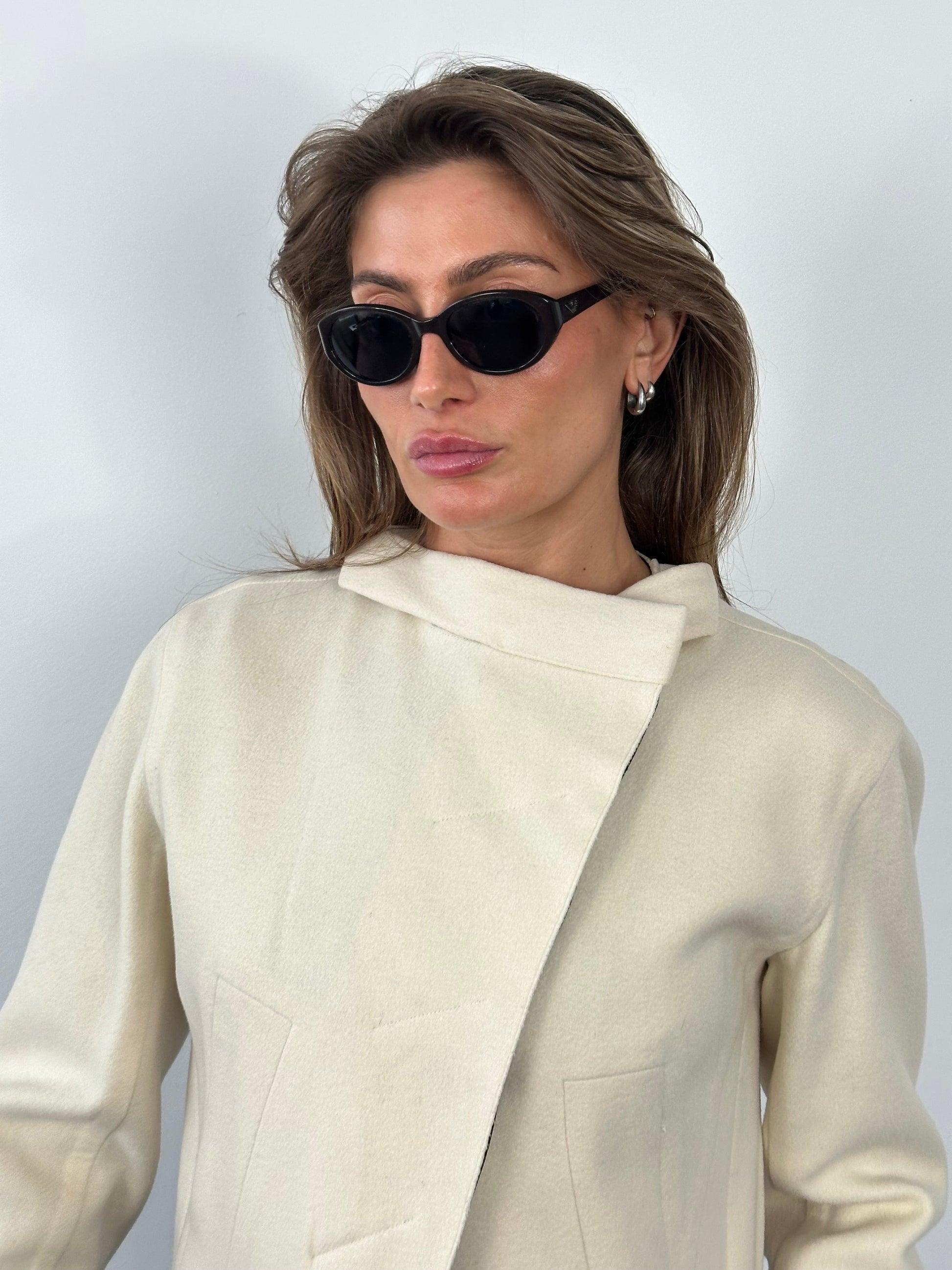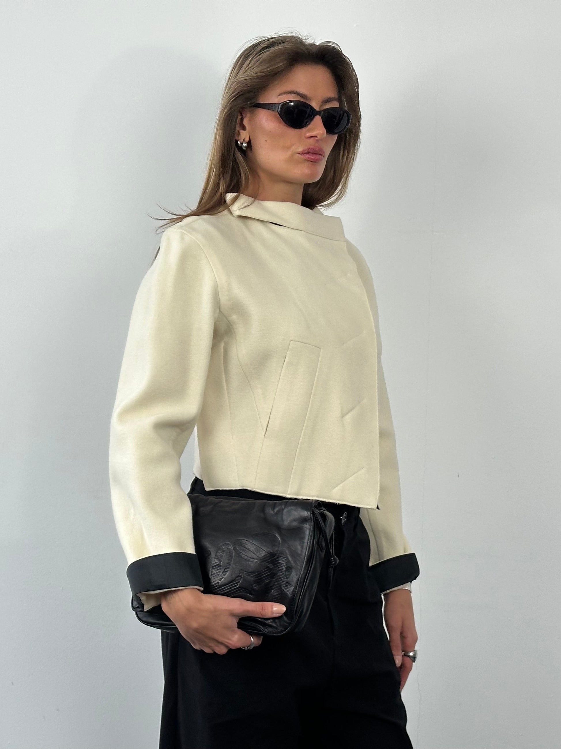 This architectural cropped jacket by Donna Karan Collection is a sophisticated example of the designer’s minimalist vintage era from the late 1990s. Rendered in a structured cream wool, the piece features a clean-lined asymmetric front with a sculptural high collar and contrasting black grosgrain-textured trim. Its boxy yet tailored silhouette is finished with bold black cuffs and a full dark lining, embodying a timeless quiet luxury aesthetic.