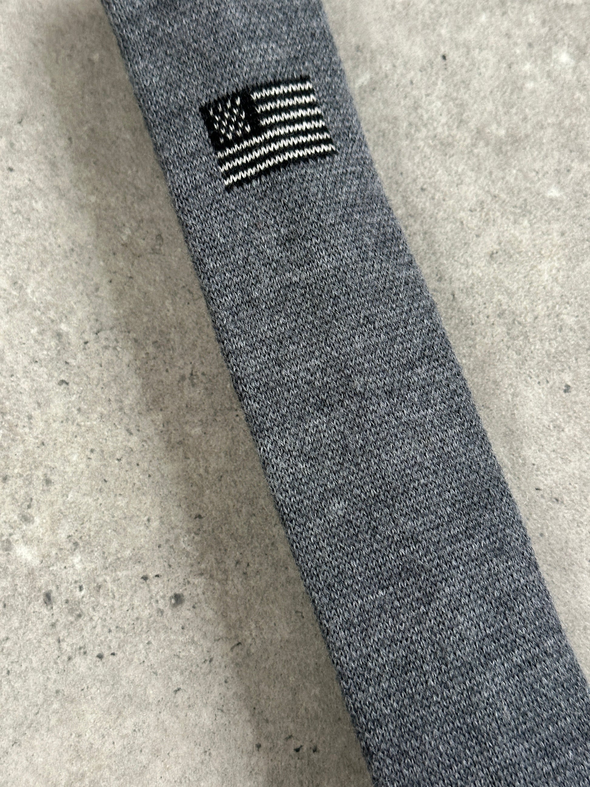 Vintage 1990s grey knitted tie by Beams, featuring a slim straight cut with a subtle woven texture and small embroidered flag detail at the tip. A classic menswear accessory that pairs well with tailored looks and relaxed suiting alike.