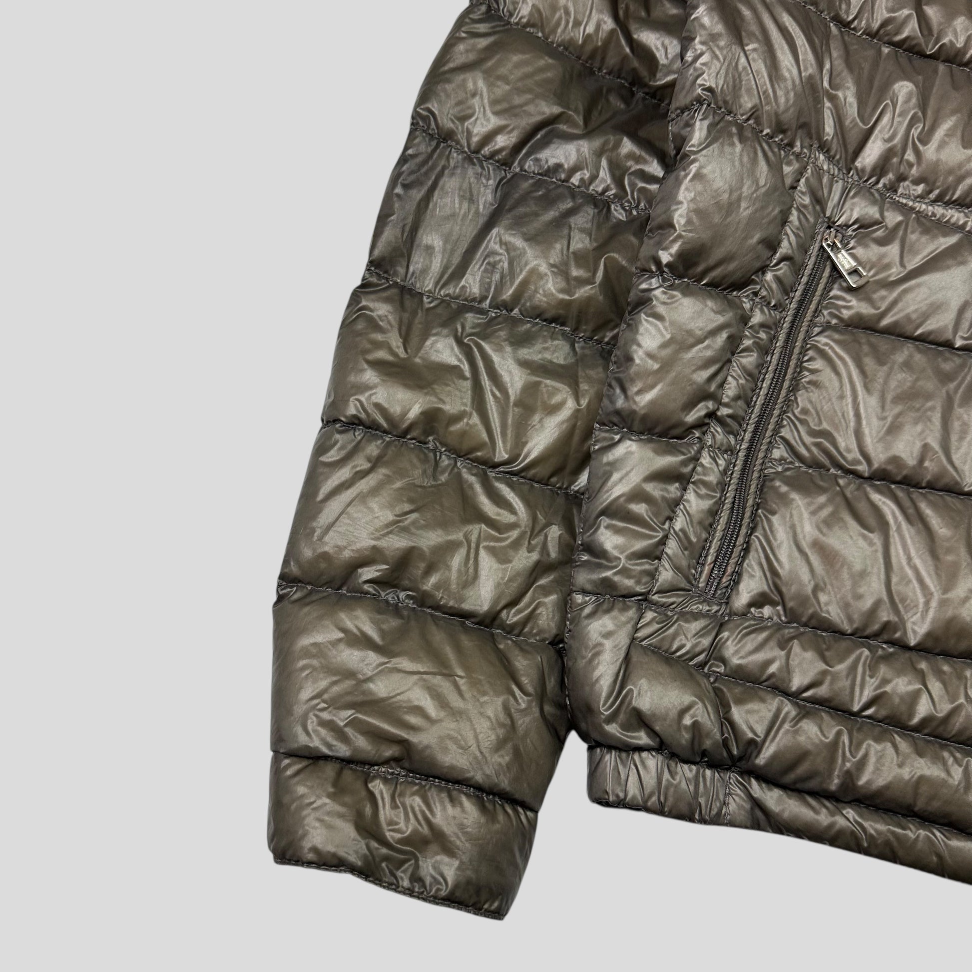 Moncler Acorus khaki light goose down puffer jacket, Logo to arm, Lampo zip hand pockets, lightweight warm and cozy with a boxy fit.