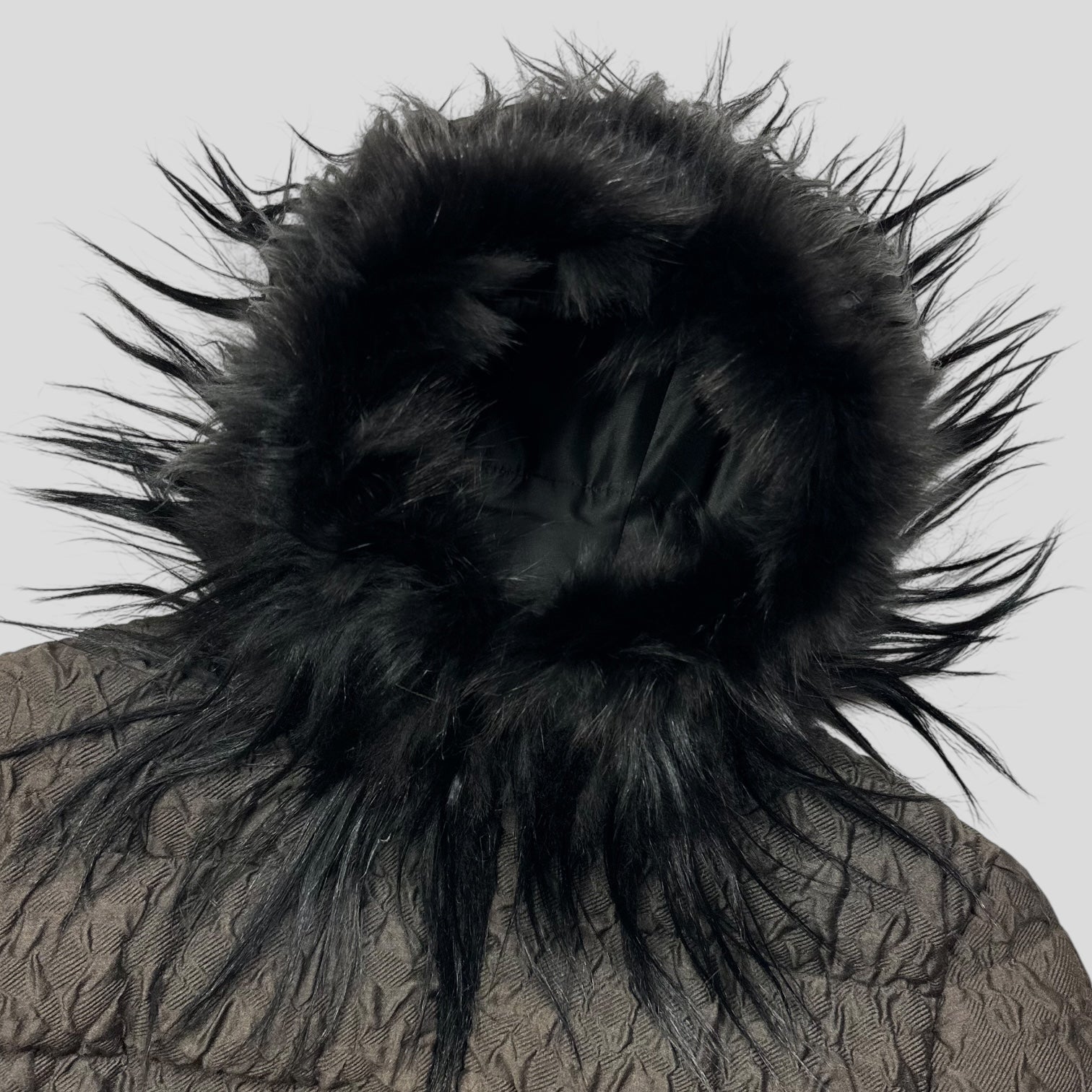 Very rare 2014 Prada Milano mainline puffer jacket with a crazy exaggerated draping fur hood made of Goat and Blue Fox fur, unique textured material that’s soft and padded constructed from a silk, nylon and wool blend, one of the most technically interesting and unique modern Prada jackets.