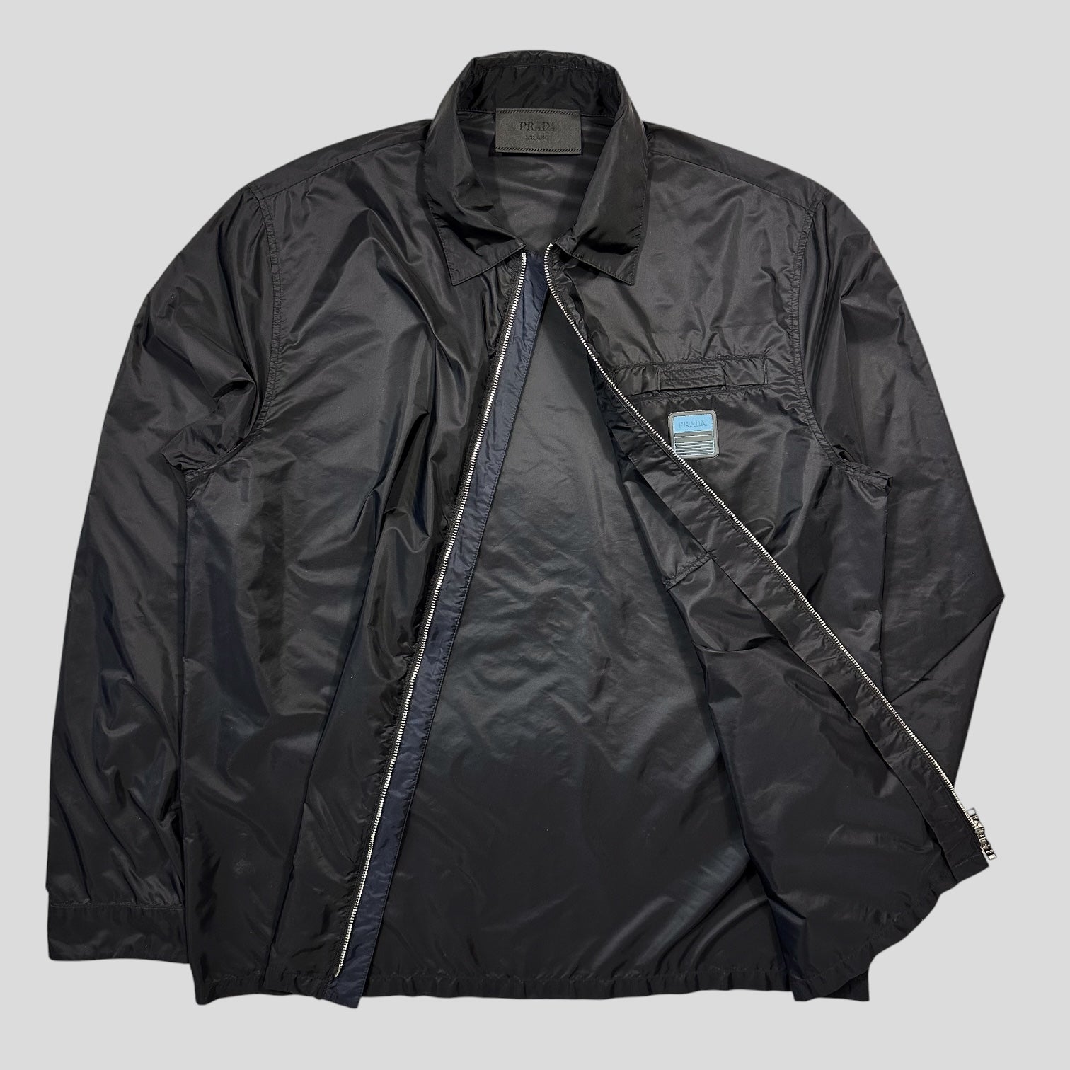 Very rare 2018 Prada Nero black nylon overshirt jacket, baby blue rubberised race logo to chest pocket, dual exposed metal zip up front, beautiful smart casual piece.