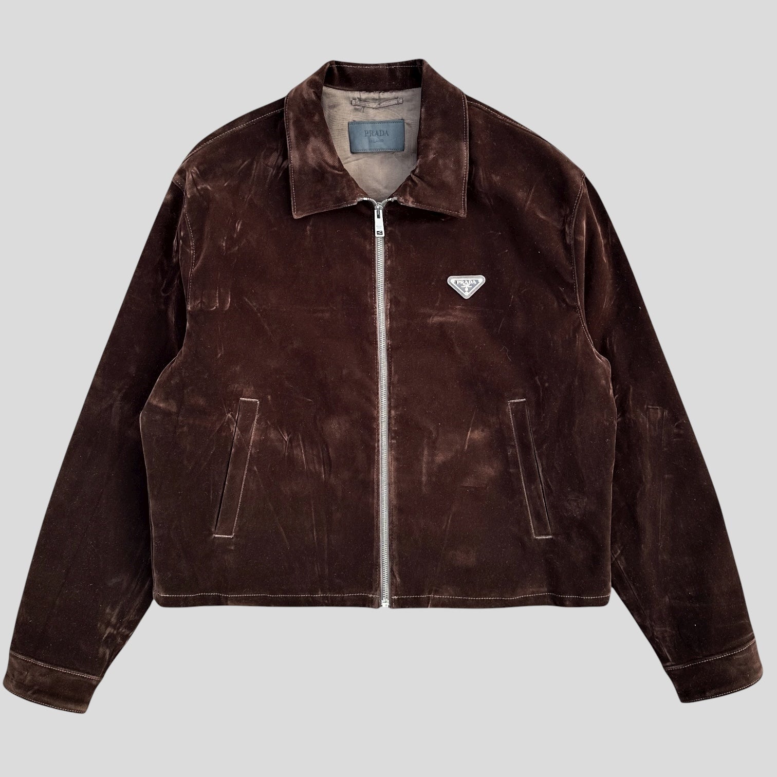 Prada 2024 Brown Velvet Velour Plaque Logo Boxy Jacket - M/L