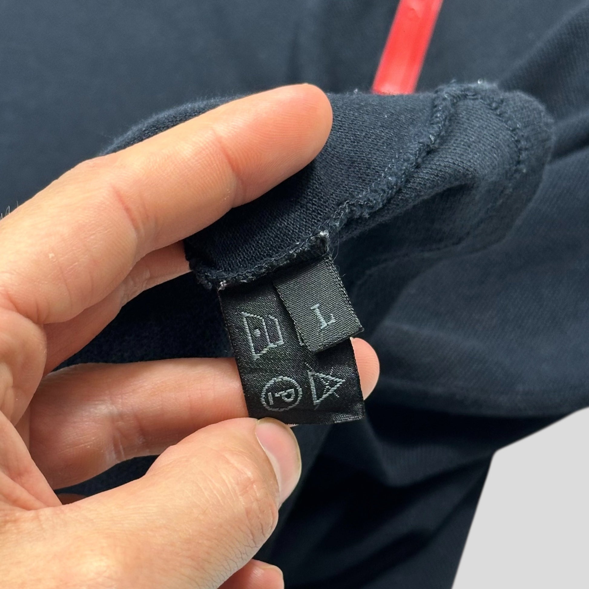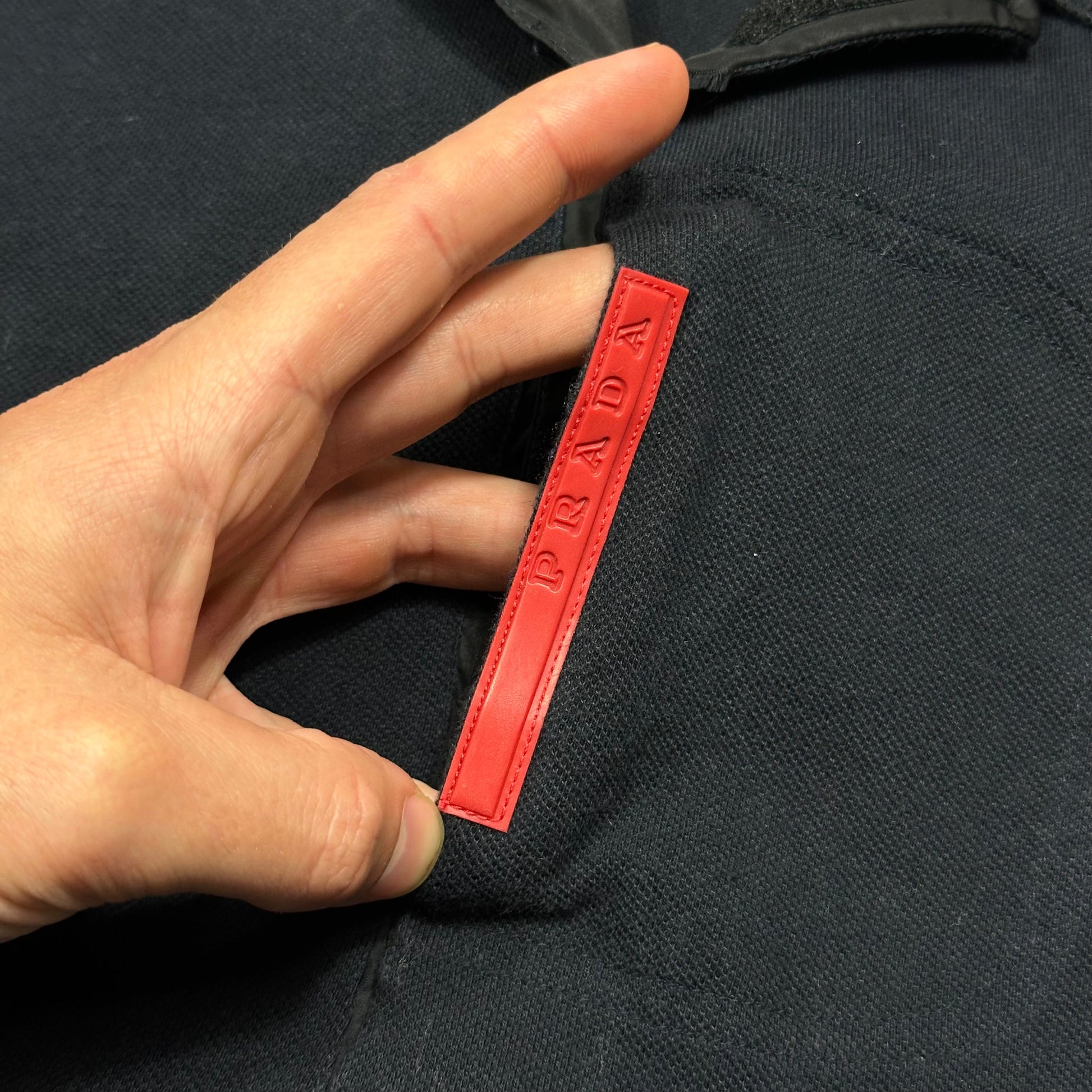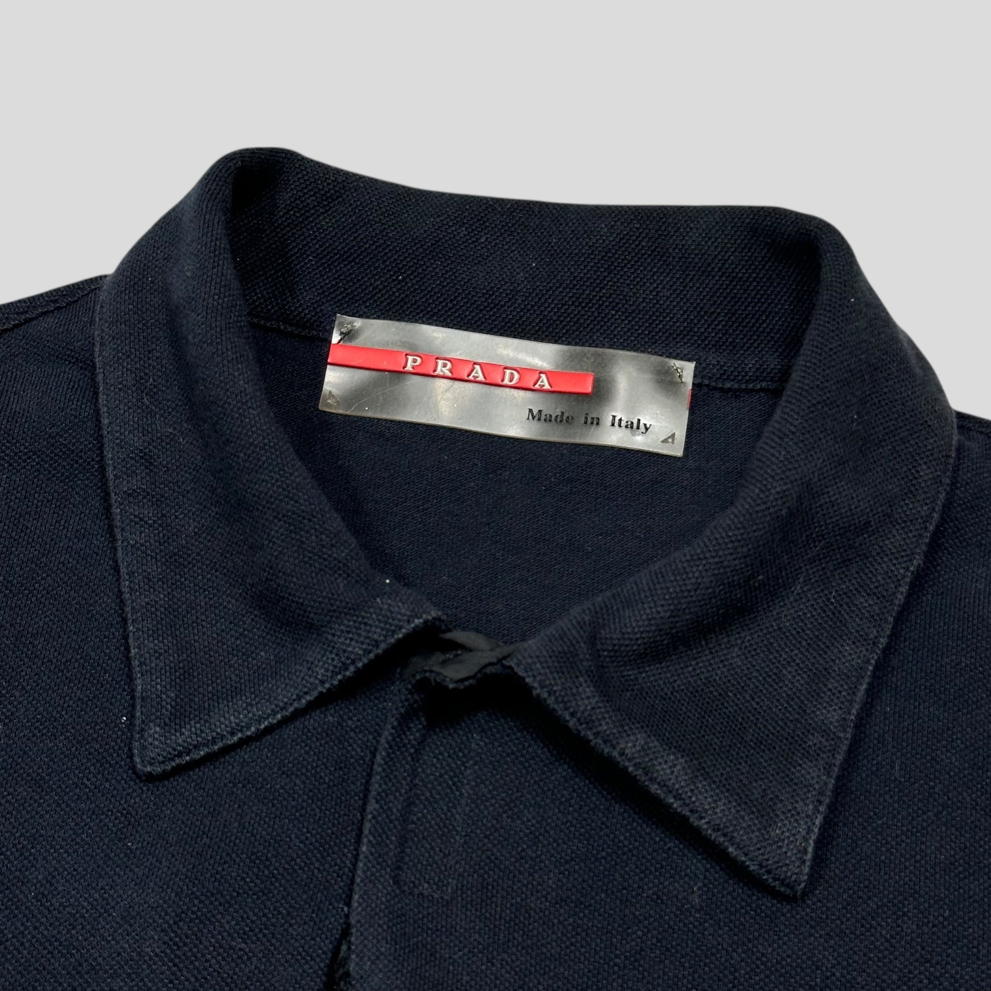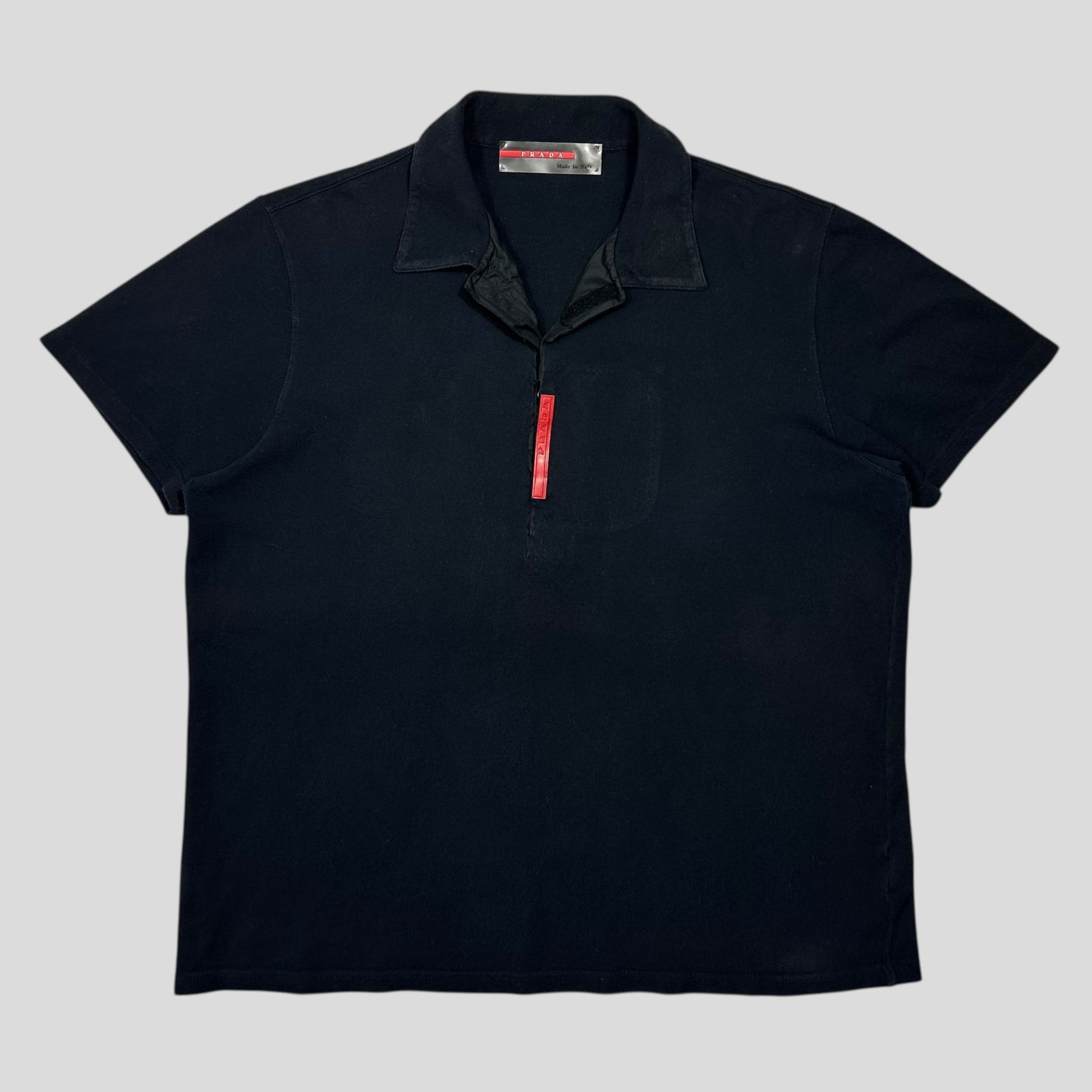 Very rare and from the 1998 first season of Prada Sport, Navy colourway cotton polo, unique vertical red prada logo tab to chest with a hidden nylon pocket underneath, collar can be worn open to show nylon detailing.
