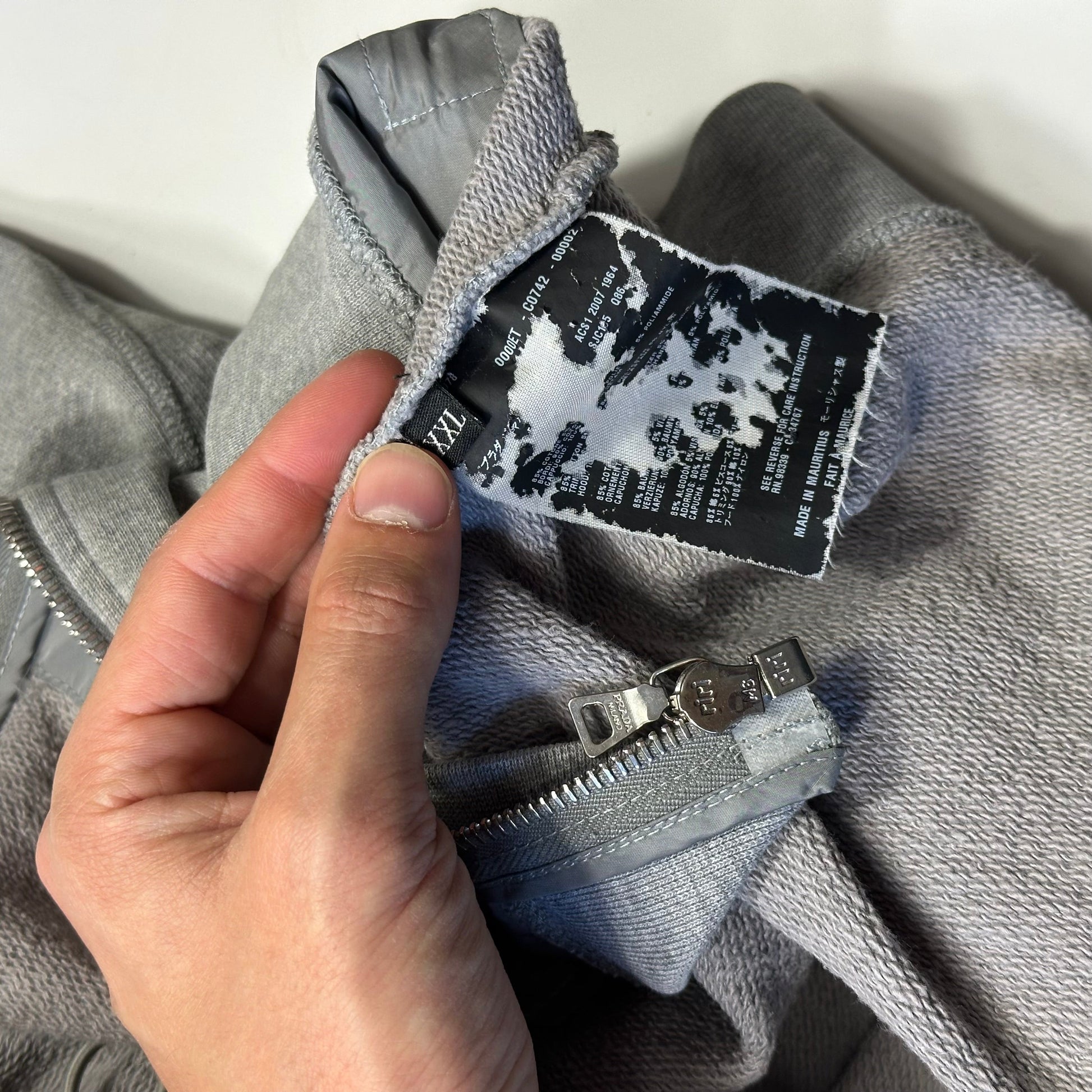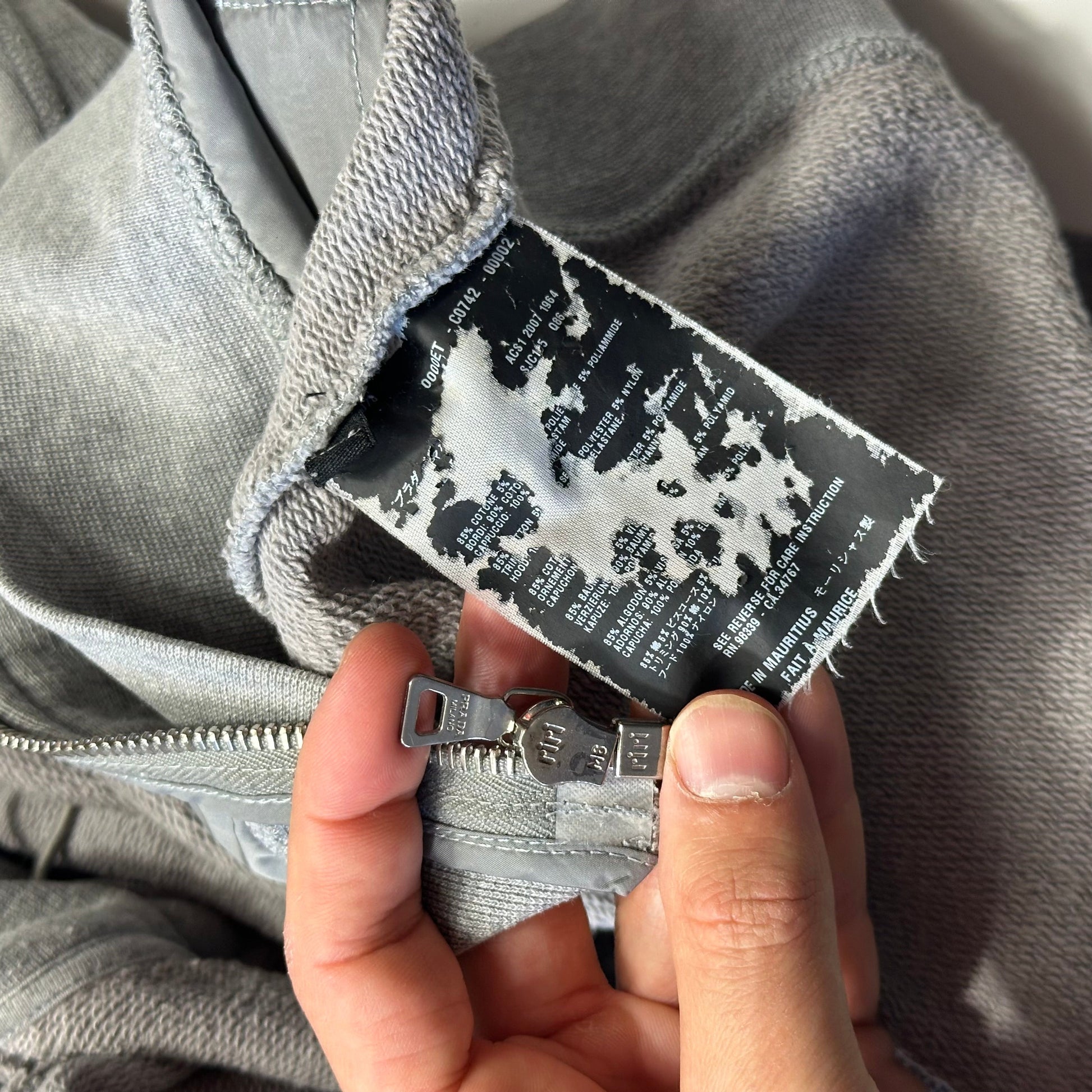 Rare 2007 Grey cotton zip up Prada Sport hoodie with silver grey nylon hood, zip pockets, Prada metal RIRI zippers and a red logo tab at the hip.