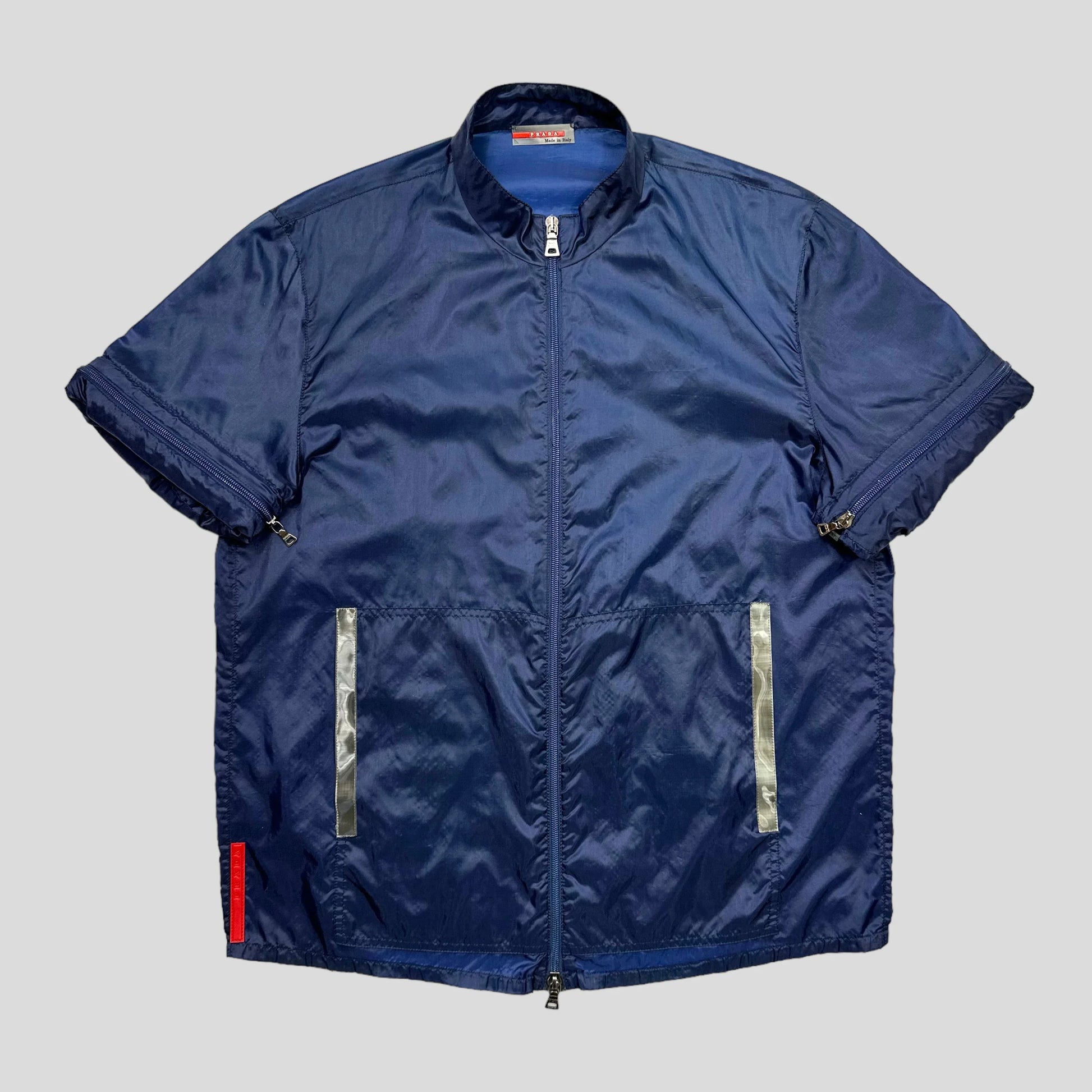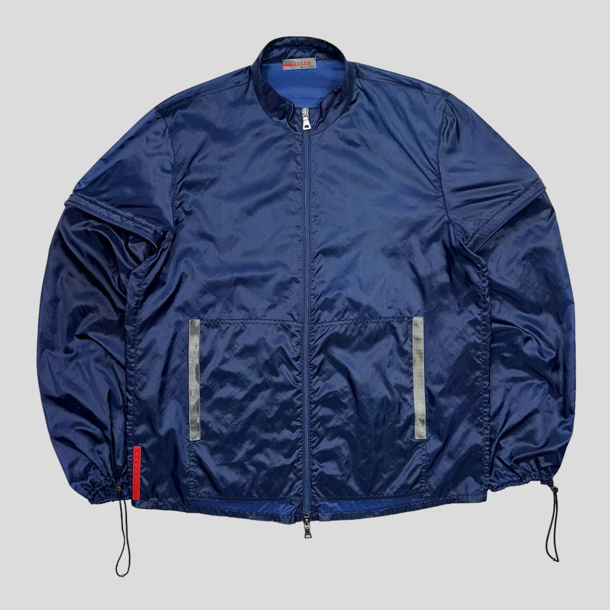 Features reflective strips at the pockets, convertible arms which allow the jacket to be transformed from long to short sleeve, Prada metal drawstrings at the wrist to adjust fit, a miniature track style collar and the Prada Sport red tab at the waist.