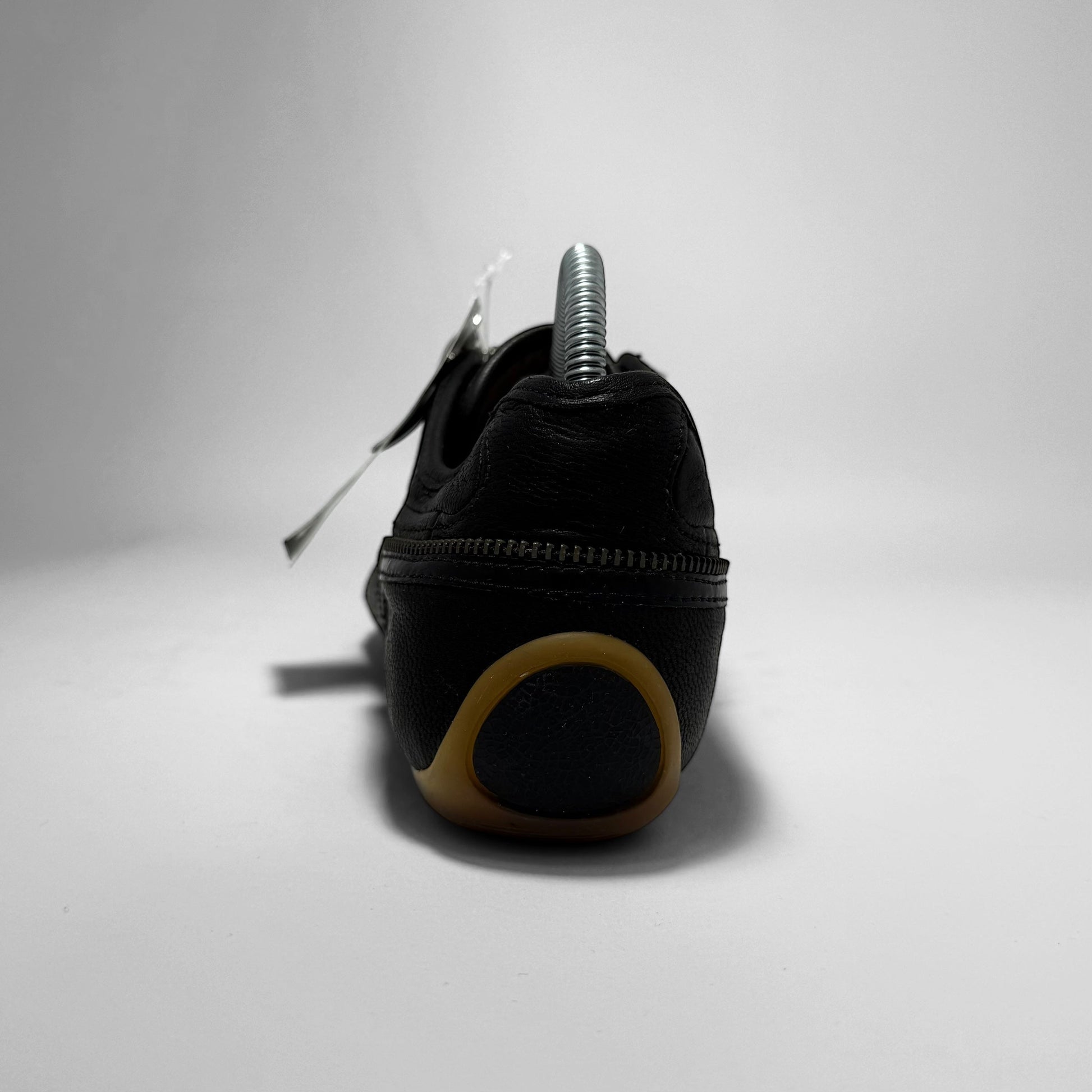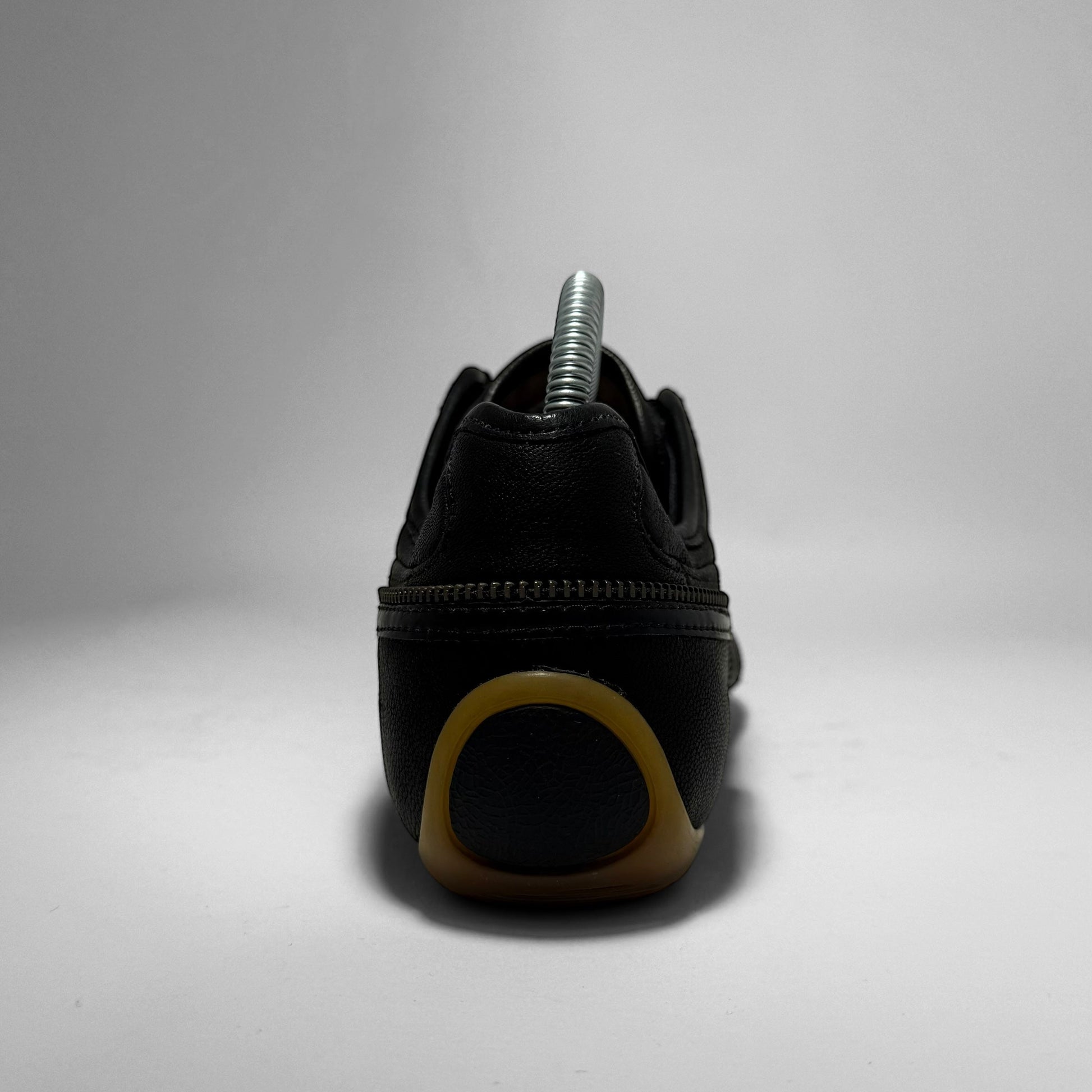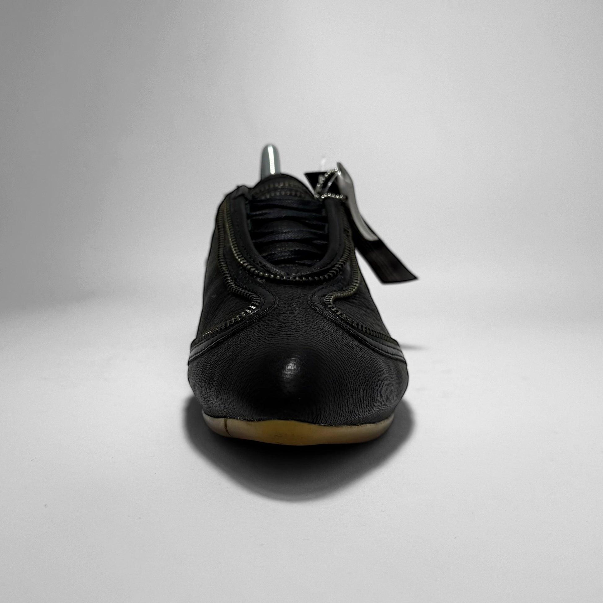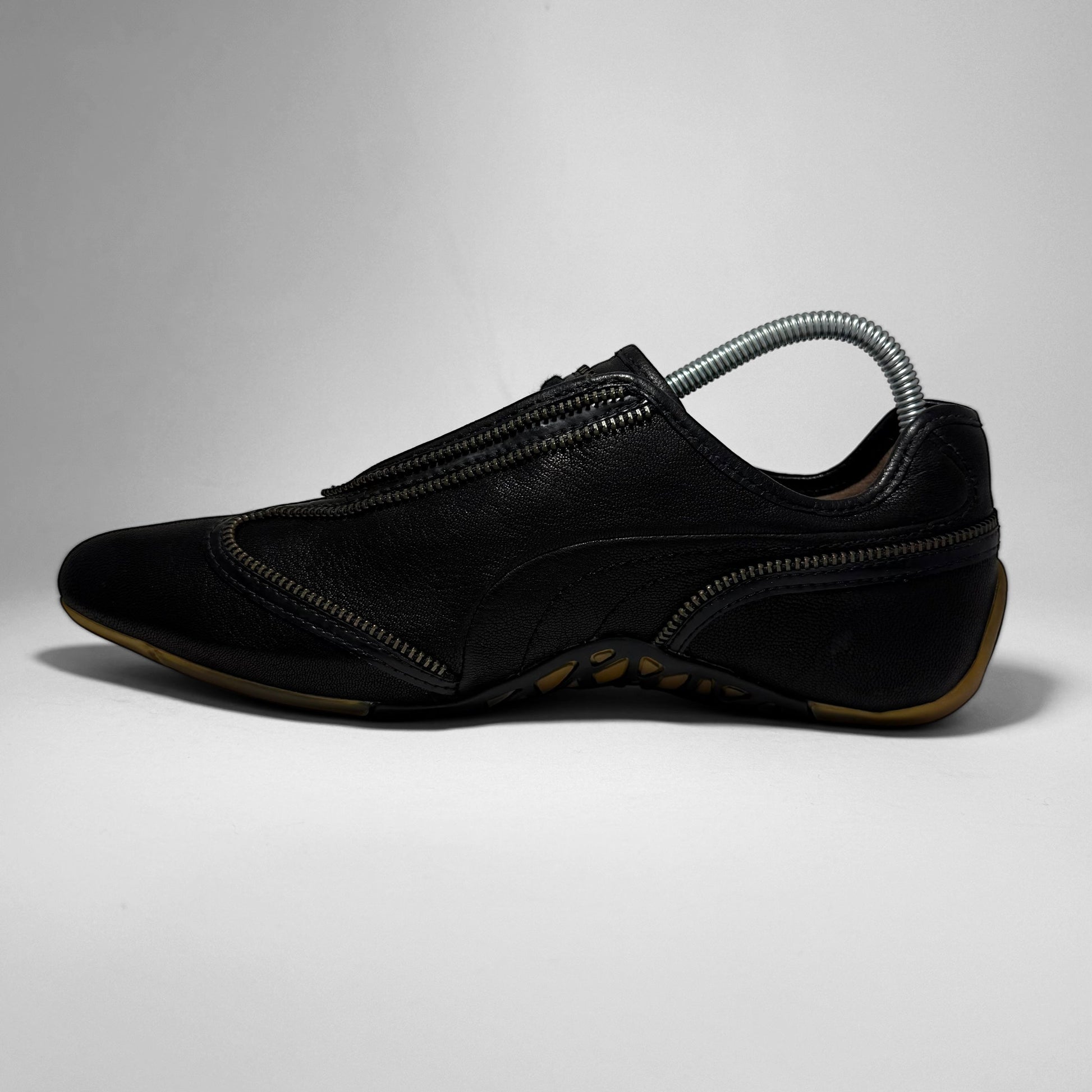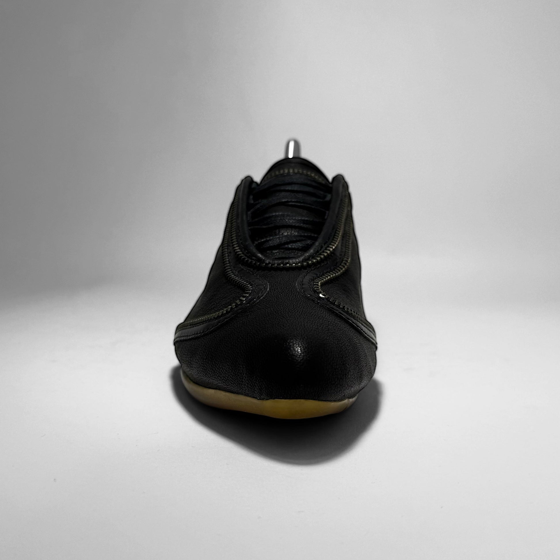 A women’s low-top sneaker featuring black premium leather and a sculptural outsole with gum traction pods and webbed black overlays. Signature curved zippers trace the upper, creating a sleek, asymmetrical look. A bold fusion of performance design and avant-garde minimalism. Made in Italy.