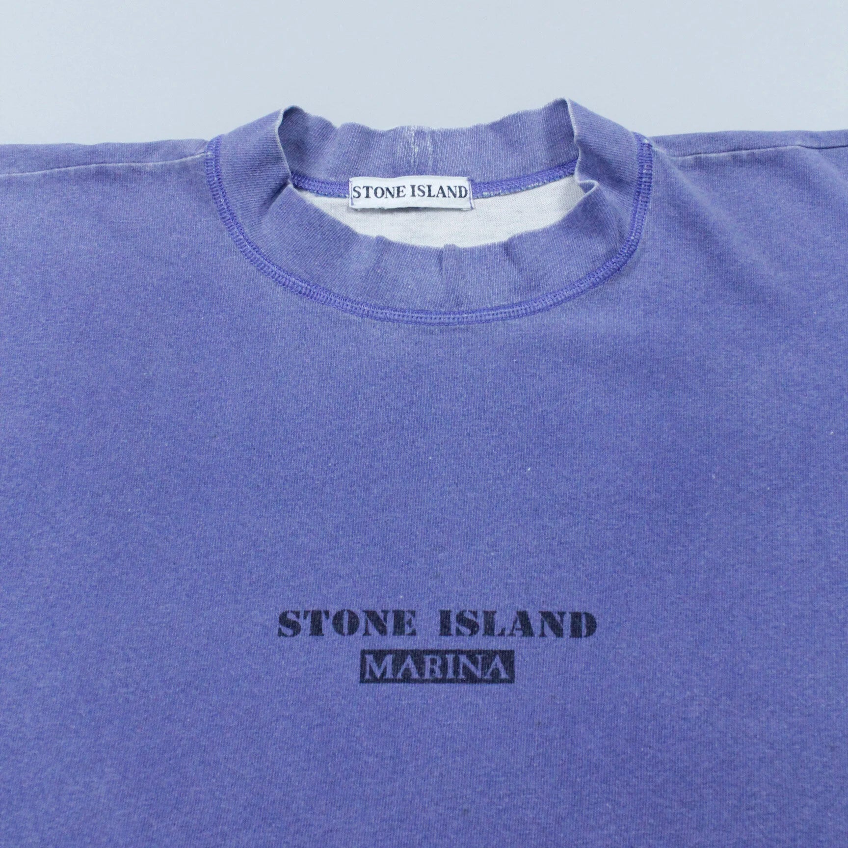 A lightweight garment dyed jersey cotton T-shirt with a mock neck construction and a centred STONE ISLAND MARINA stencil spell out, complete with contrasting marina sleeve striping. This highly breathable jersey cotton T-shirt draws on influence from the nautical world, with a boxy comfort fit and pigmented garment dye process throughout, and a unique stencil spell out achieved through screen printing. With the less common block contrast stencil logo.