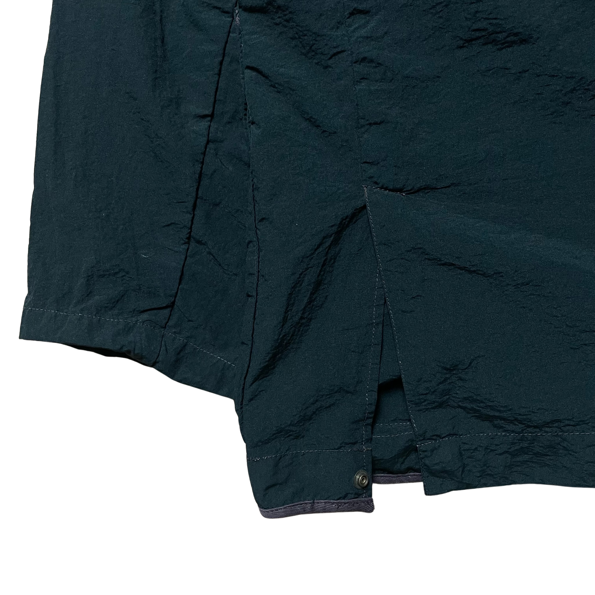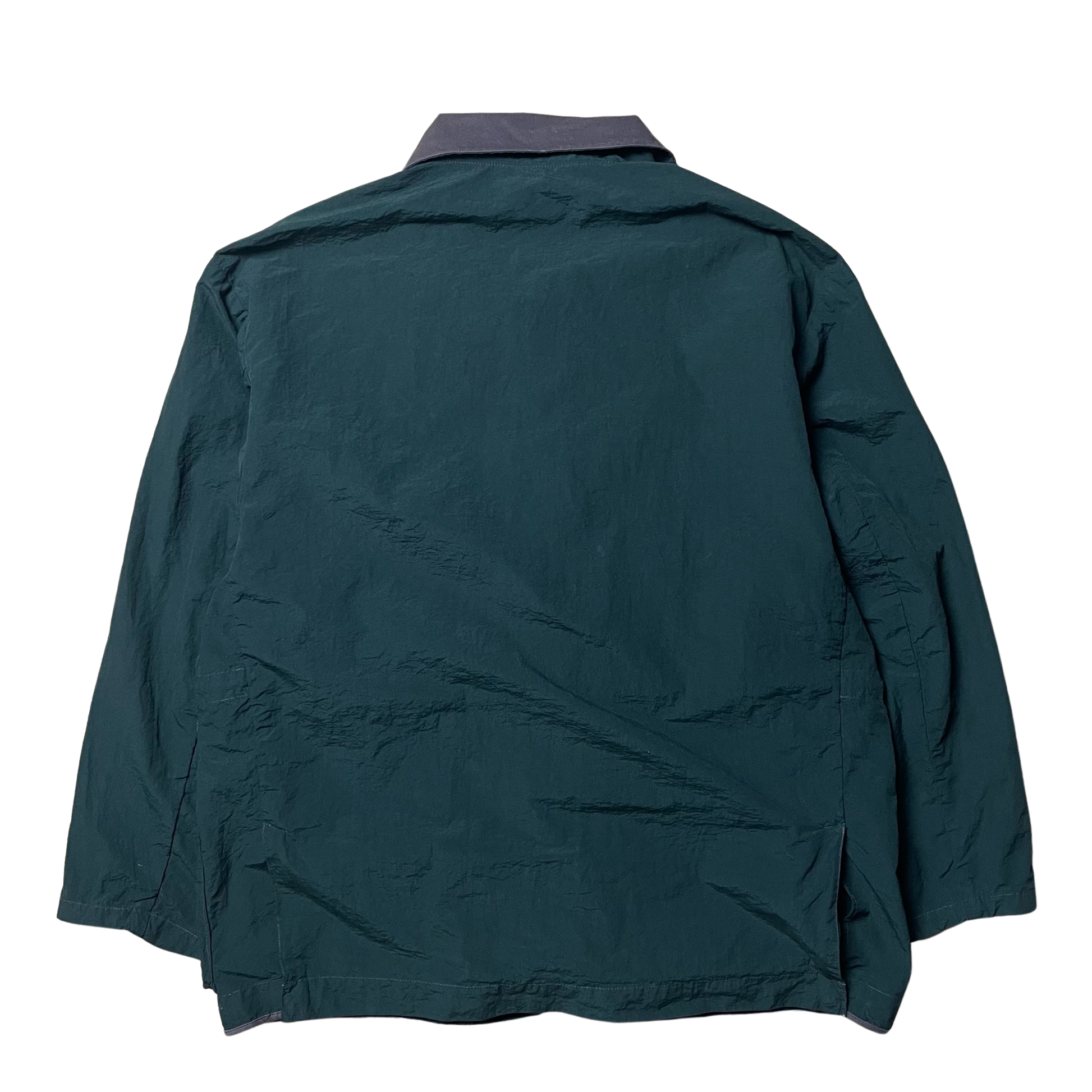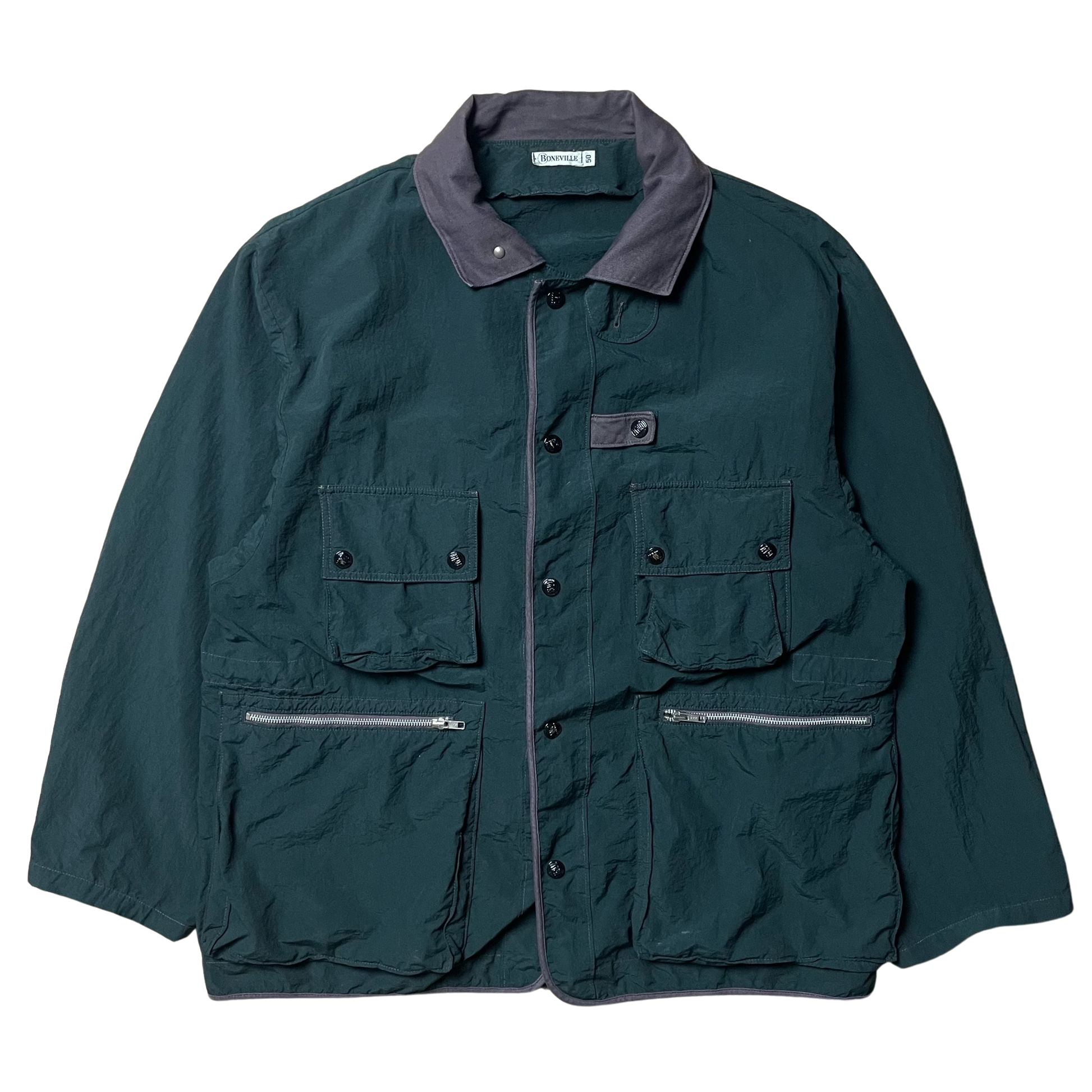 Designed by Massimo Osti.. Highly similar pocket construction to the coveted Stone Island helicopter jackets. Cargo breast pockets. Vertical zippers and internal waist synch fastening. Press stud closure split hem. Large BNV embossed buttons throughout. Small tool/pen holder feature. Contrasting ultra fine corduroy collar. Light nylon cotton crinkle mix.