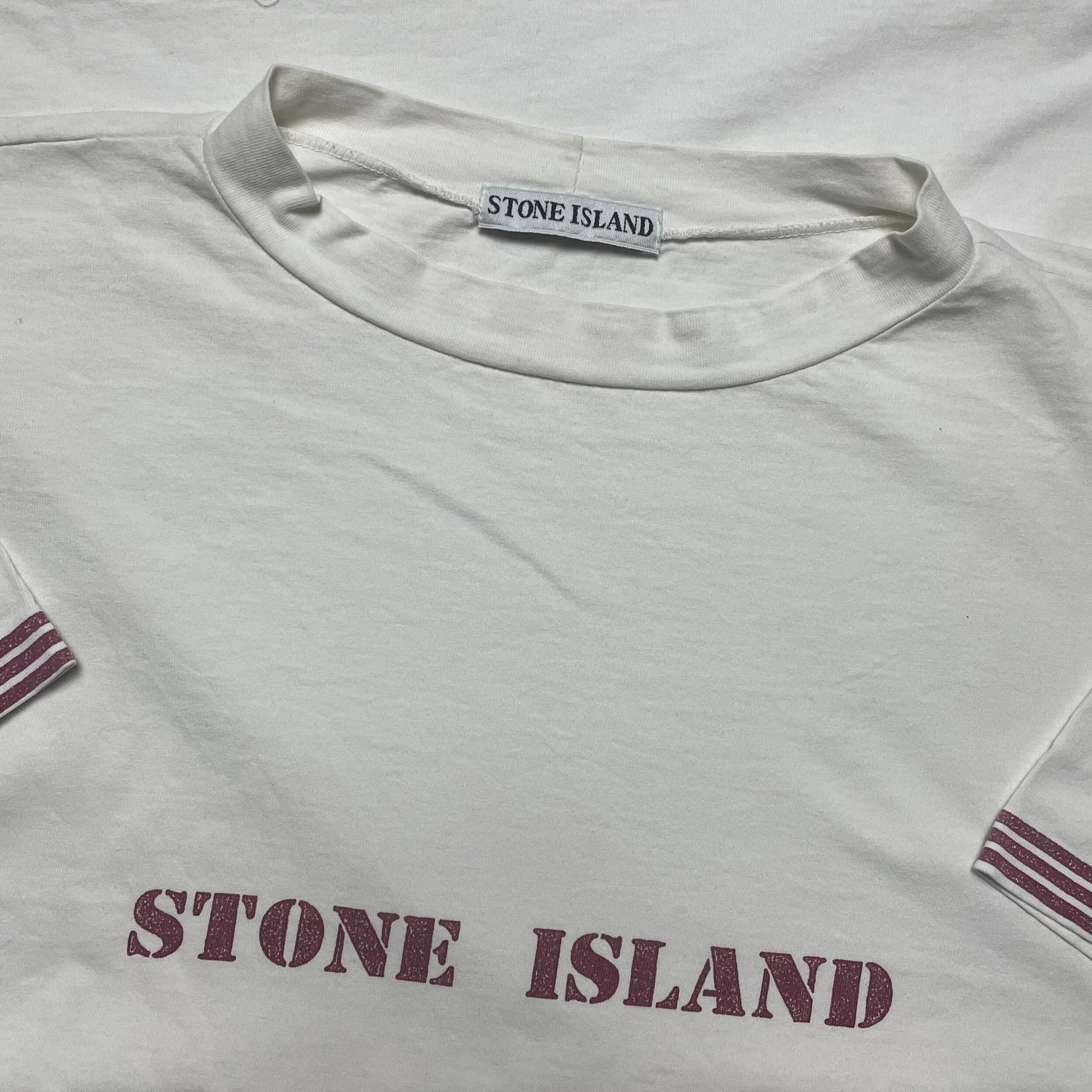 Designed by Massimo Osti. Early 90s rare pigment printed T-shirt. Speckled stencil large Centre spell out. Speckled print marina striping to sleeves. Raspberry red on white print.