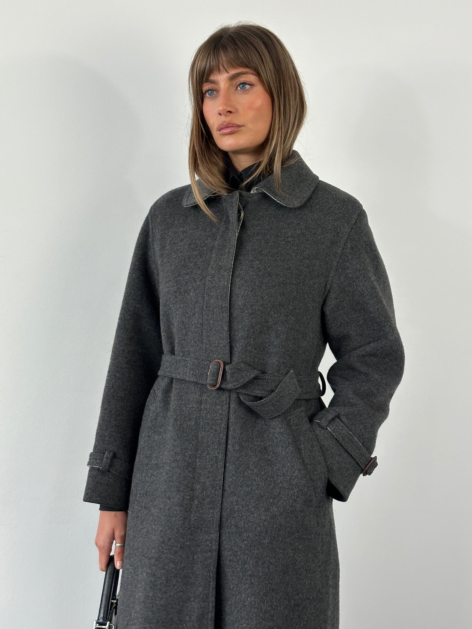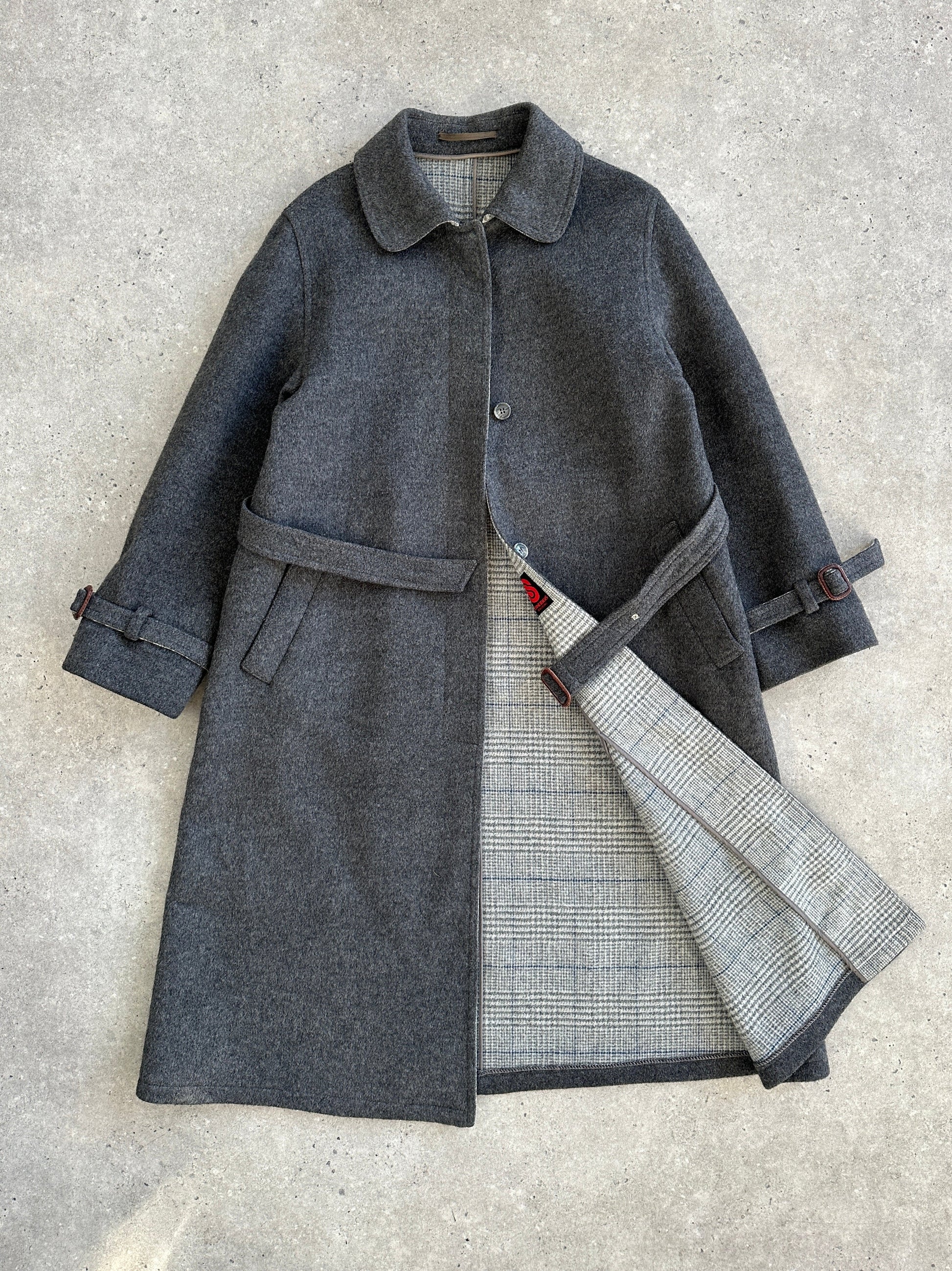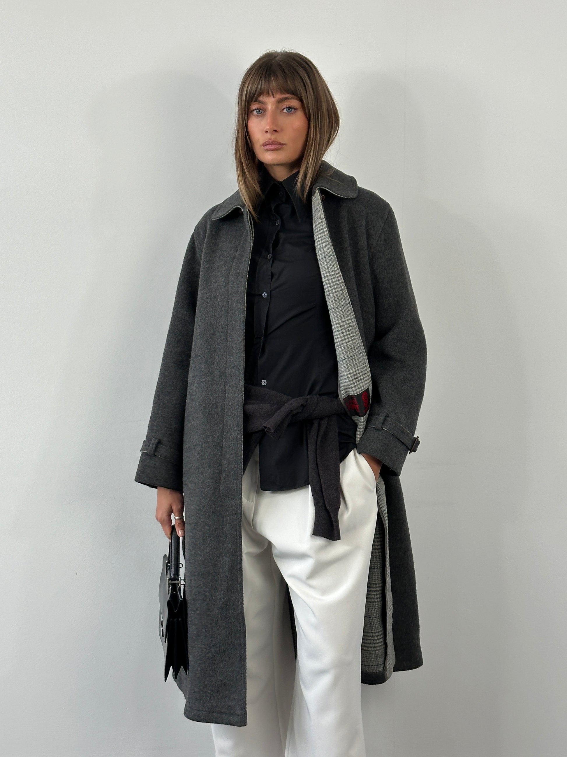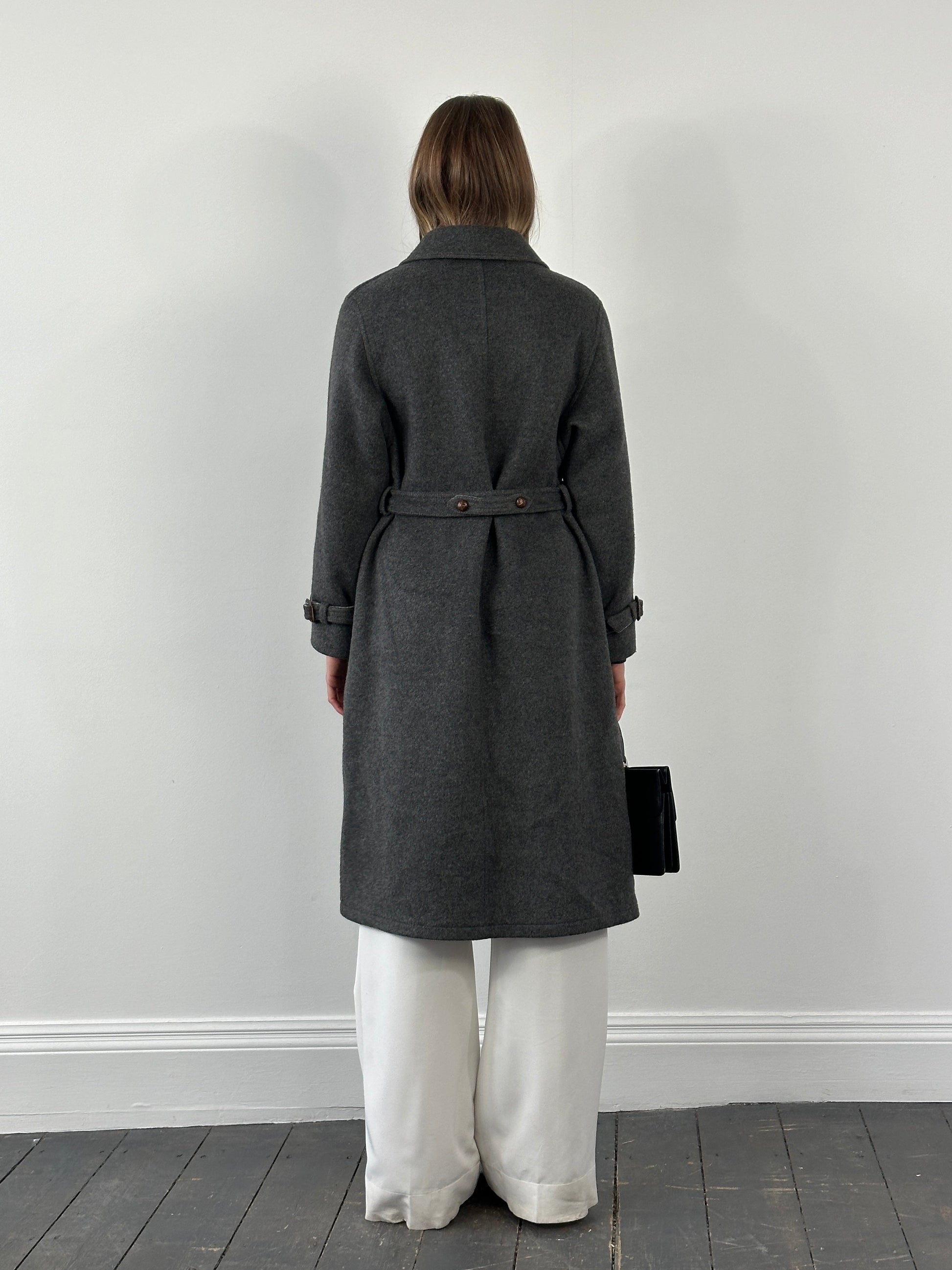 Vintage grey double faced wool coat with a clean concealed placket and belt detail. Features a lighter grey internal check and a minimal 1980s silhouette.