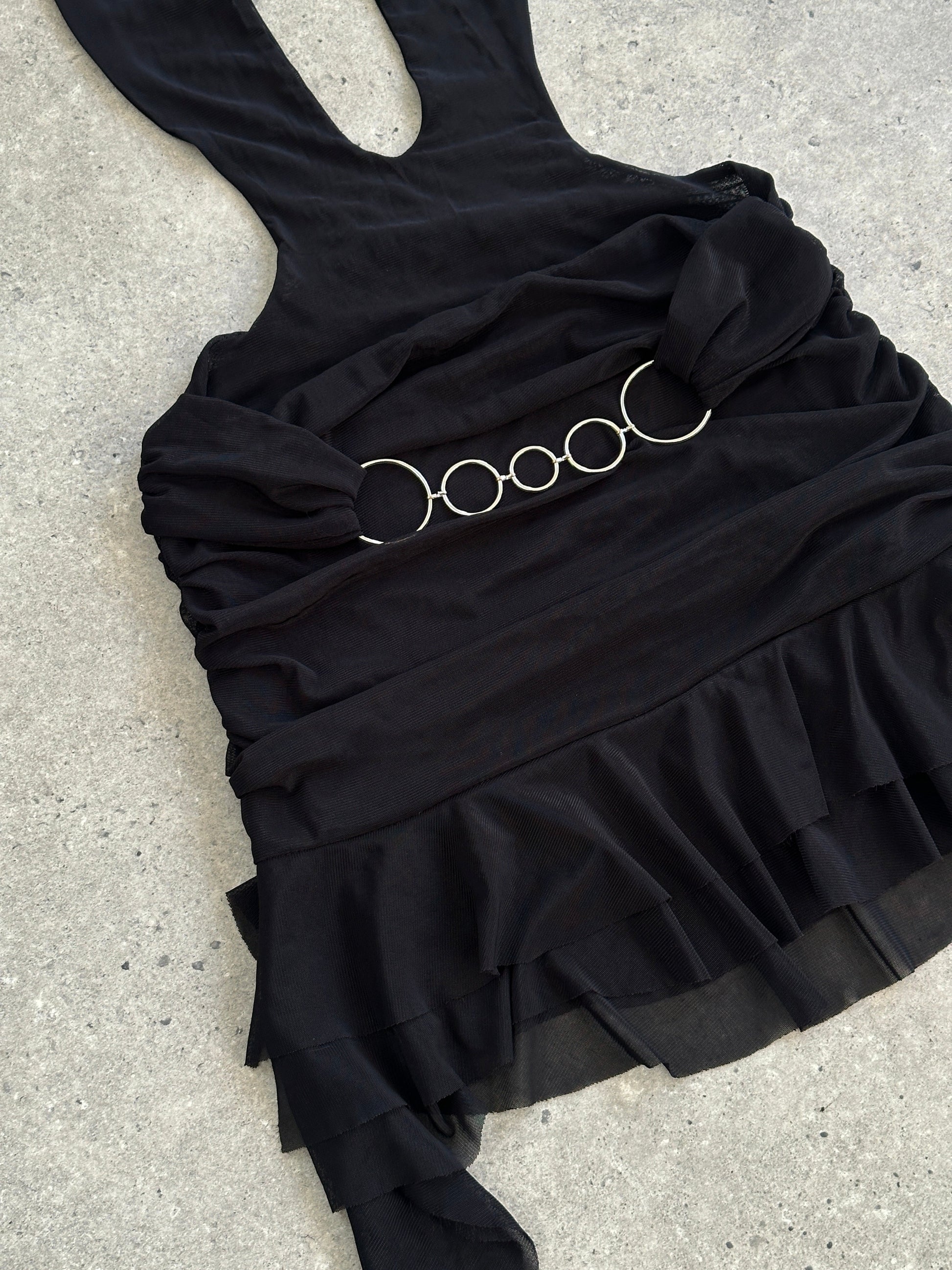 A vintage 2000s layered ruffle mini skirt in a deep black tone with a soft draped overlay. A playful sculptural silhouette finished with top overlay and metal ring detailing at the back.