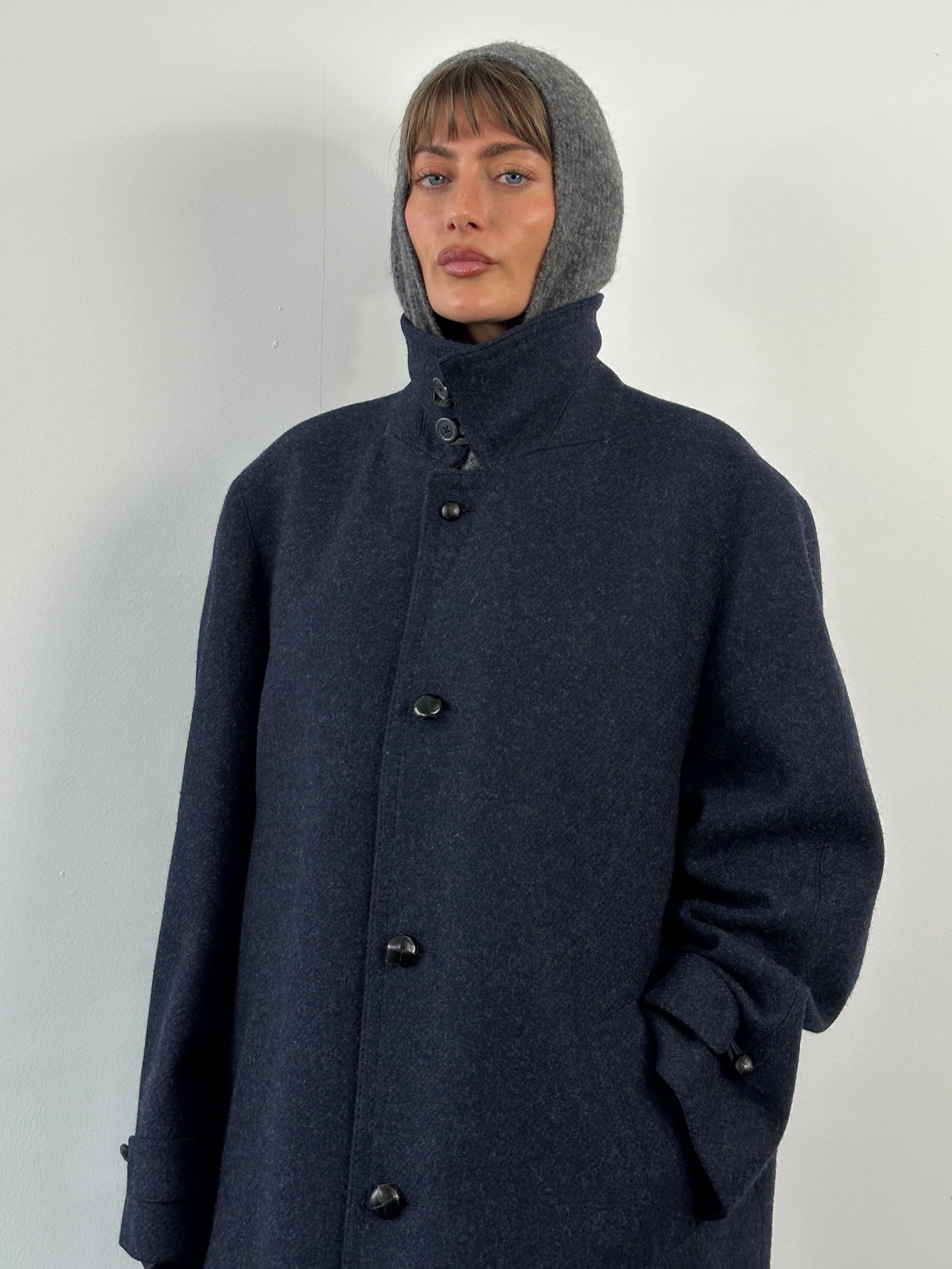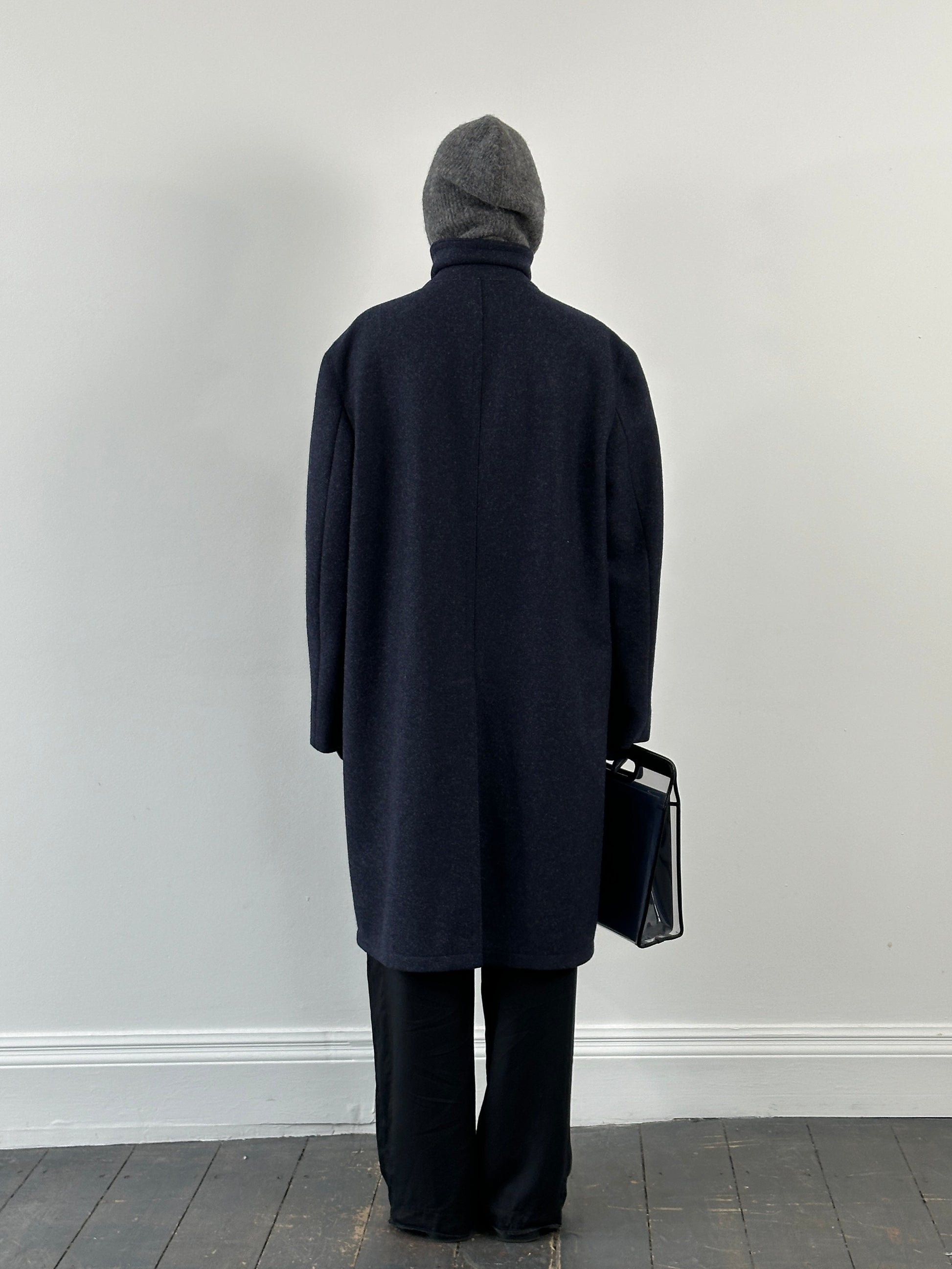 A vintage 1990s pure wool single breasted coat in a deep navy tone with a high neck fastening. A clean oversized silhouette with concealed placket, softly structured drape and understated refinement.