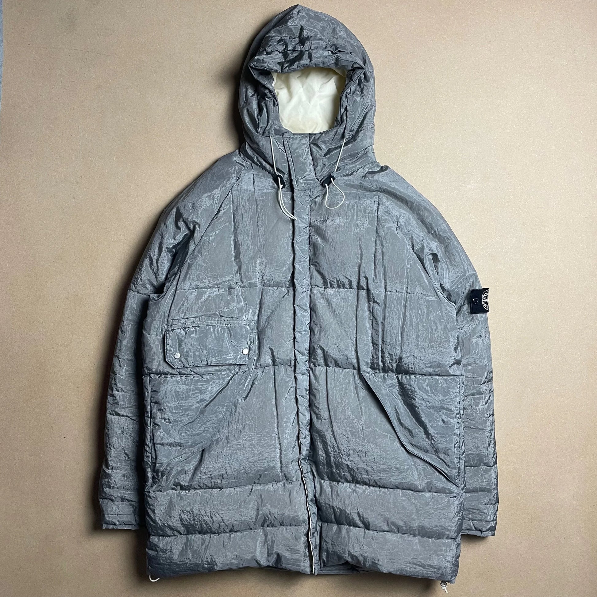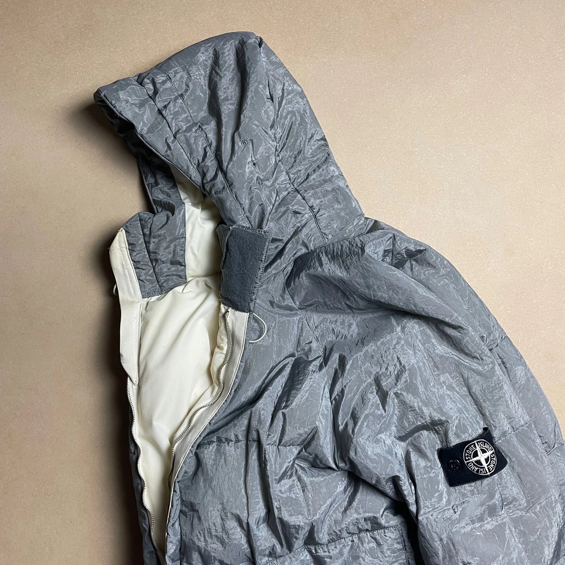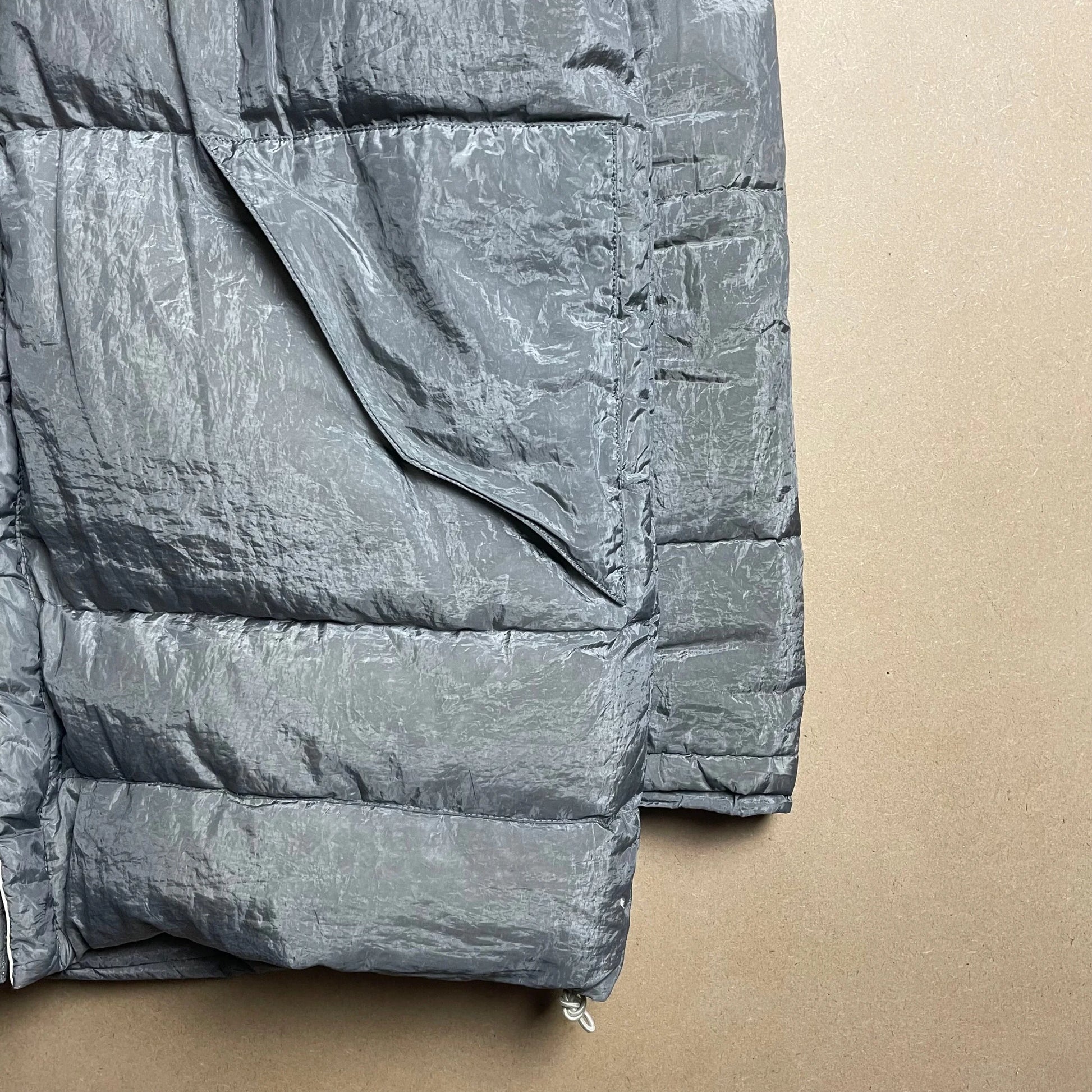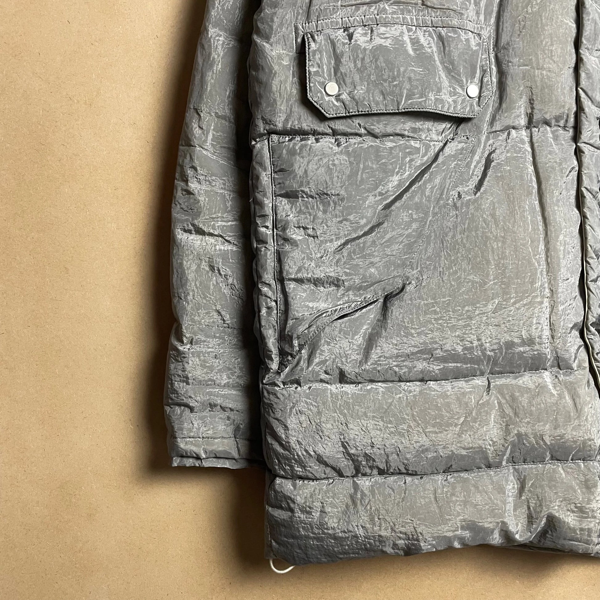Designed by Paul Harvey. Iconic and innovative material with multiple functions for its wearer. Pure metal shell with steel based fabric properties. Hooded parka style design with two patch flap closure cargo pockets and small utility pocket. Silk lined filled with down. Features a stainless steel Lampo branded zipper. Hood fastening wires.
