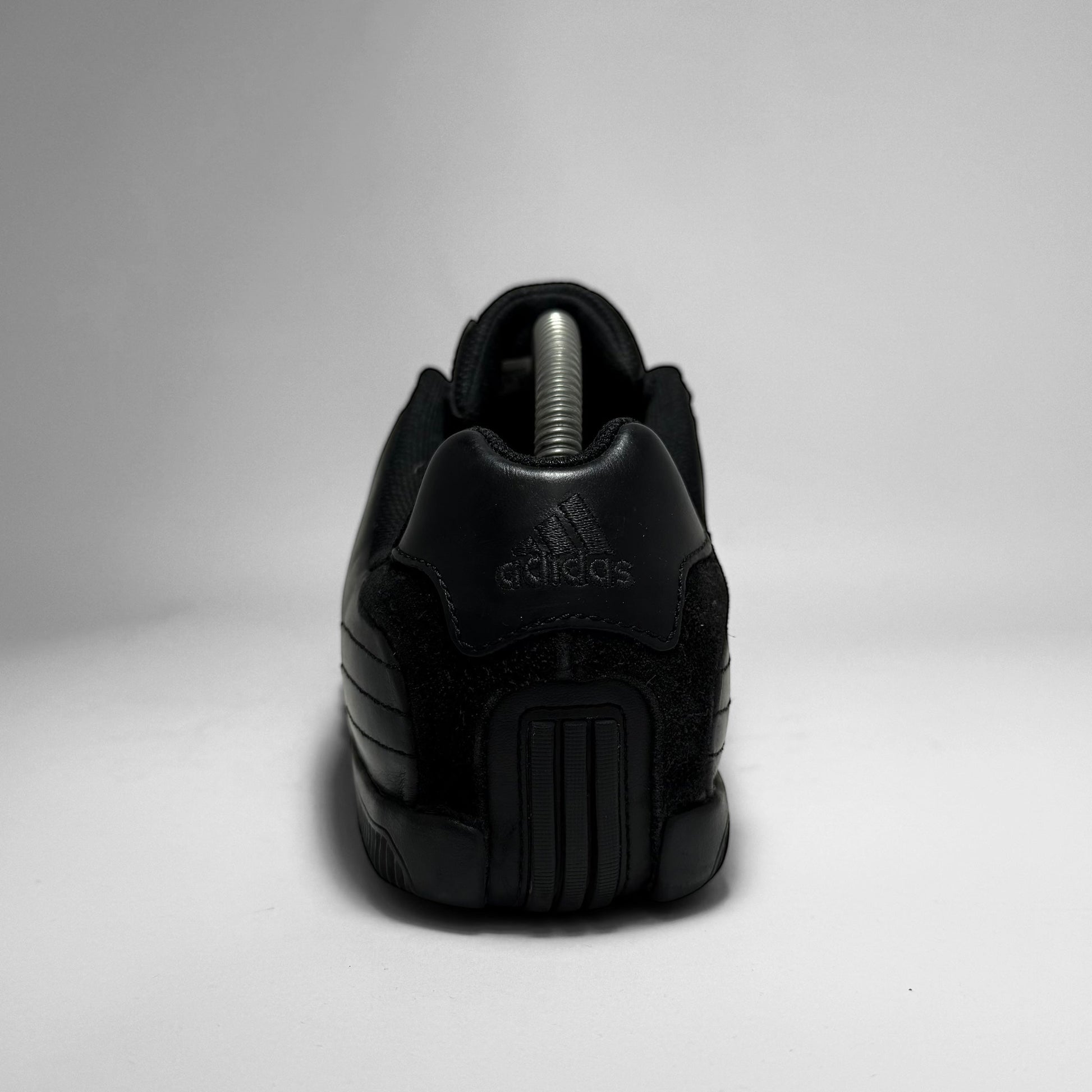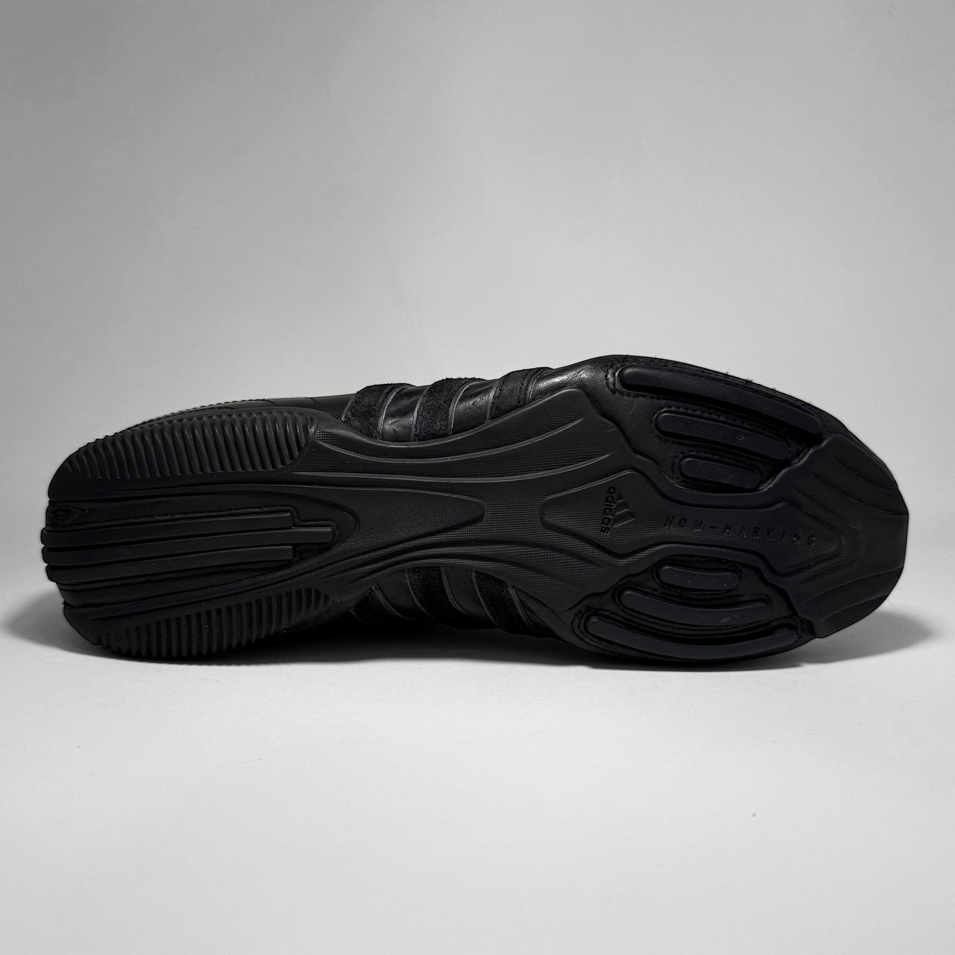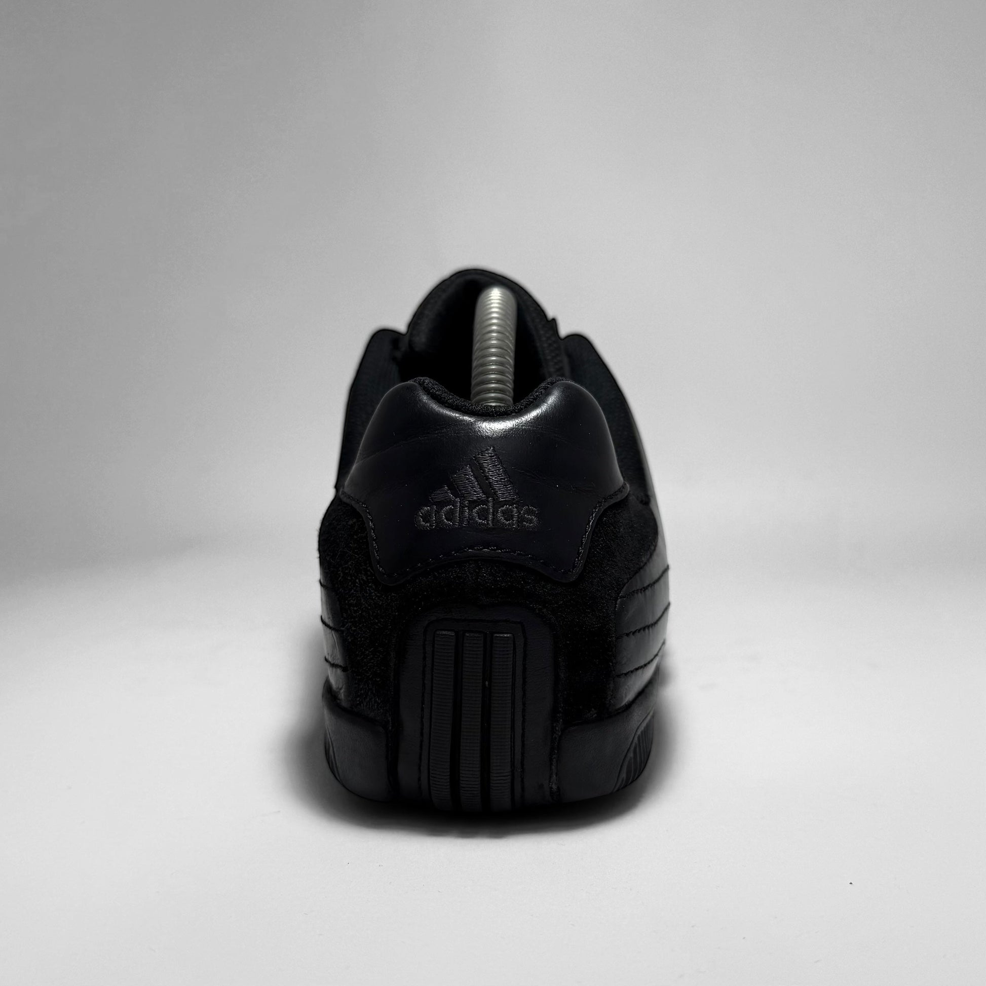 The upper is crafted from smooth black leather combined with suede detailing on the Three Stripes and heel panel, adding subtle texture contrast. The tongue and inner lining use padded mesh for comfort and breathability. The outsole is a non-marking rubber unit with a segmented tread pattern for multidirectional grip and flexibility, emphasizing stability and smooth ground contact.