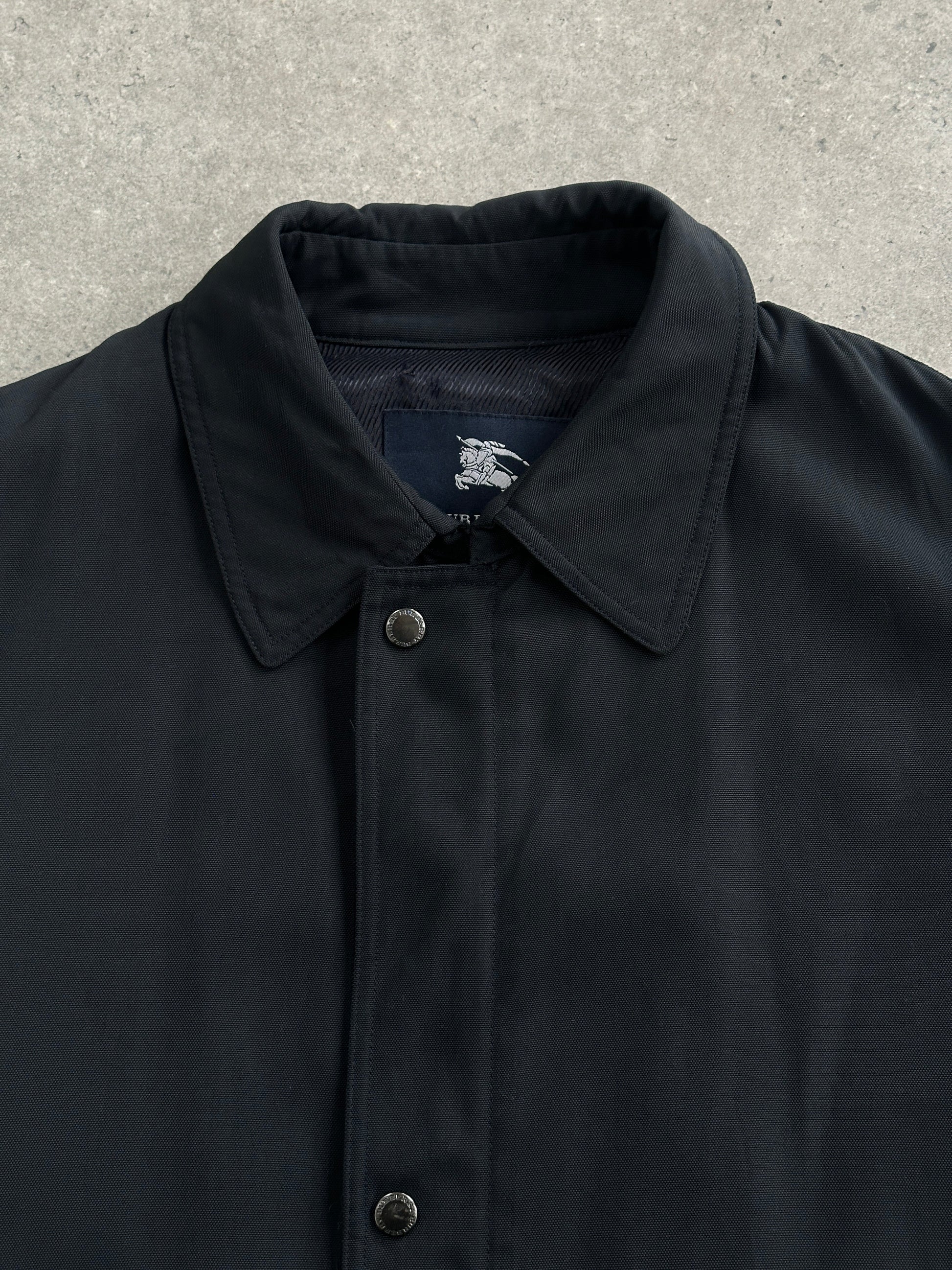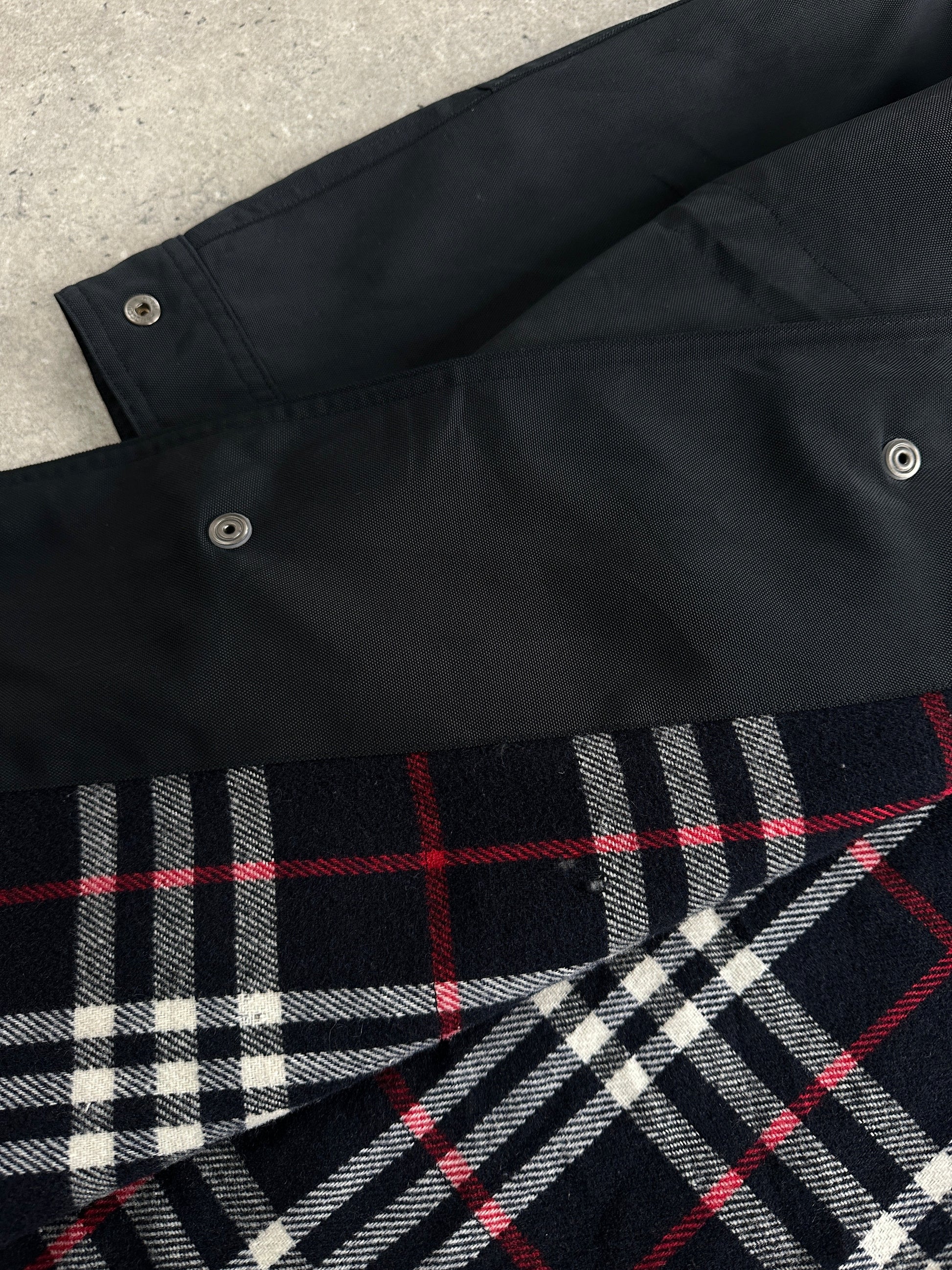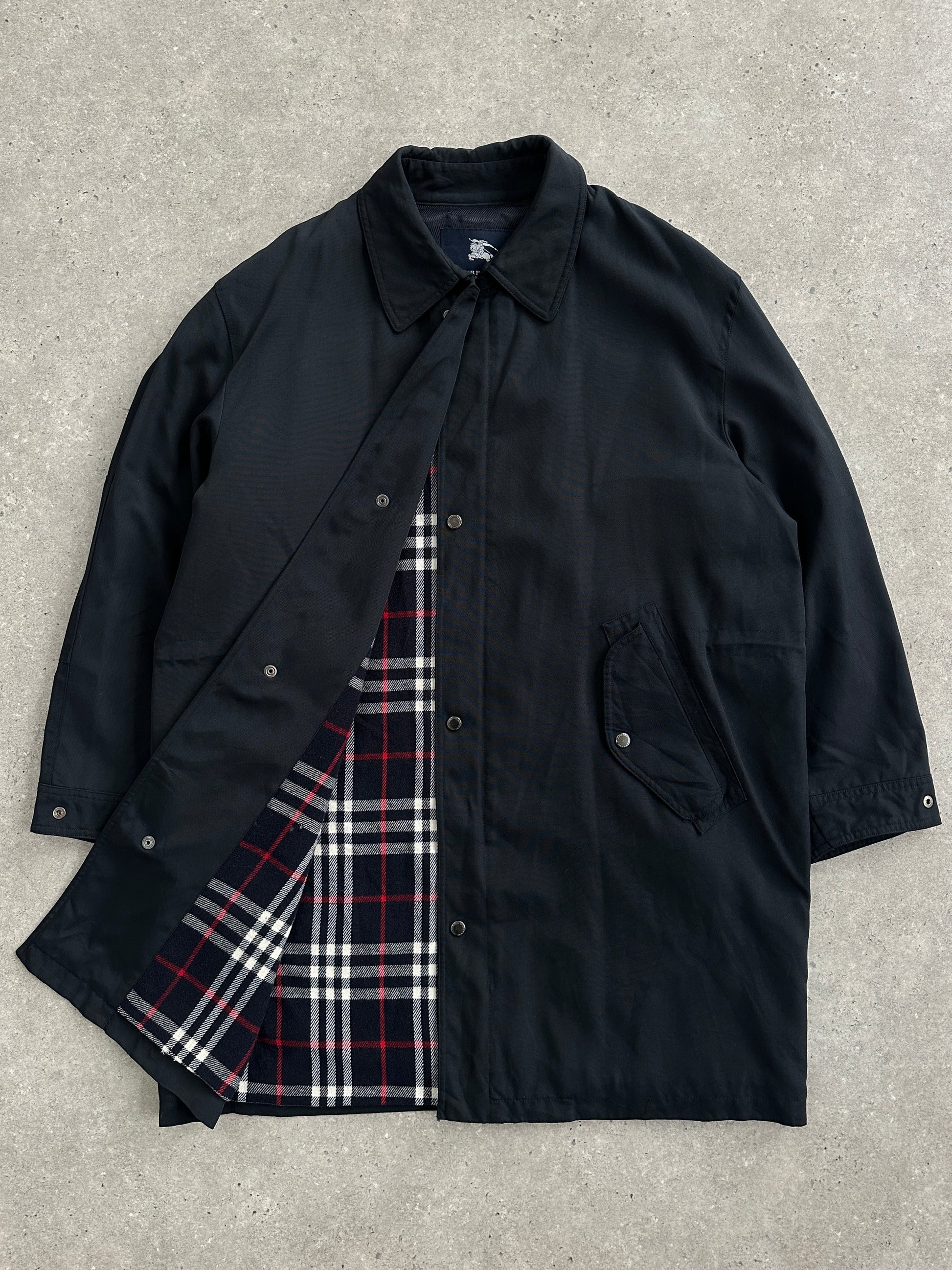 Vintage Burberry London 1990s field trench coat with signature Nova Check wool blend lining and engraved metal buttons. Features a waterproof outer shell and classic relaxed silhouette.
