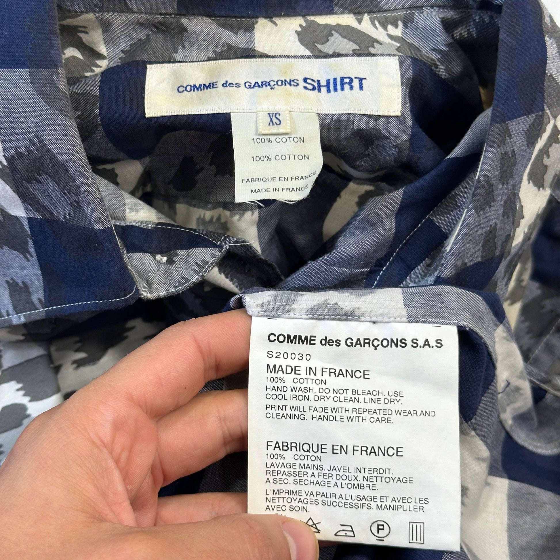 Beautiful early 2000’s Comme Des Garçons blue checkered shirt with overlayed camo design, very unique print, lovely made in France piece high quality.