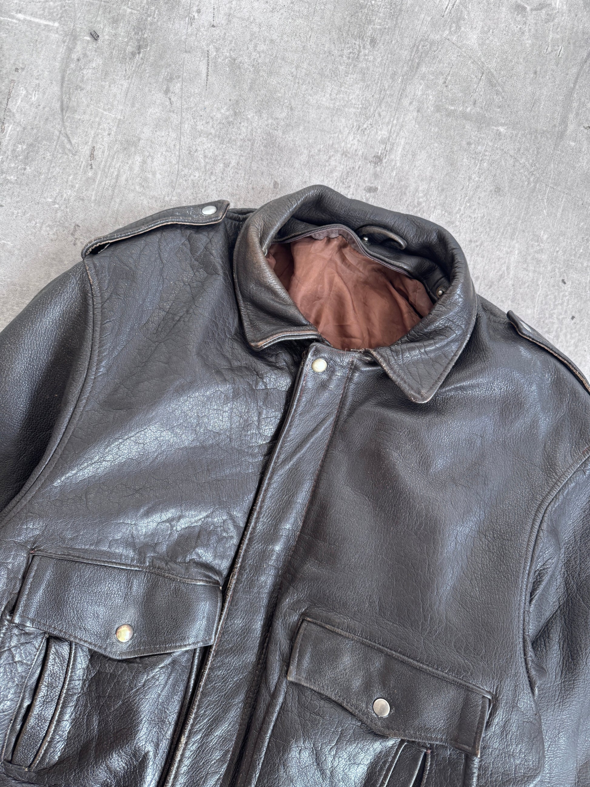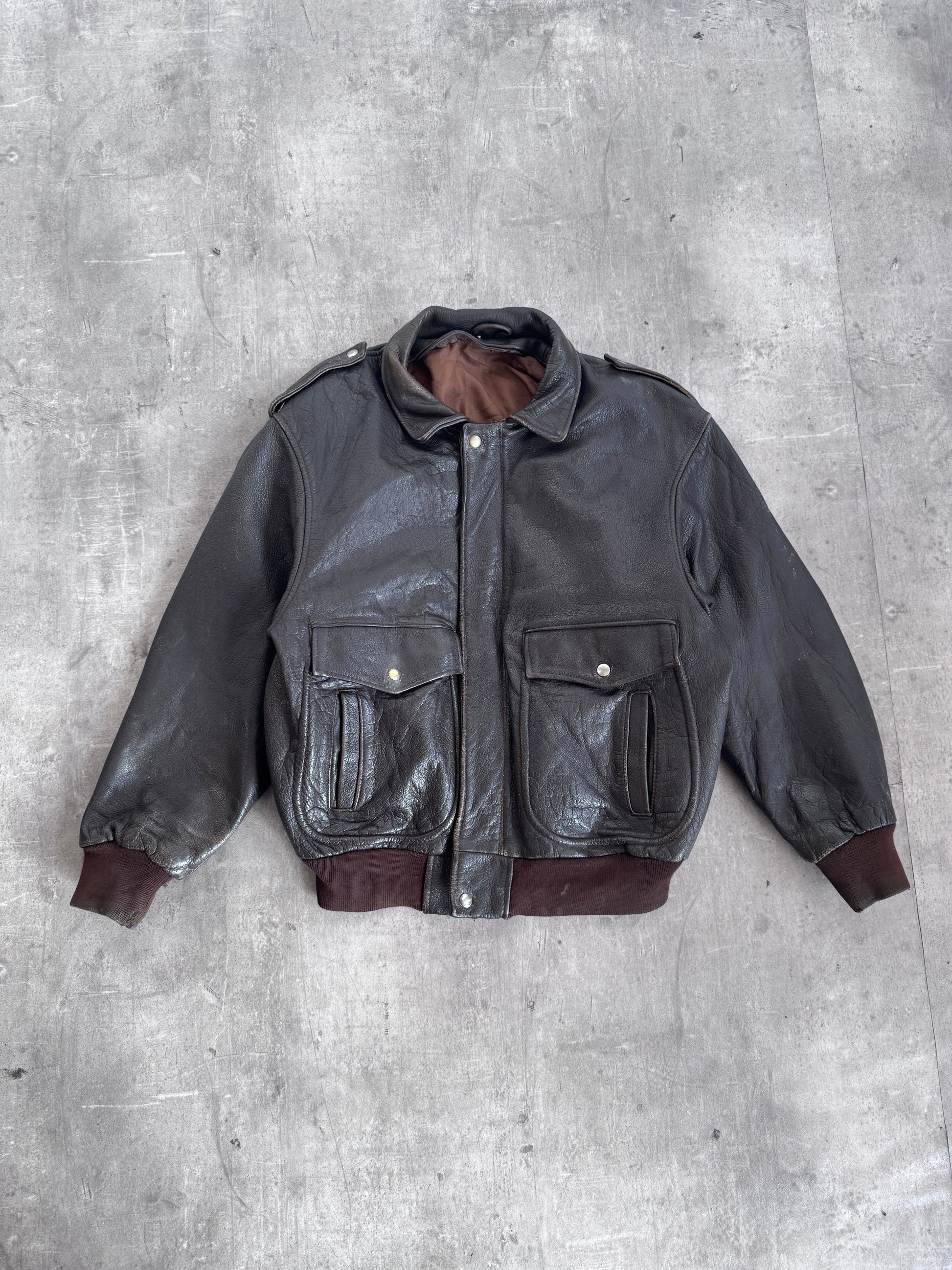 Bring timeless rugged style to your wardrobe with the Deep Brown Vintage Leather Bomber Jacket. Crafted from premium vintage leather, this jacket features a classic bomber silhouette with ribbed cuffs, hem, and collar, delivering a structured yet comfortable fit. Its rich, deep brown tone and worn-in character add authenticity and vintage appeal, making it a versatile layering piece for streetwear and casual outfits alike.
