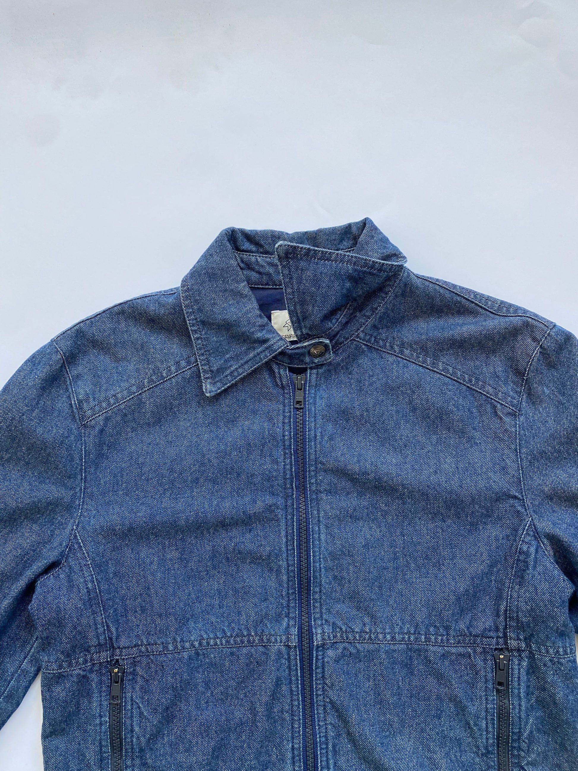90's Armani Jeans Cropped Denim Jacket. 100% Cotton, two zip up pockets, with contrasted grey upturned sleeves at the cuff and along the hem. Jacket has a cropped, boxy fit, with button at top of zip underneath the collar.