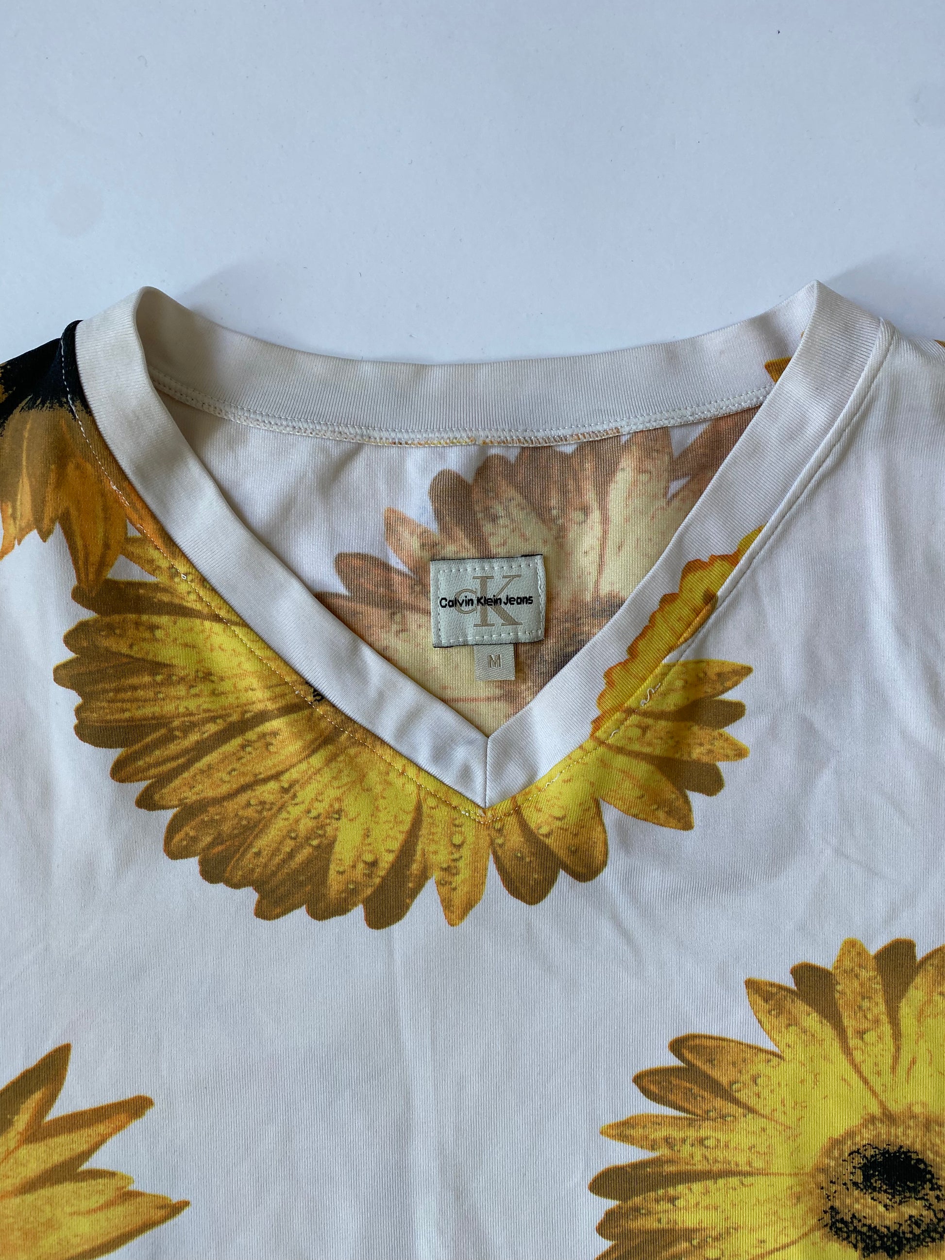Calvin Klein Flower Print Dress. Summery White body-con dress with yellow sunflower print, and V-neck neckline.