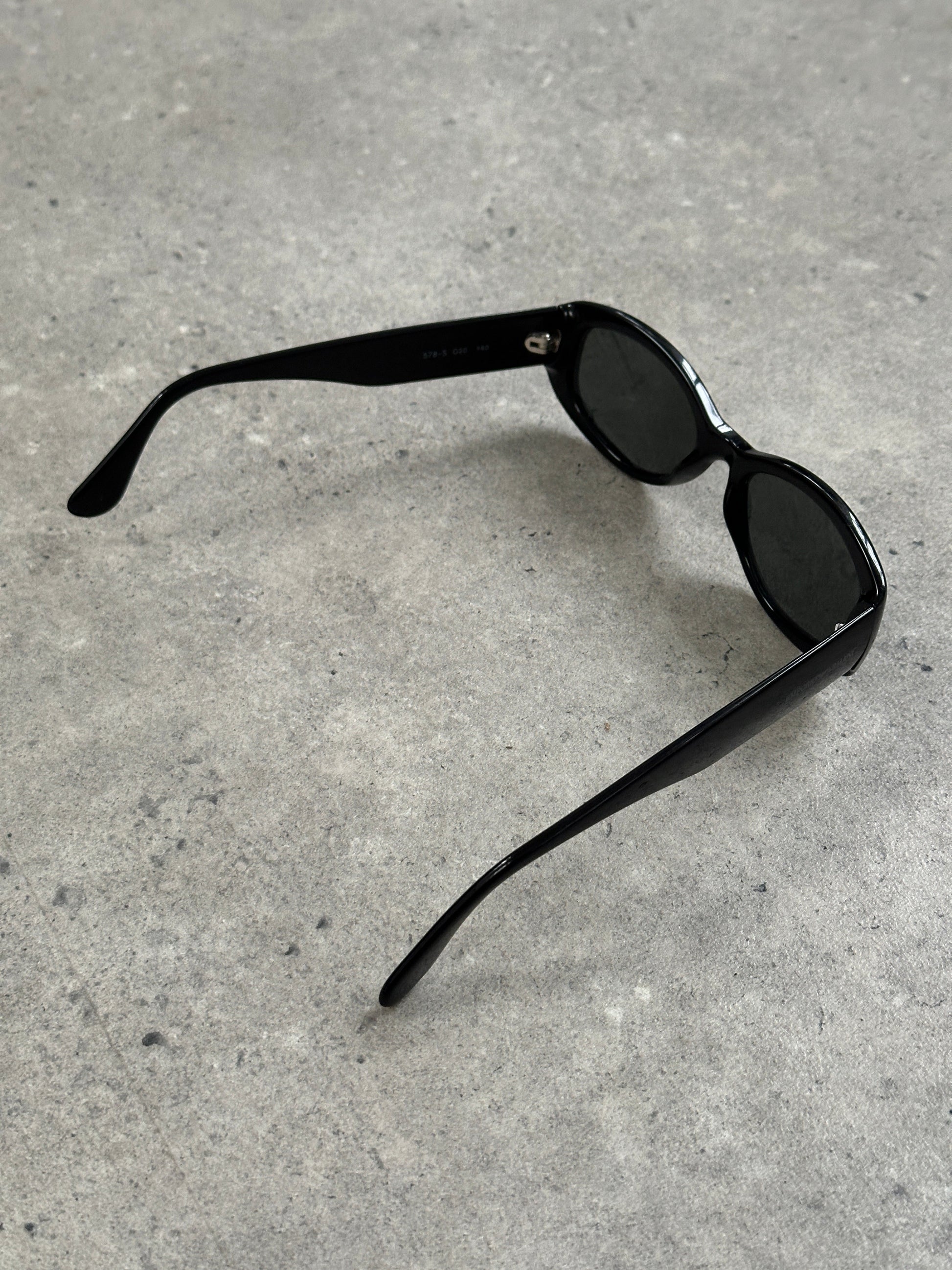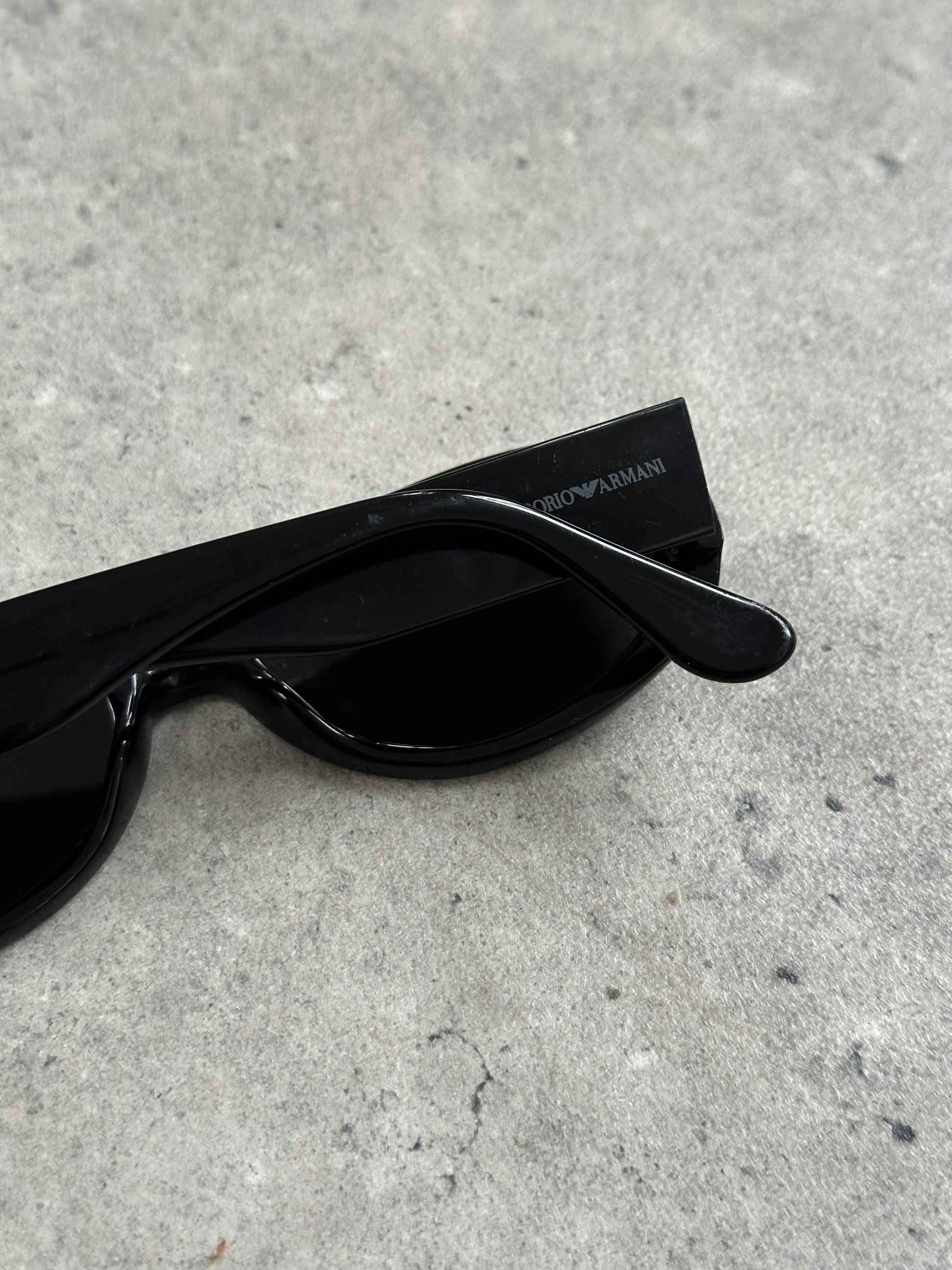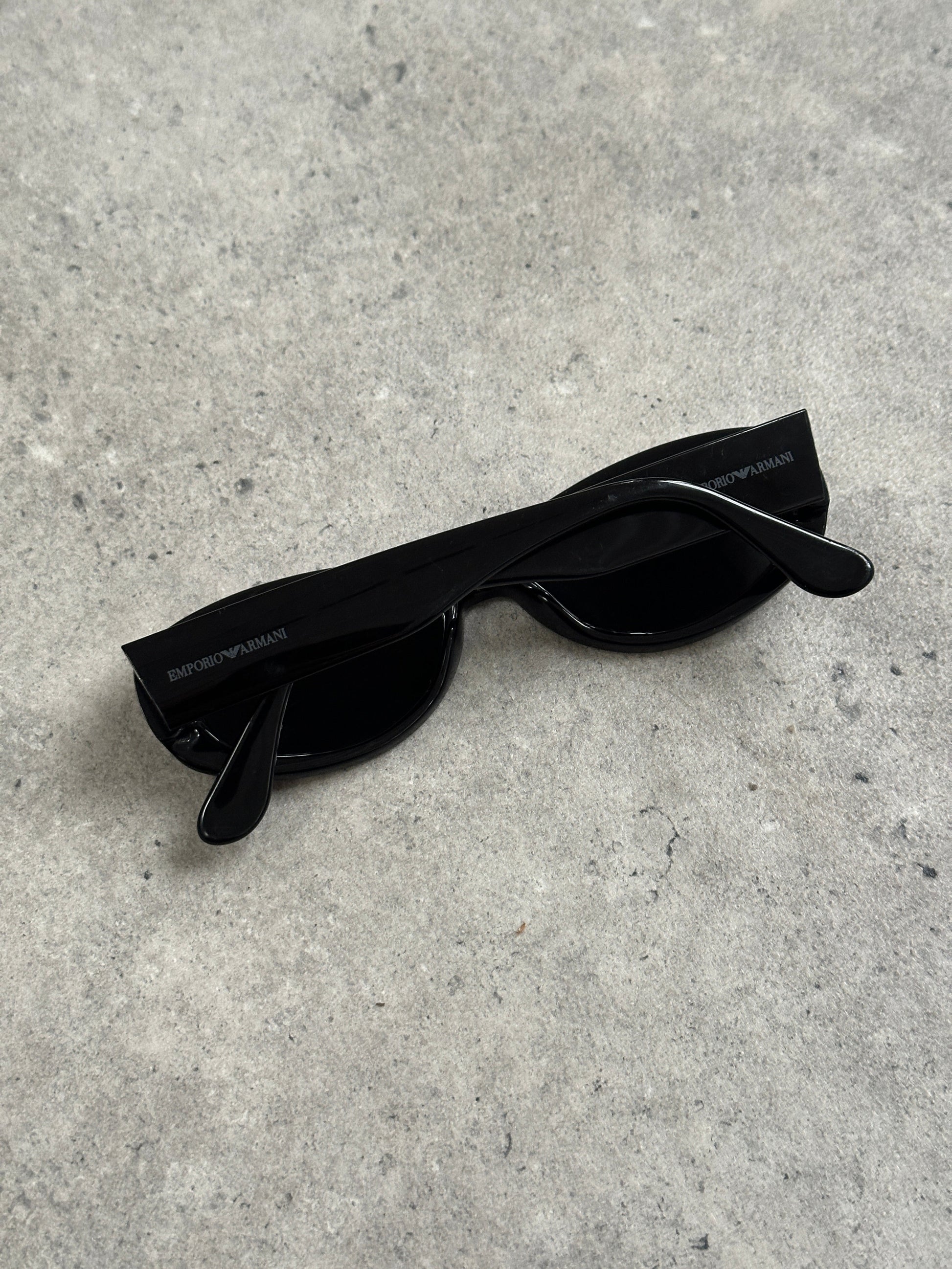 Vintage early 2000s black sunglasses by Emporio Armani, featuring a sleek oval rectangular silhouette with a softly curved frame profile. Crafted from polished black acetate with slim arms and subtle Emporio Armani logo detailing at the temple for a clean, minimalist finish.