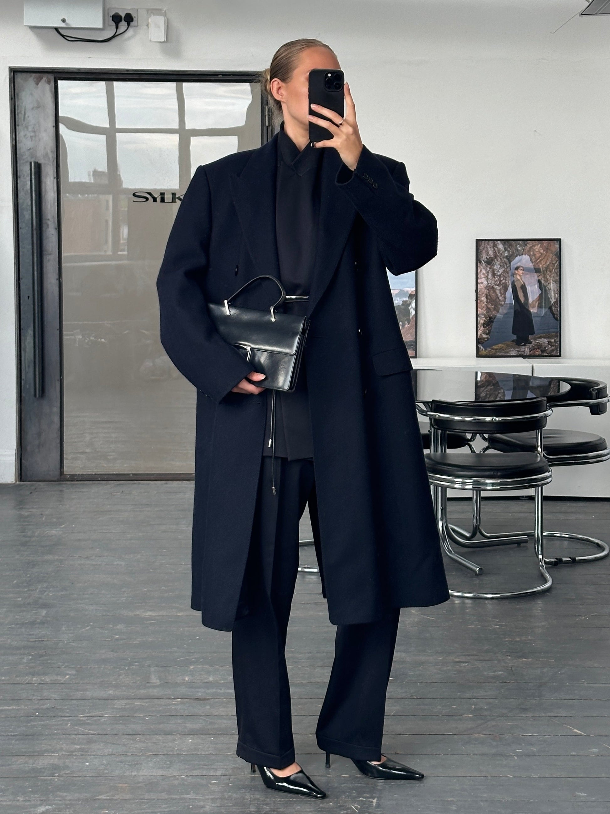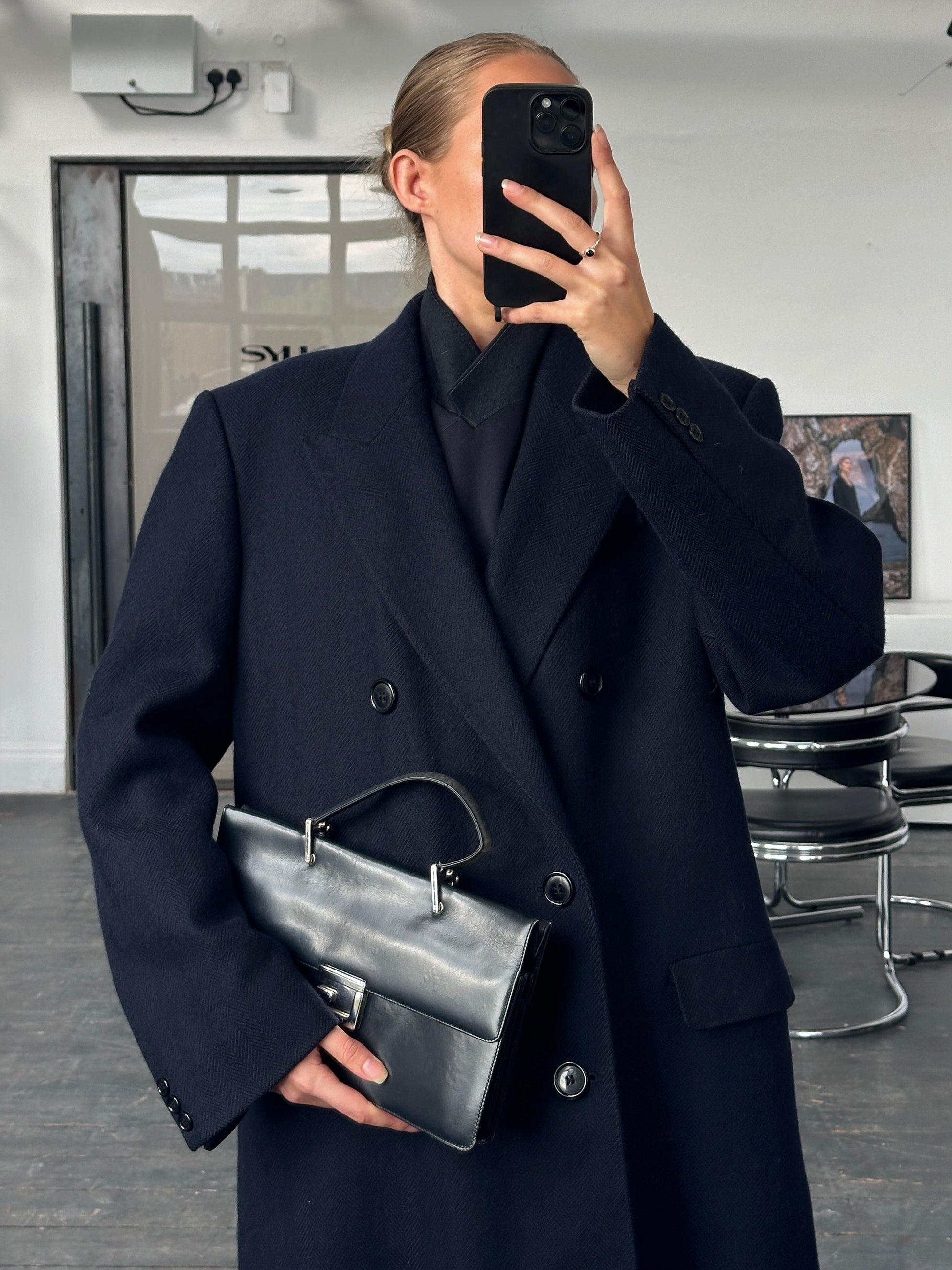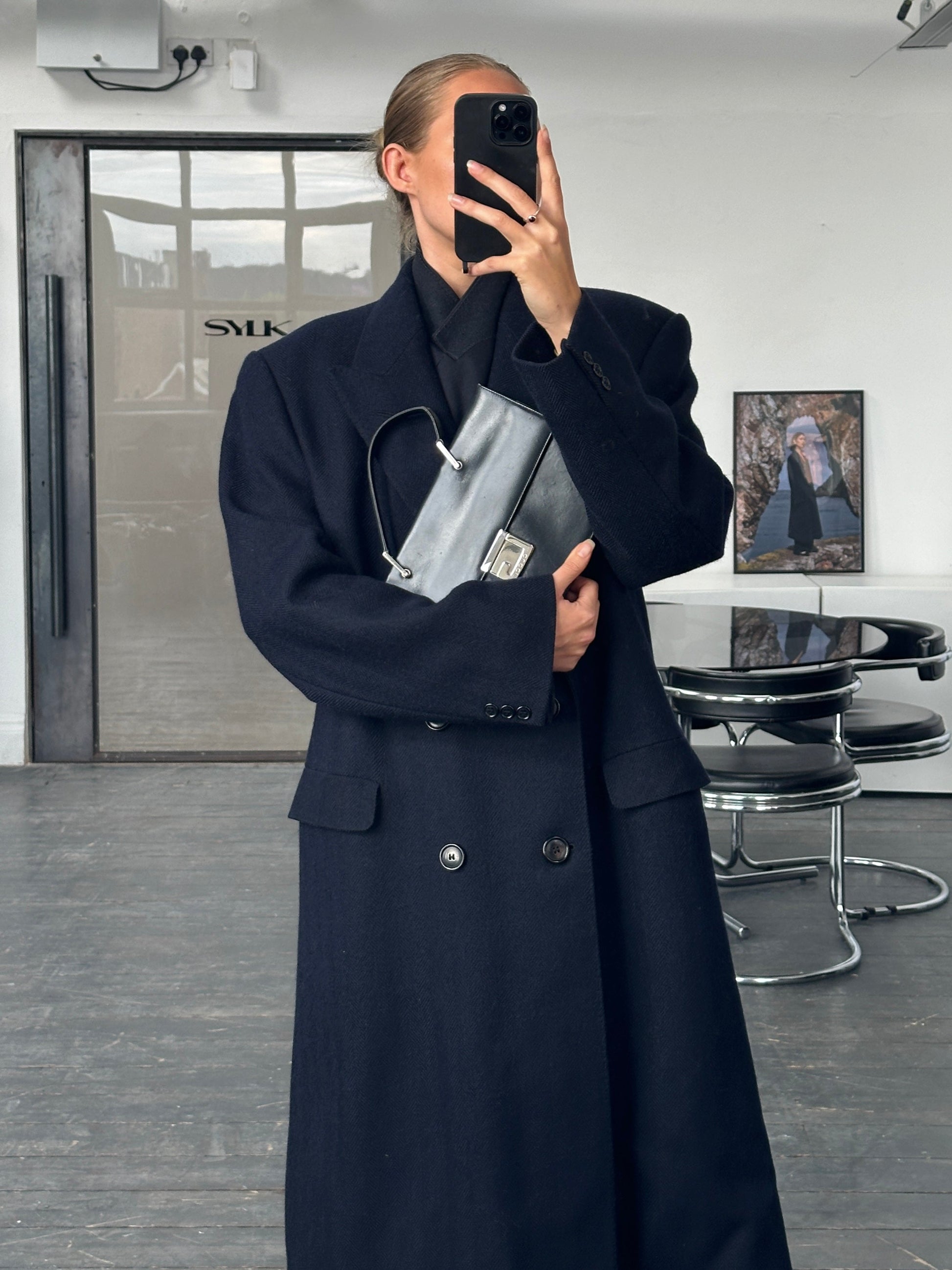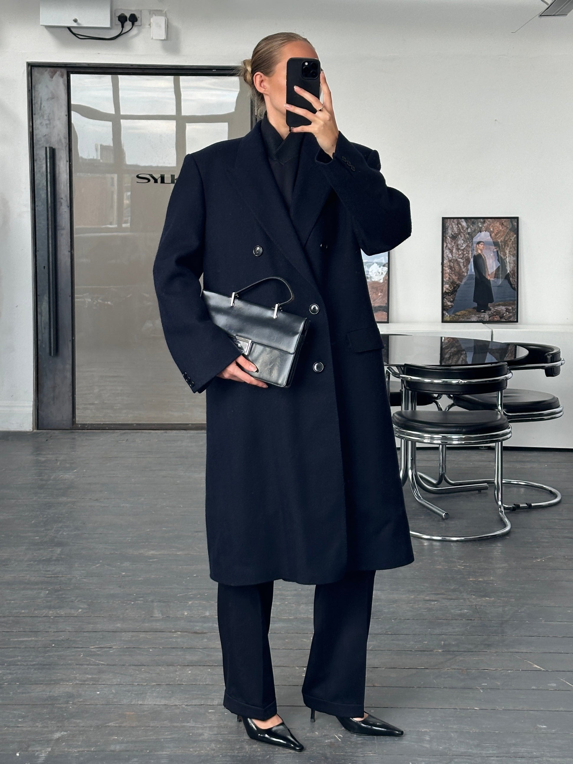 1990s British overcoat, crafted in England from pure new wool. Double breasted silhouette with peak lapels and refined tailoring that embodies understated heritage luxury.