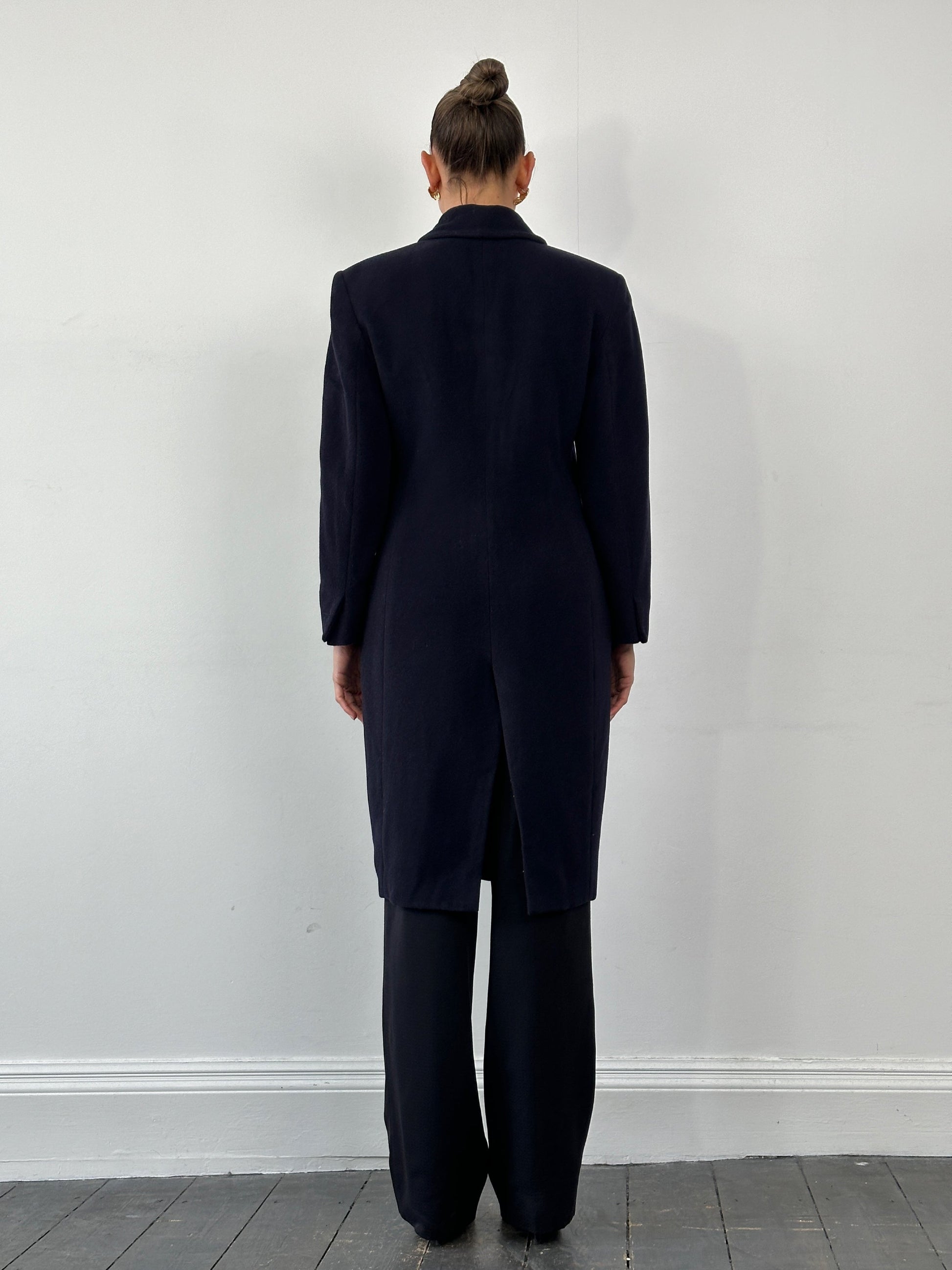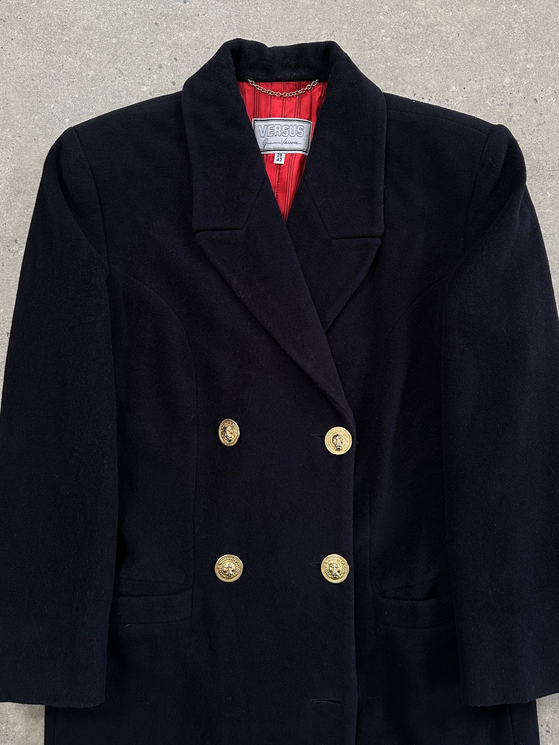 Versus by Gianni Versace early 90s double-breasted coat in wool, detailed with signature gold Medusa buttons and bold red striped lining — a statement piece of Versace power dressing.