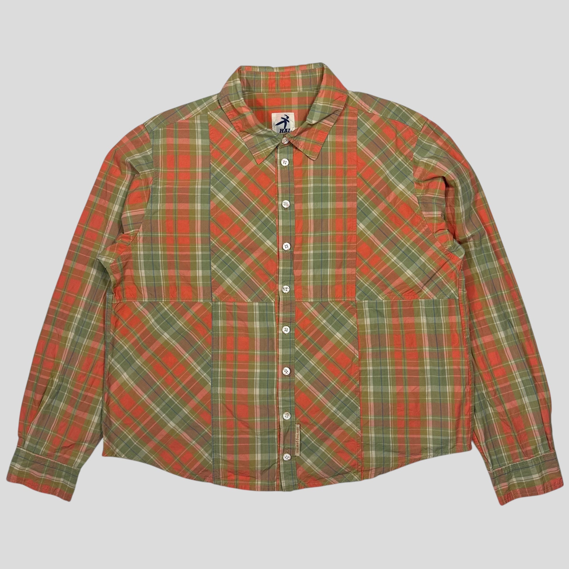 Rare 1990’s Hai Sporting by Issey Miyake asymmetrical orange and green plaid shirt, lovely vibrant check with mismatched panels.