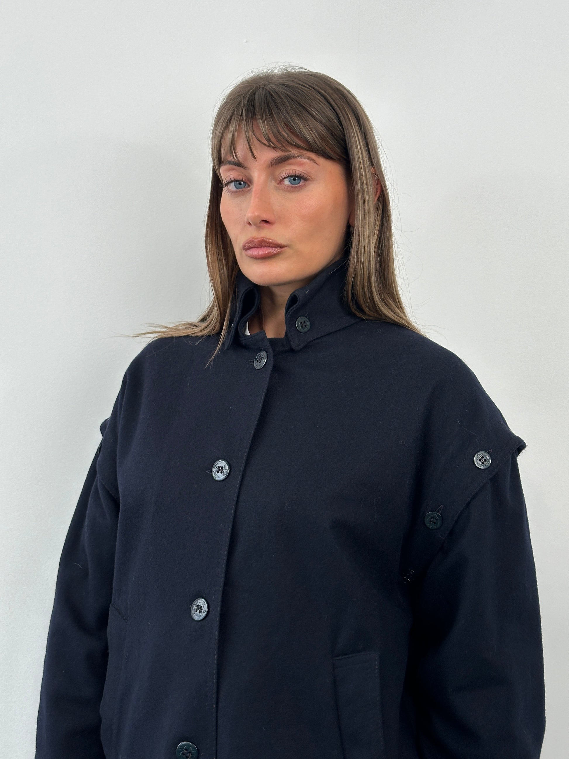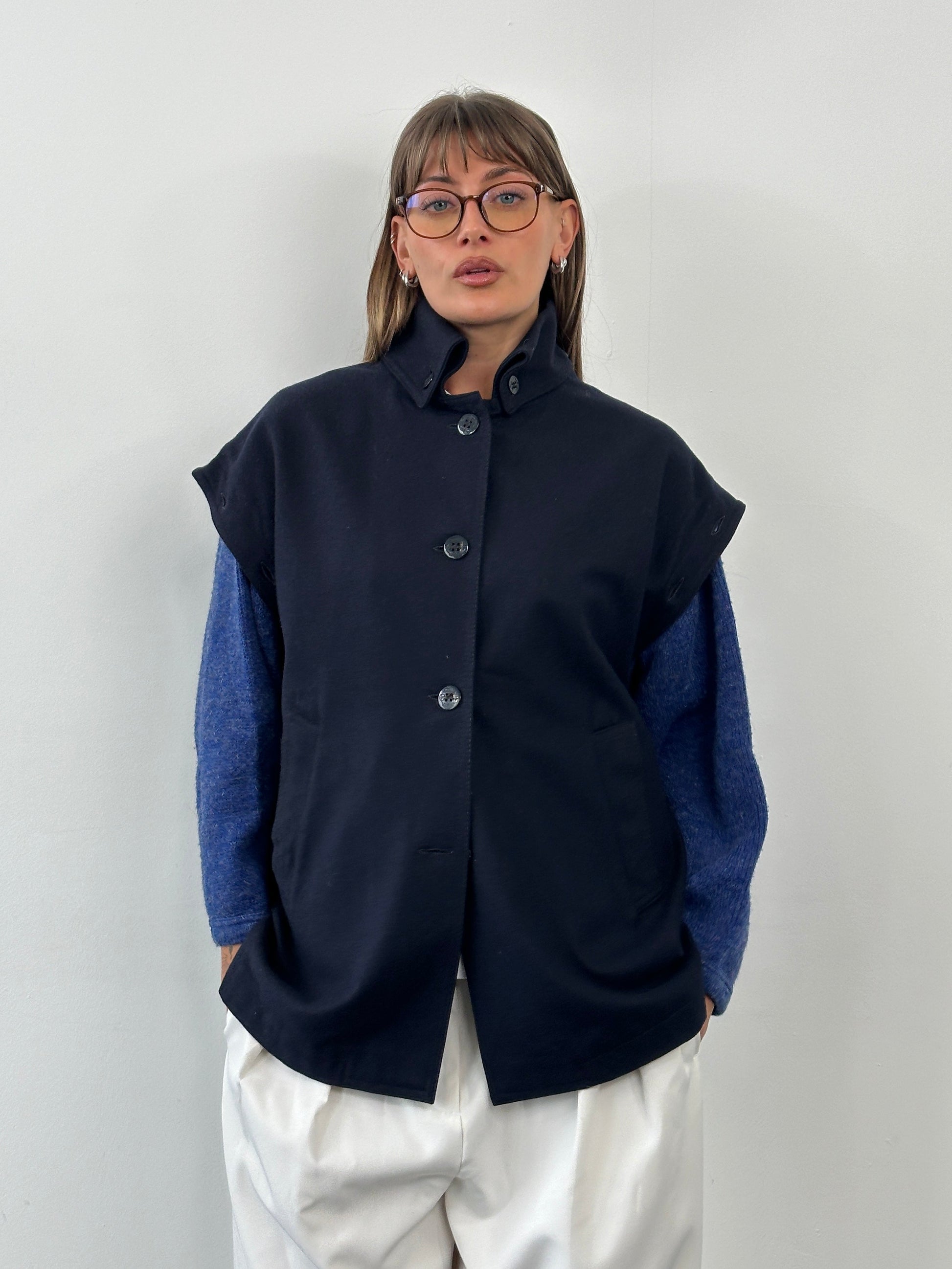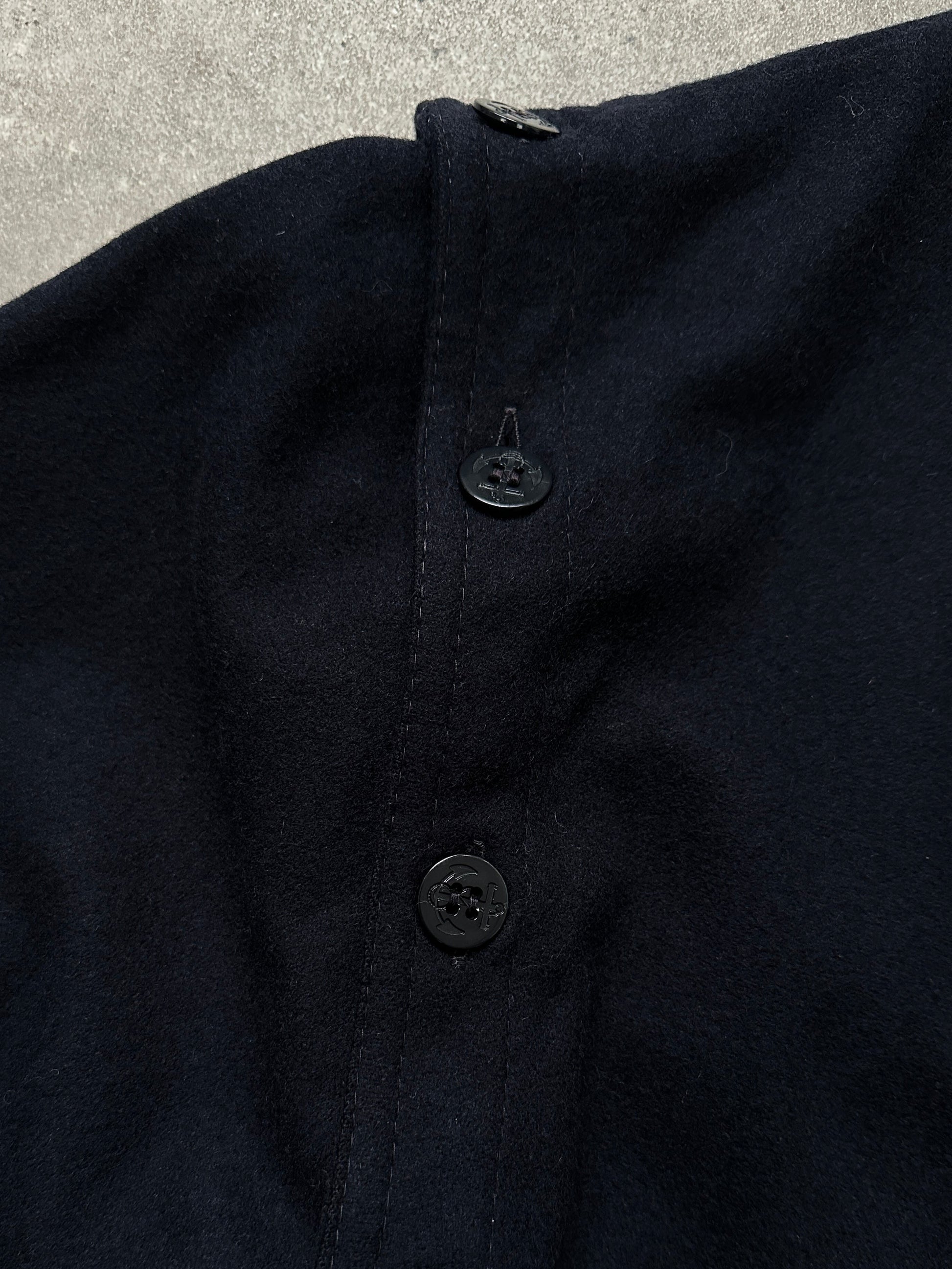 Vintage 1990s navy wool jacket by Groggy featuring removable sleeves for versatile wear. Crafted in Italy from a structured double faced wool blend with a utilitarian silhouette, finished with a stand collar and button front fastening, allowing the piece to be worn as a jacket or vest.