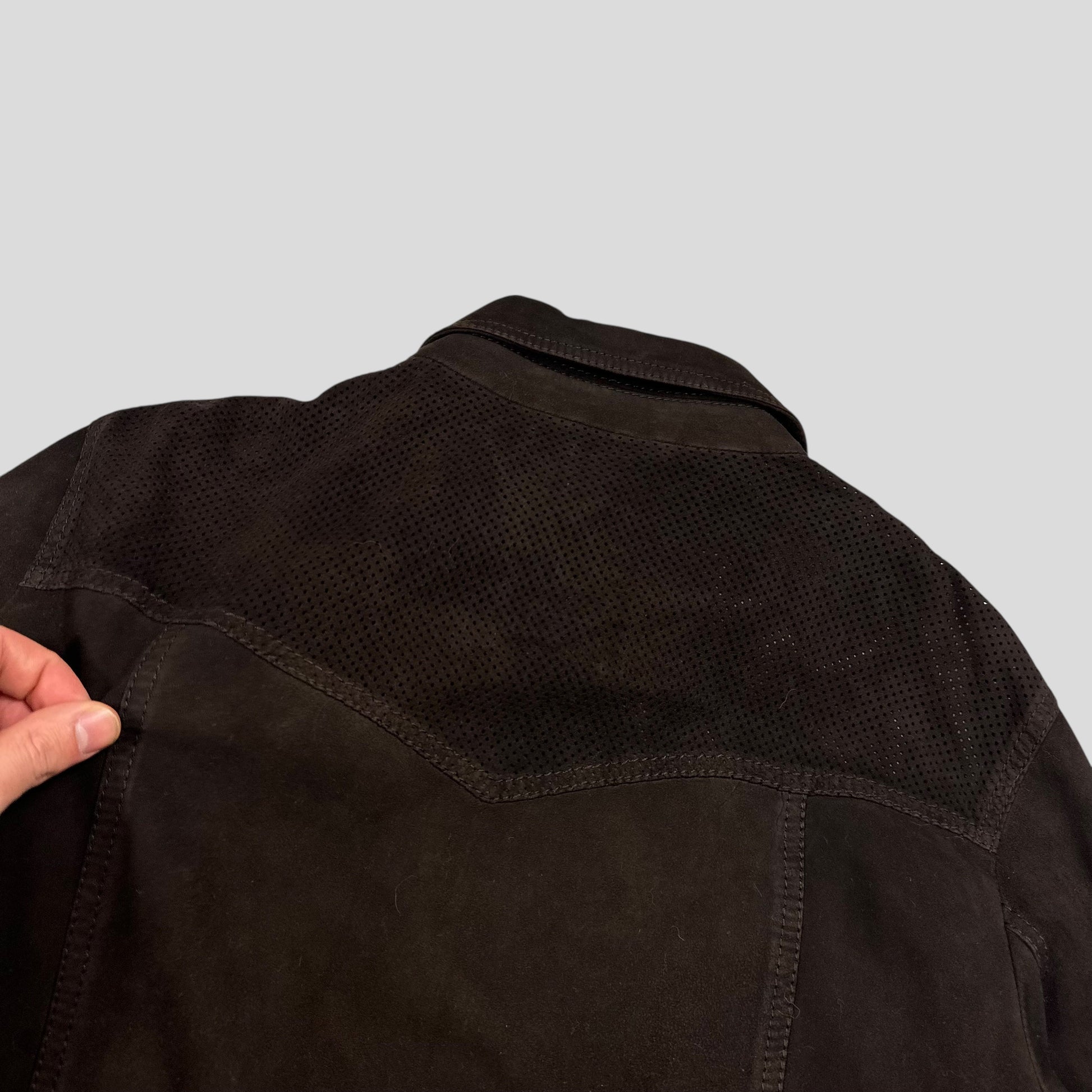 Extremely rare Prada Sport fall winter 2006 brown suede leather jacket, western cowboy style Harrington with a beautiful boxy fit, embossed western style logo to arm, leather logo tab to hip and zip at the collared neck, incredible perforated semi transparent leather mesh to chest and back, pointed panels adding to that cowboy feel.