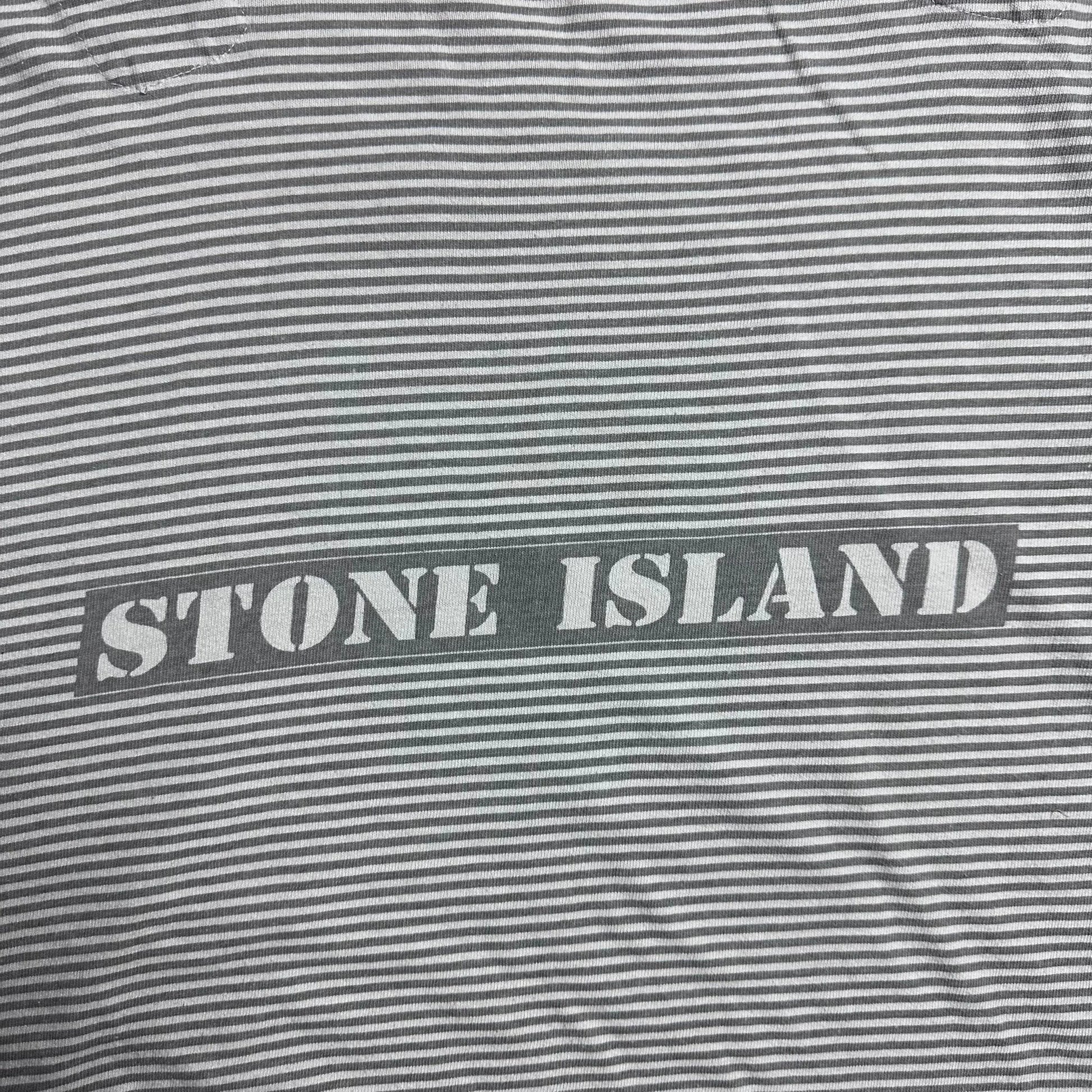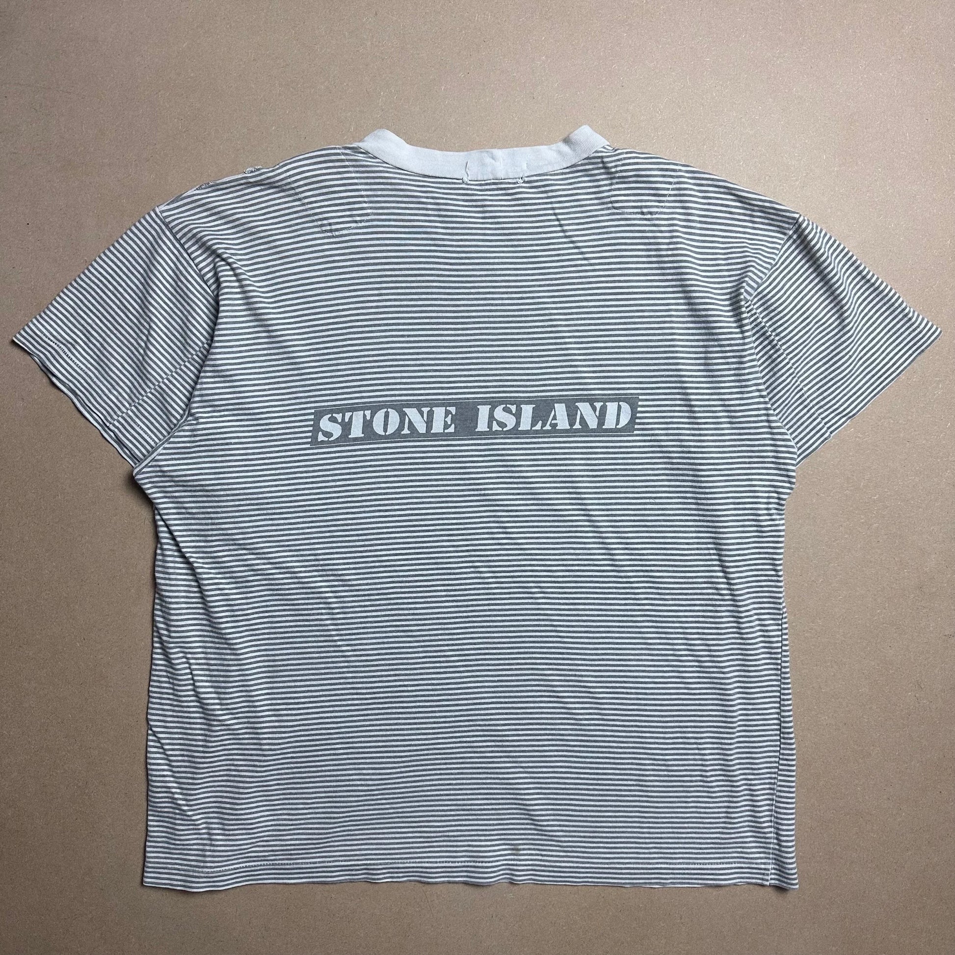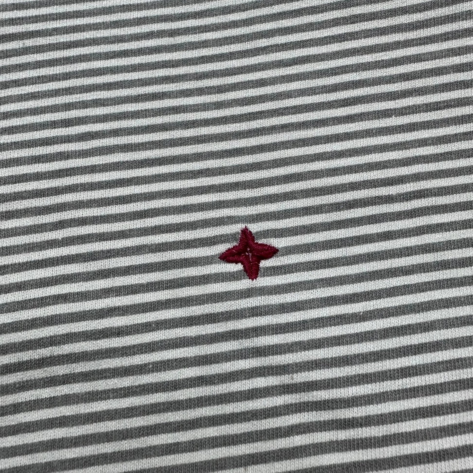Designed by Massimo Osti. Steel grey colour way. Pigment print striping with a contrast collar. Mini red embroidered compass to front. Large box logo stencil spell out to back. Breton style construction.