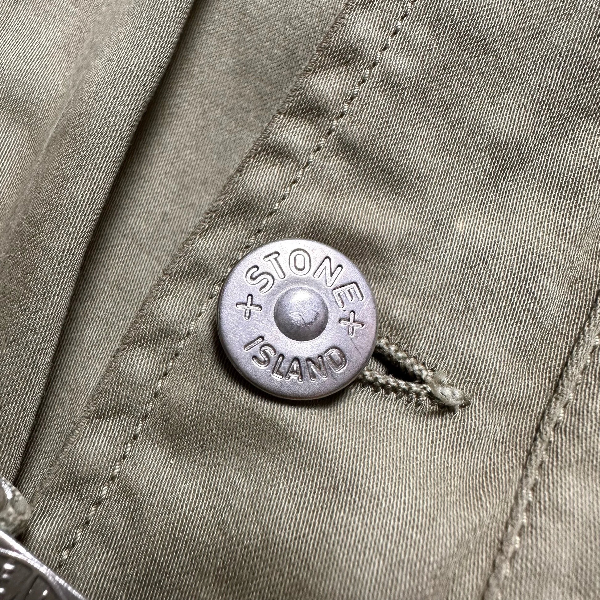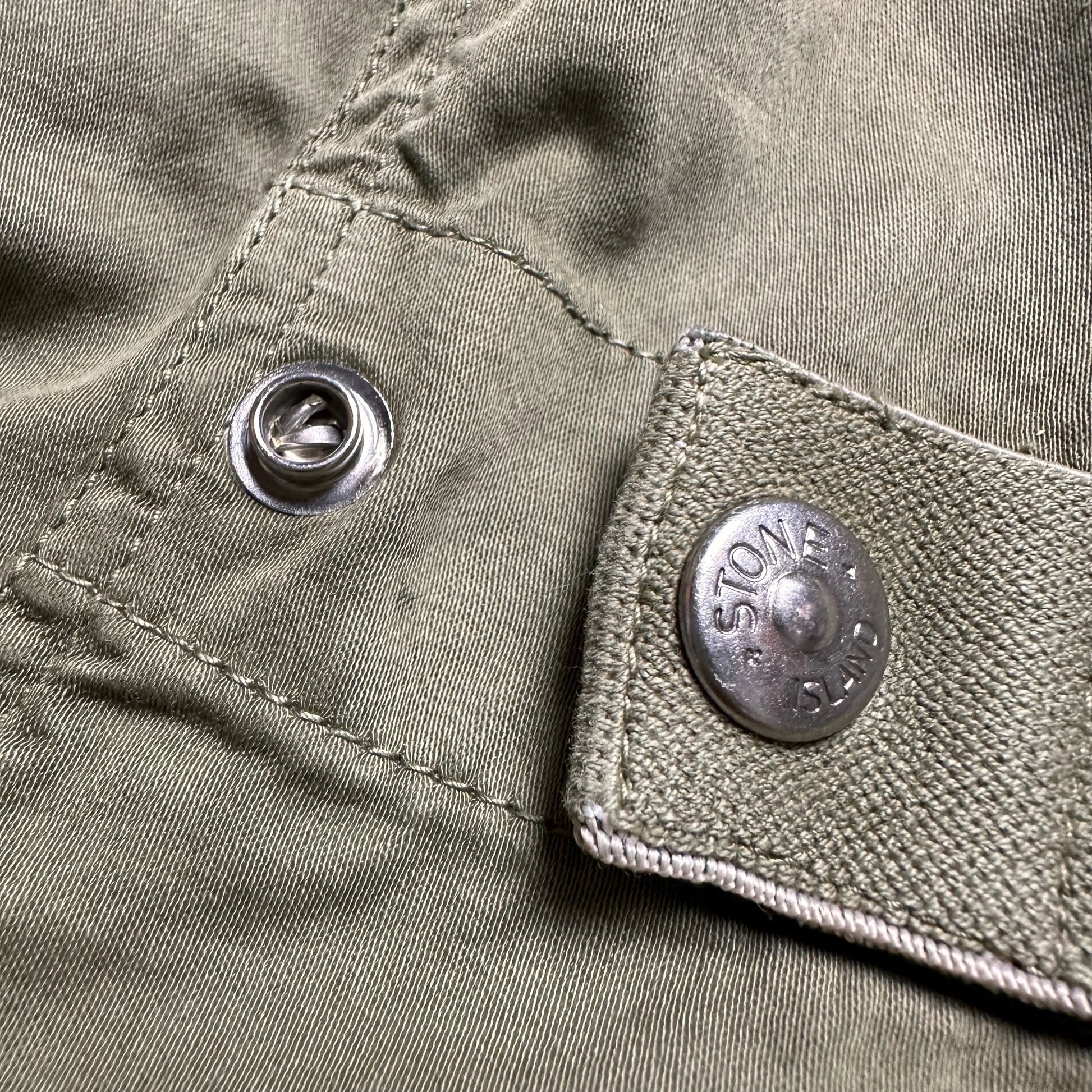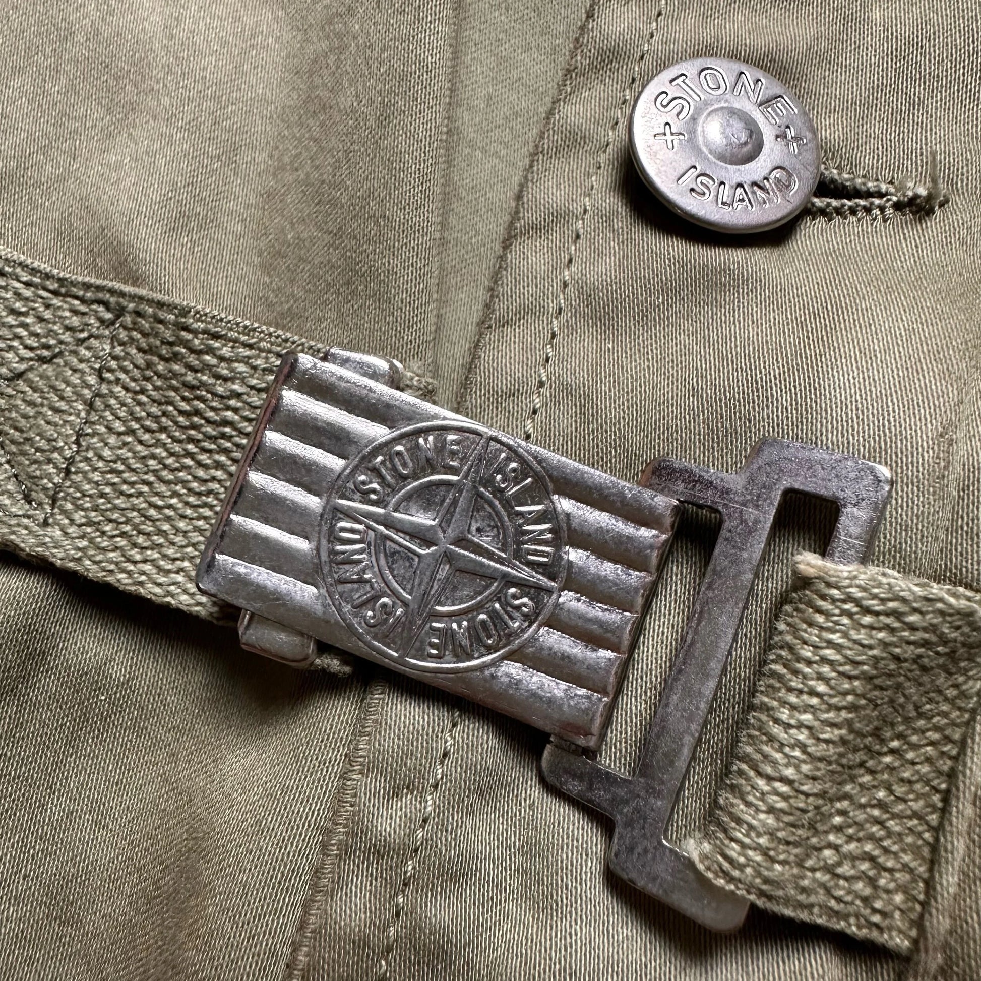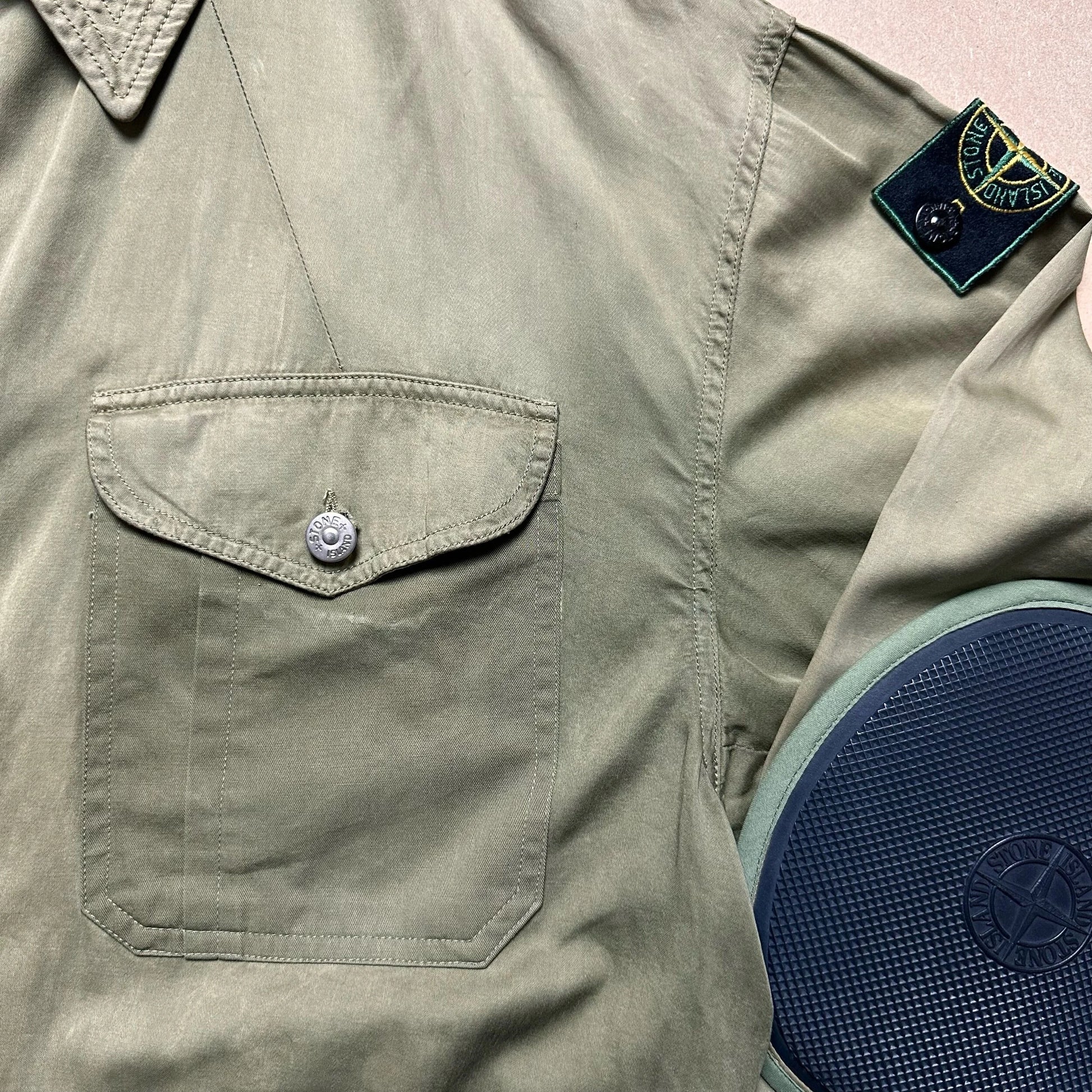 Designed by Massimo Osti. Raso Gommato satin based military cotton. Three pocket with one push through button flap closure, and two flap closure cargo pockets with elastic hem. Button down and full zip fastening. Embossed compass branded clip across centre front for added fastening. Vulcanised rubber elbow and shoulder patches. External back waist fastening for waist fastening.