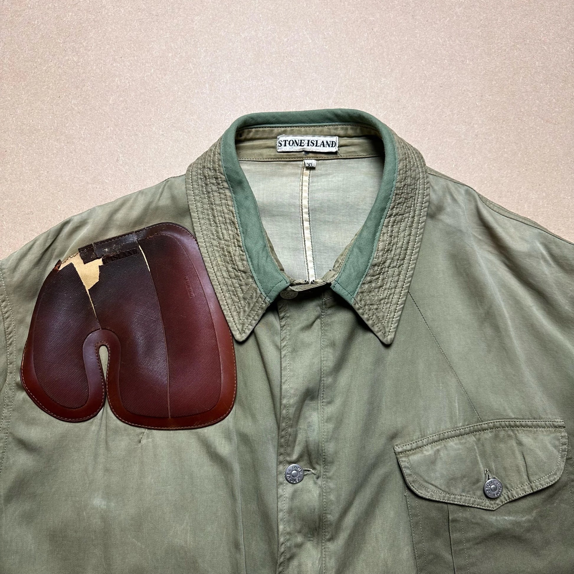 In a worn vintage condition. Some small raso marks throughout and some fading creating a great patina. Some cracking on the shoulder shooting patch. No holes or rips.