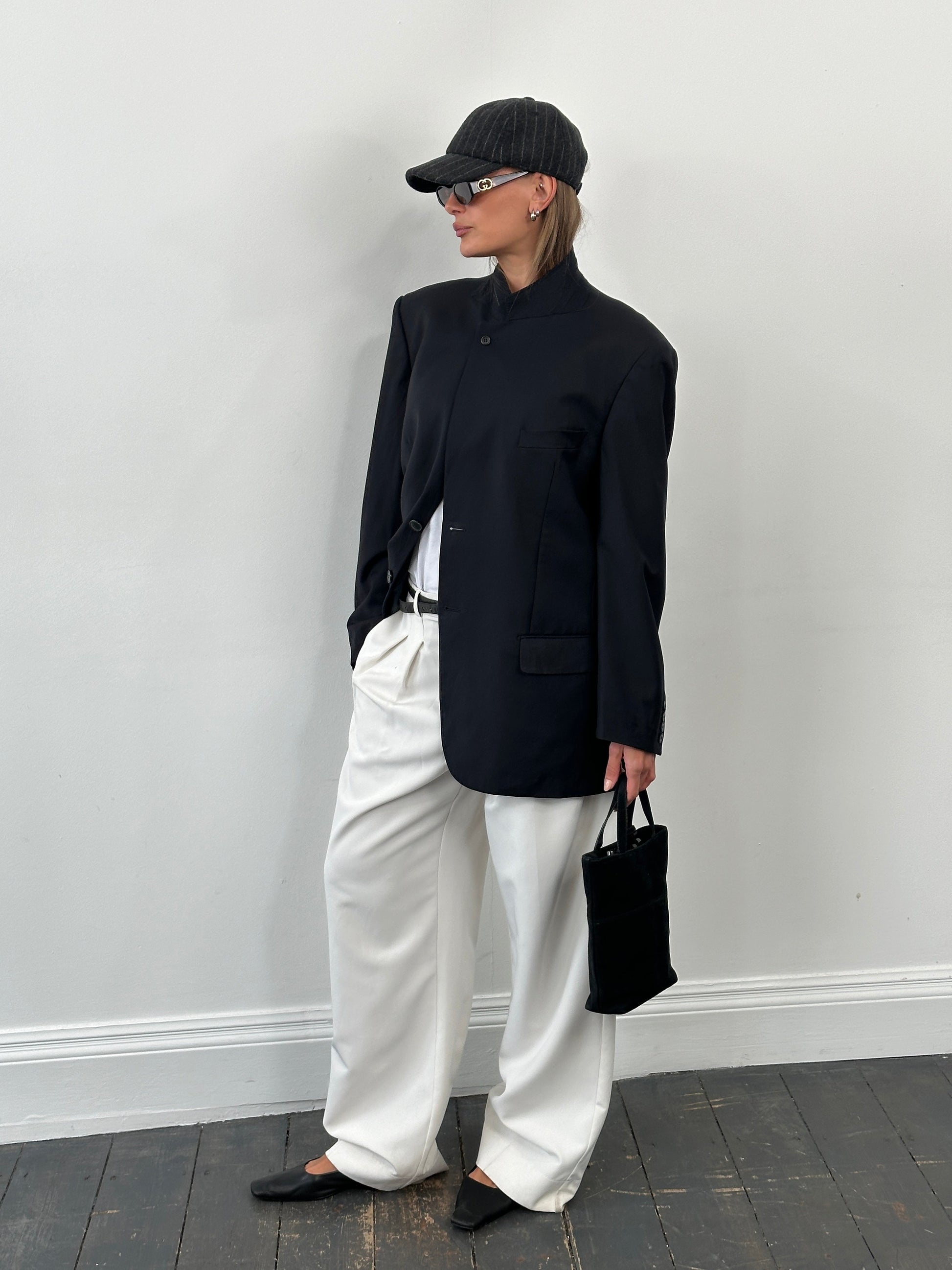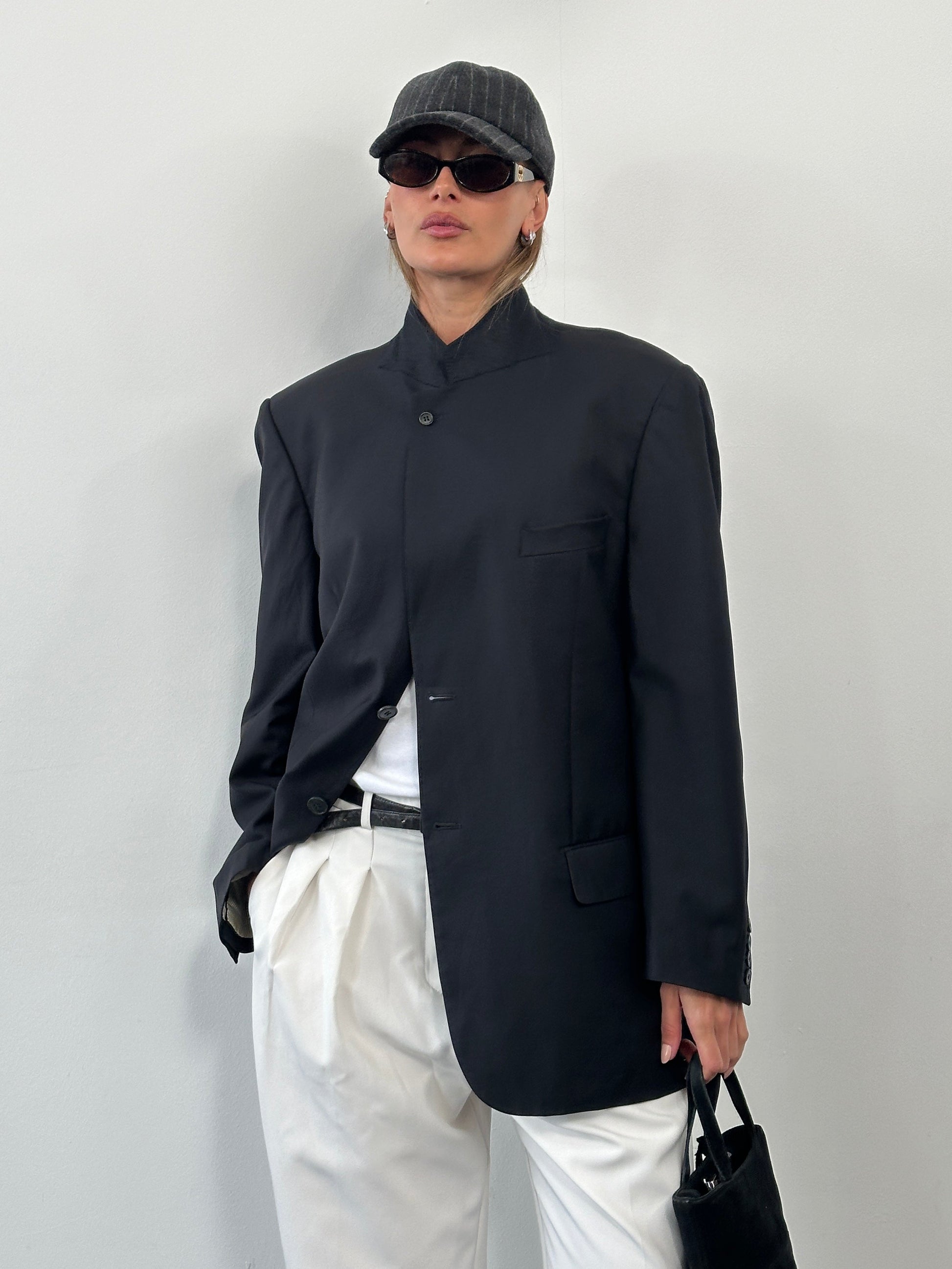 Su Misura by Dalston & Forsythe single breasted blazer made using Loro Piana Tasmanian Super 120’s wool, featuring a high neck button fastening and clean minimal front. Structured tailored silhouette typical of the 2000s.