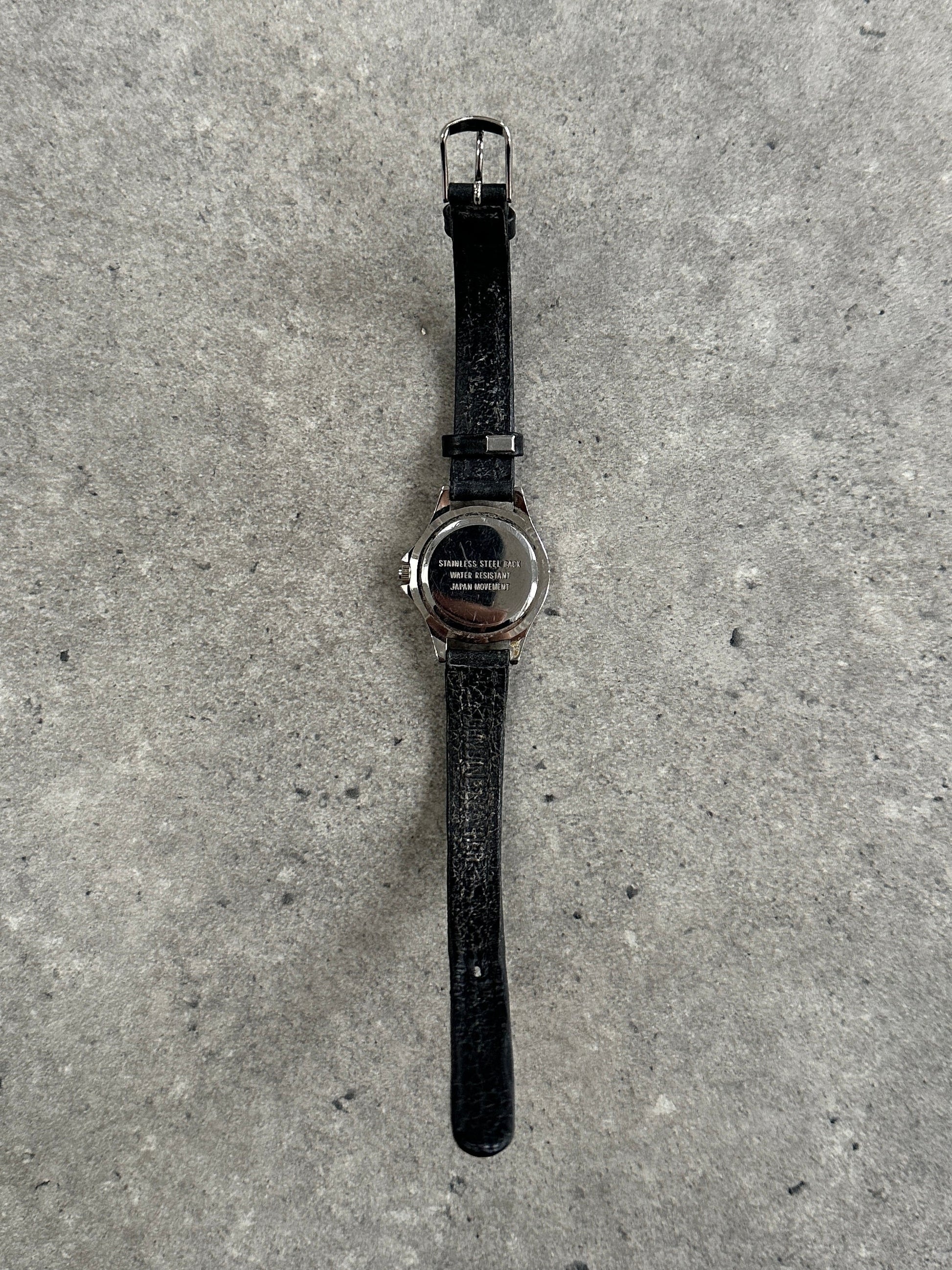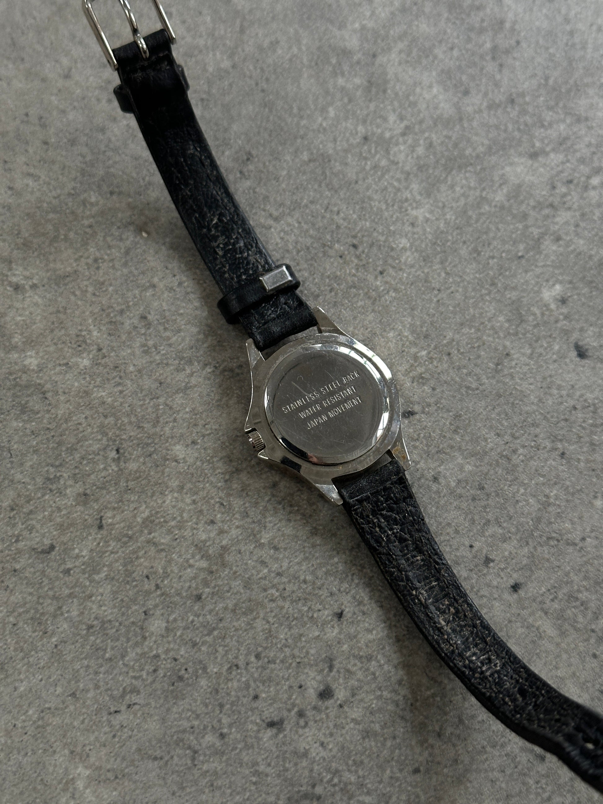 Minimal 1990s Japan made quartz watch featuring a silver tone case, black strap and date window.