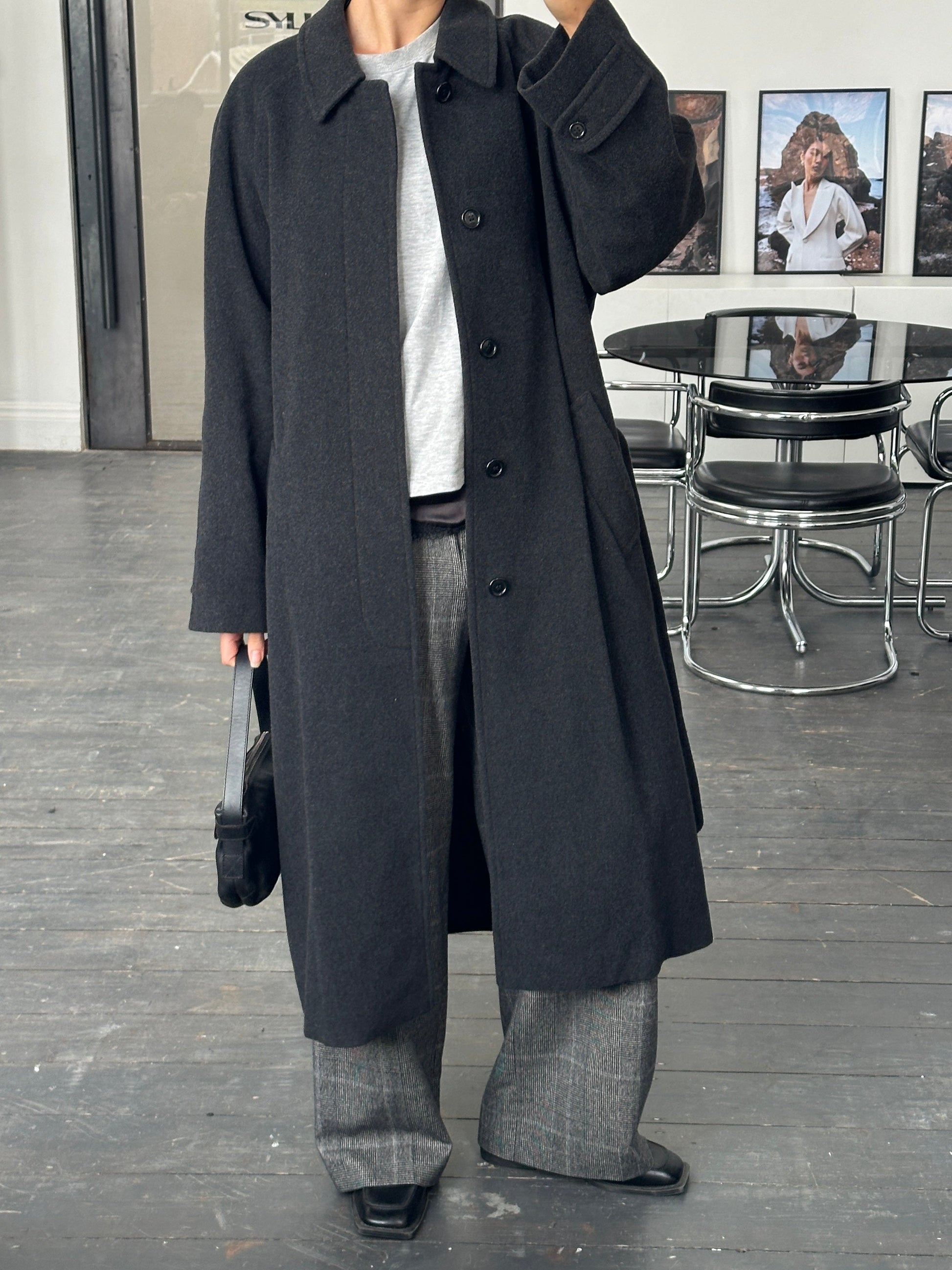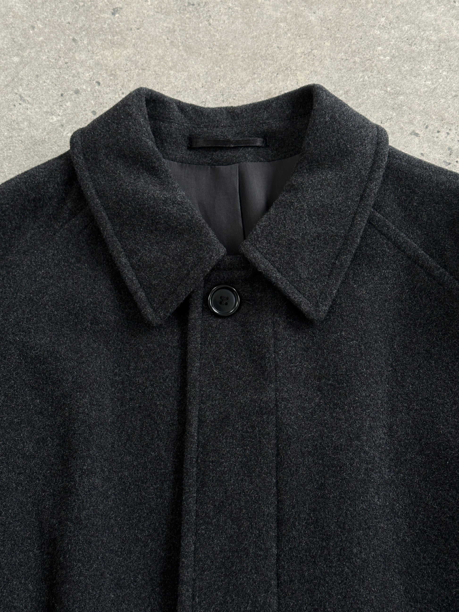 Vintage 1990s wool and cashmere belted coat, designed in Italy by Carlo Bellucci, blending refined tailoring with a soft brushed finish.