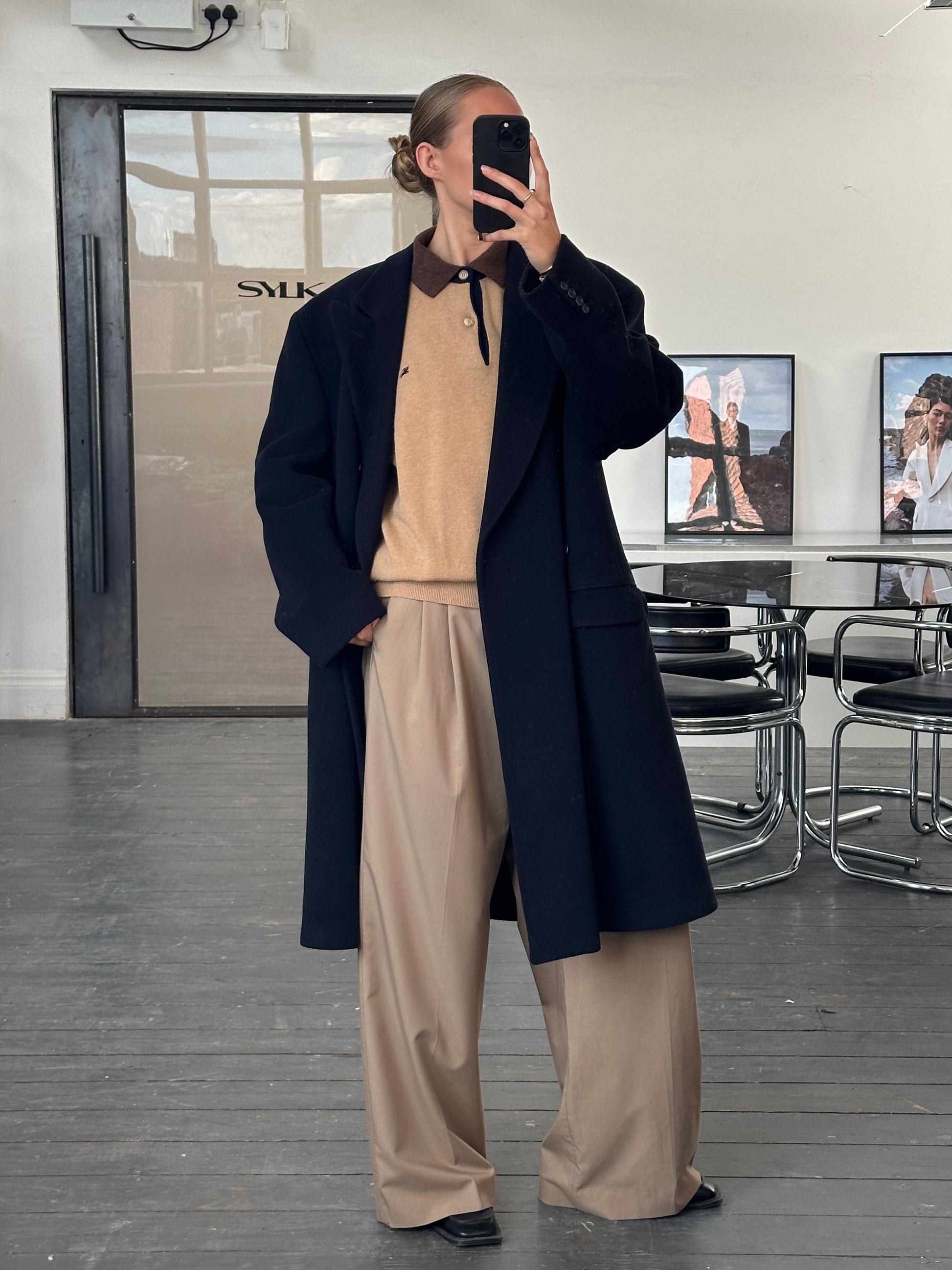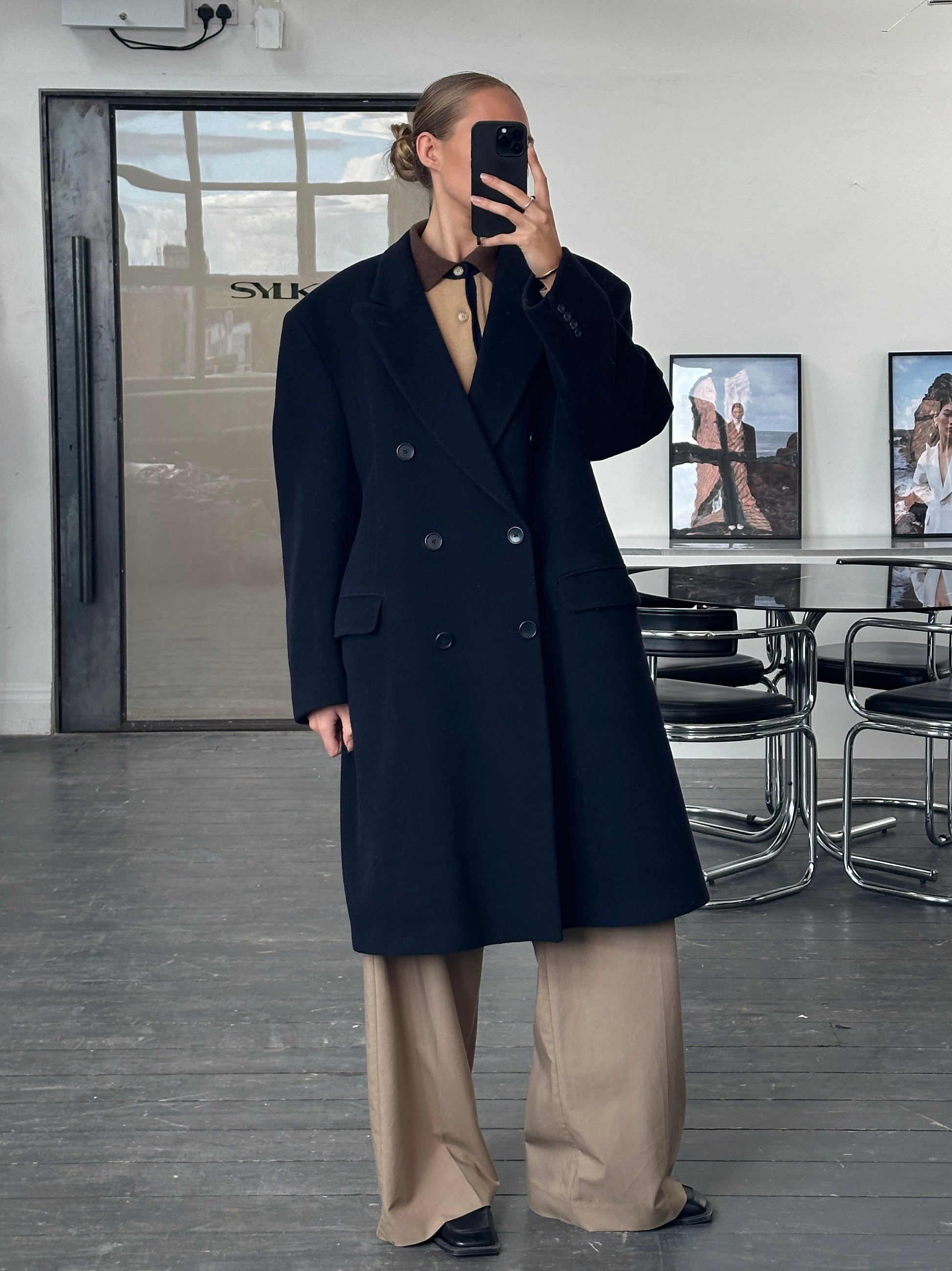 Vintage 1990s refined British wool and cashmere double breasted coat - tailored in England with a structured yet relaxed silhouette.