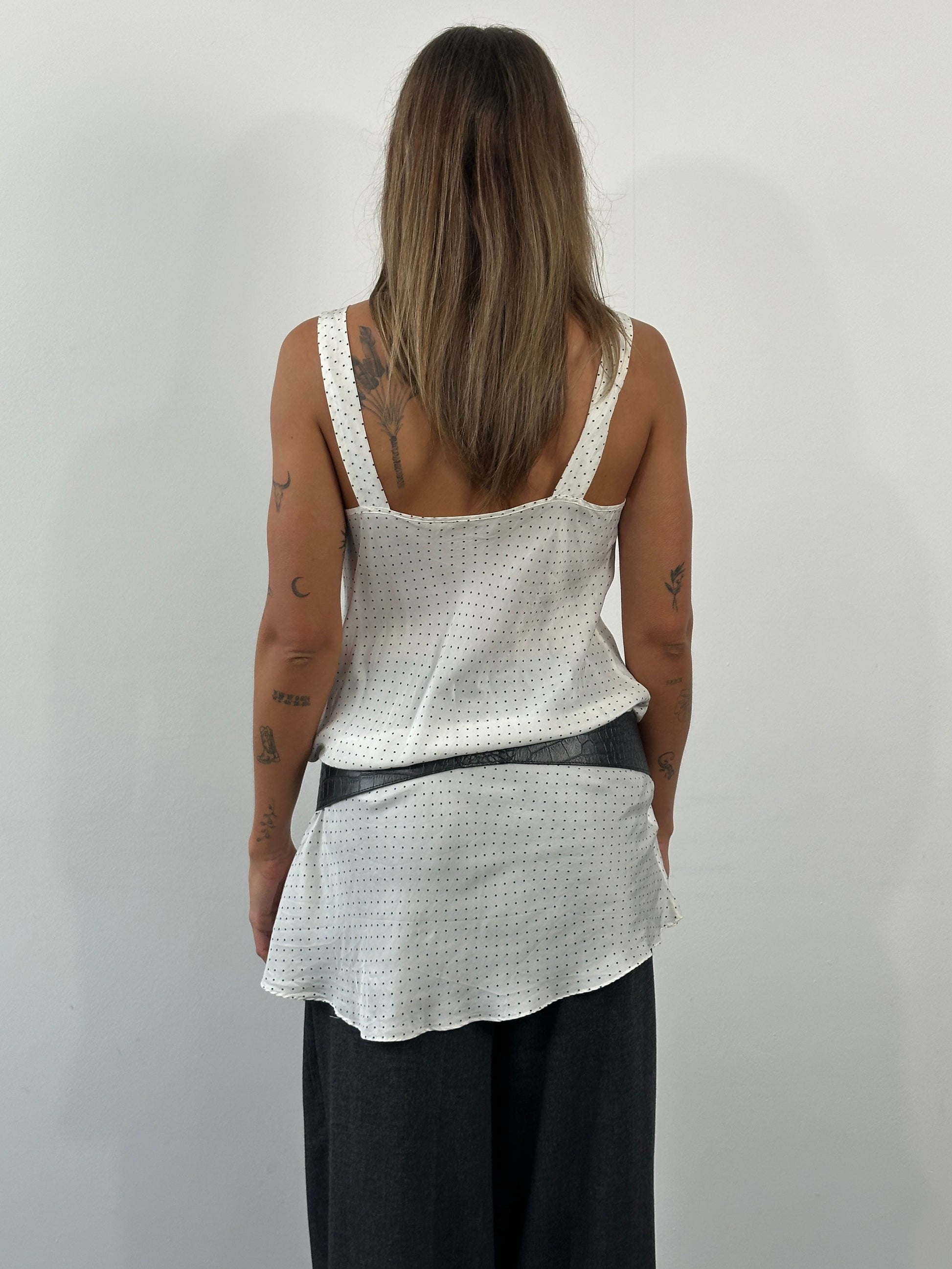 Vintage off white pure silk 1990s slip dress with subtle black polkadot print. Cut with a soft V neckline, wide straps and a fluid bias style drape that skims the body for an understated minimalist silhouette.